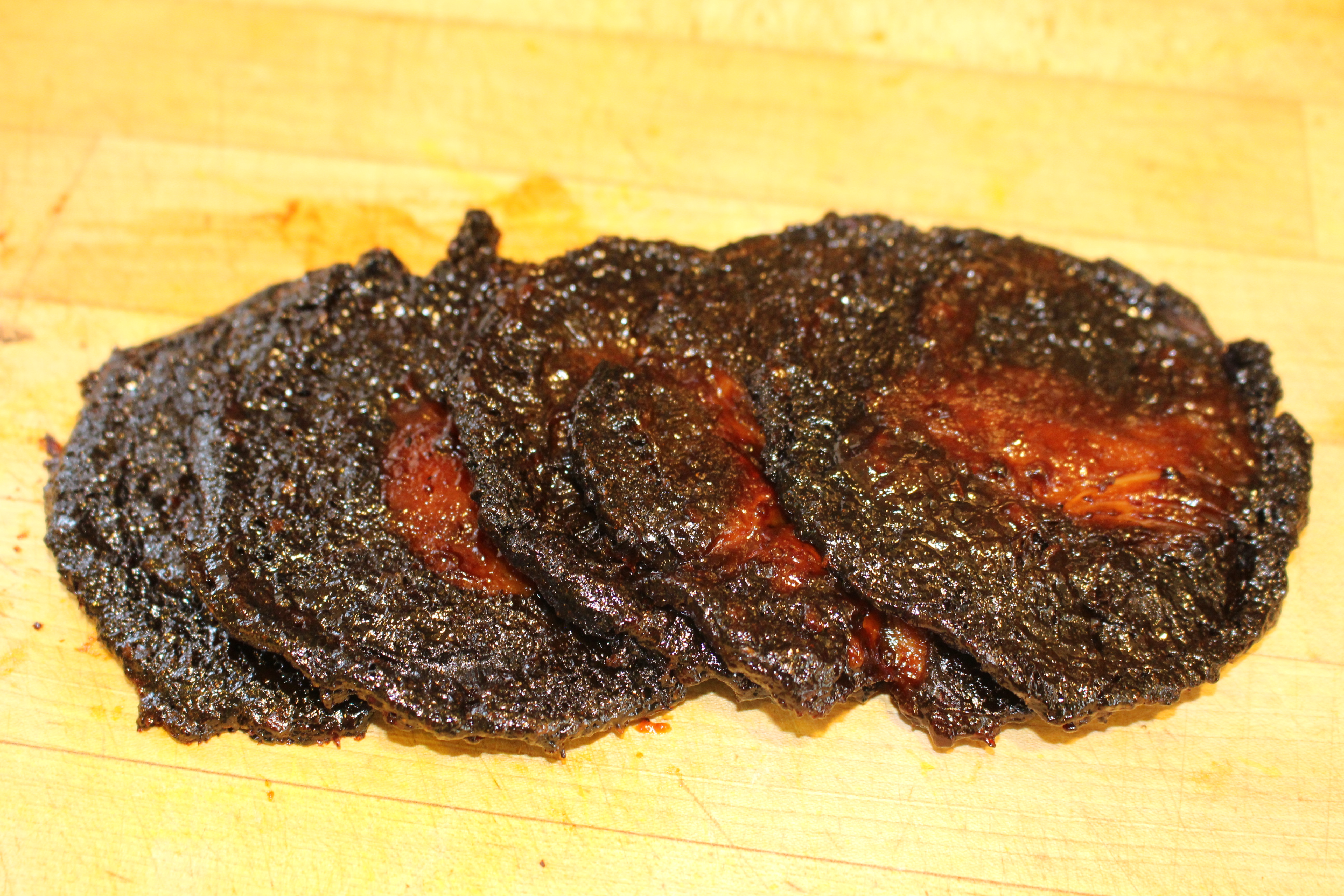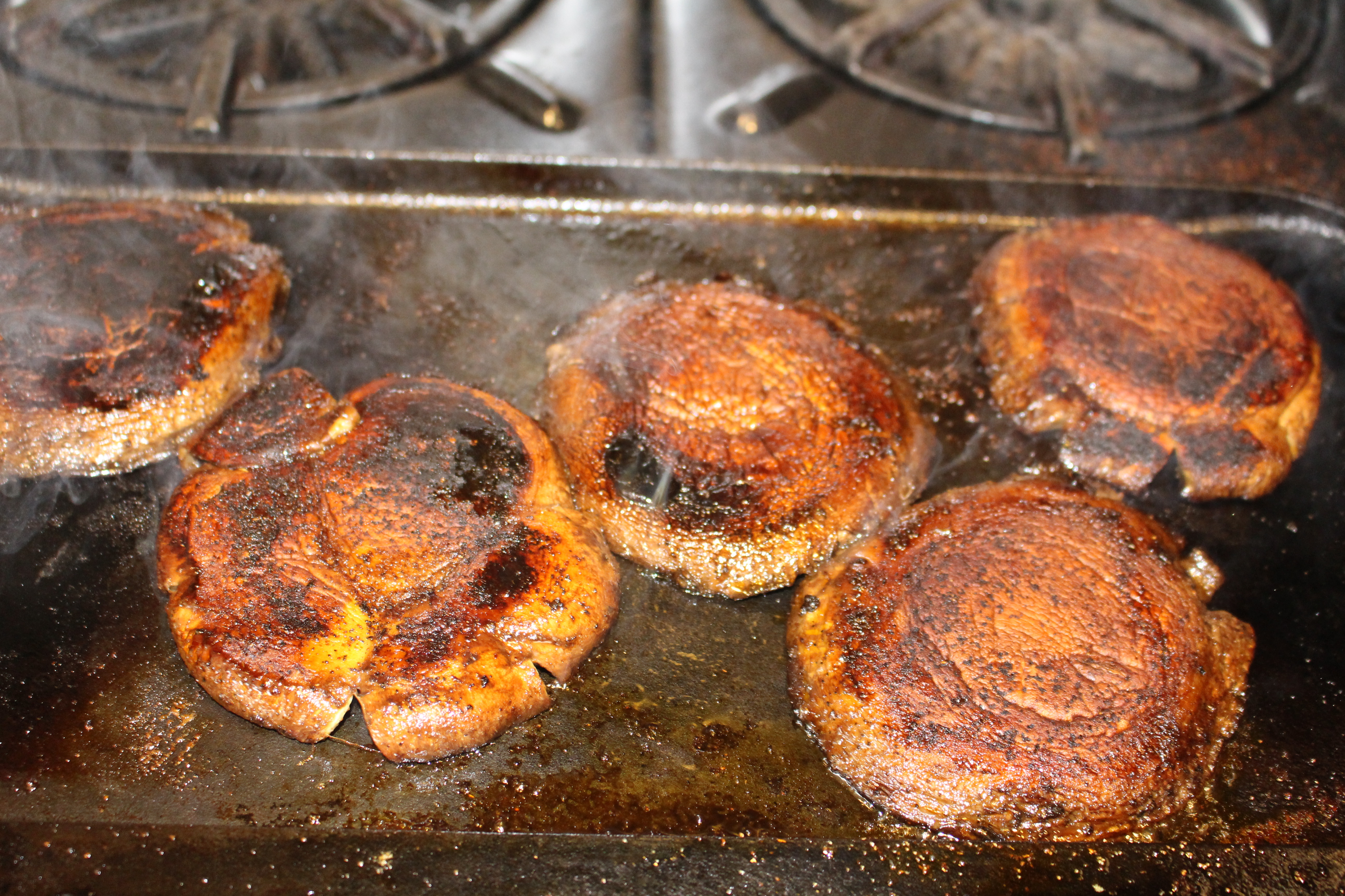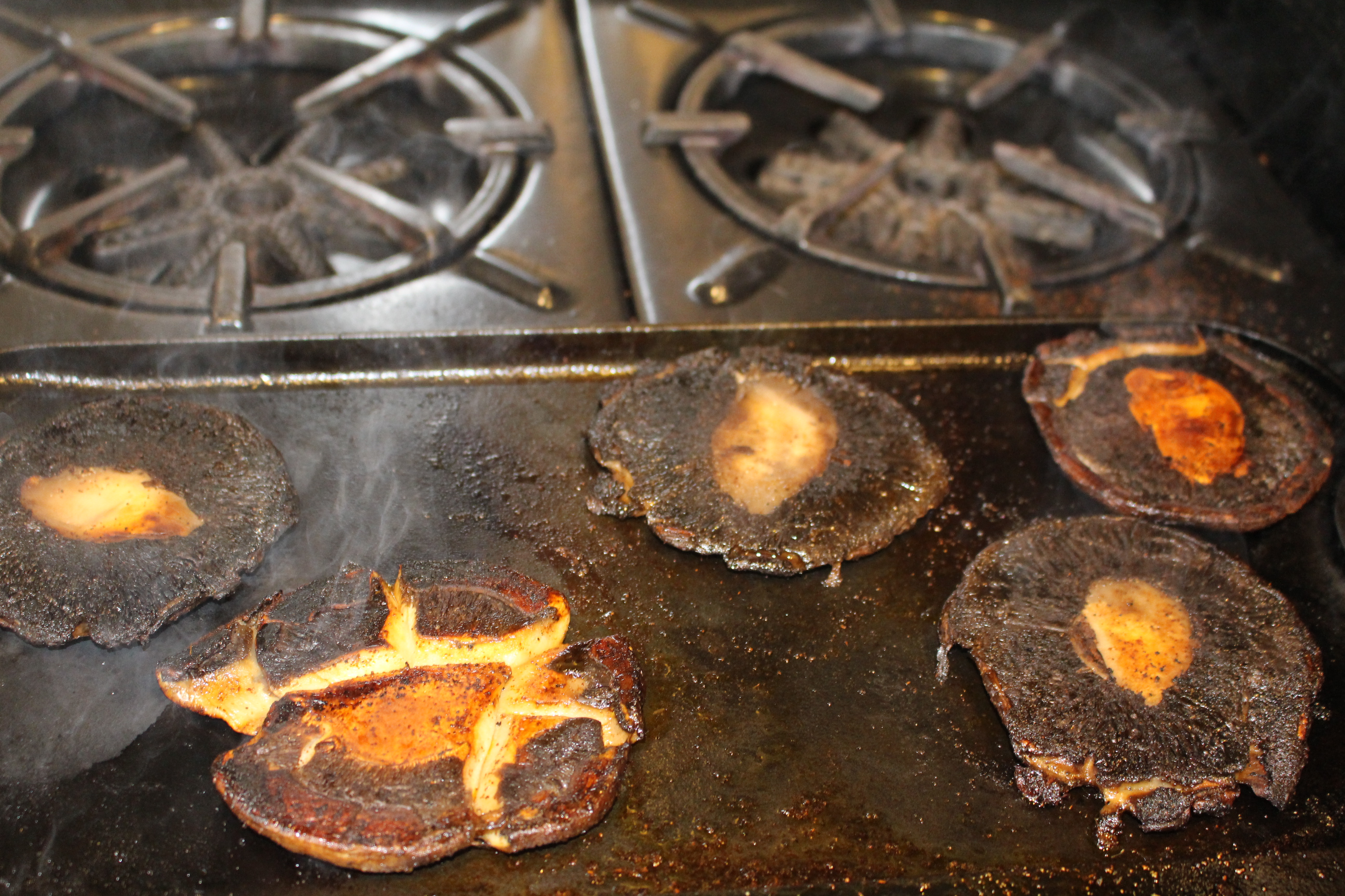 Sauté the mushrooms on a hot griddle, in a little olive oil, cap facedown, with another heavy pan on top. Let it cook, undisturbed for 3 minutes, adjusting the heat so it doesn’t burn. Turn mushrooms over, and sprinkle the cooked side with the spices, and place the weight back on the mushrooms to cook the other side. Cook undisturbed for another 3 minutes or so, until browned. Turn over, and sprinkle this side with the spices. Repeat the cooking process, with the heavy weight on top, 3 more times, until the mushrooms are flattened down and the texture is firm. Remove from pan.