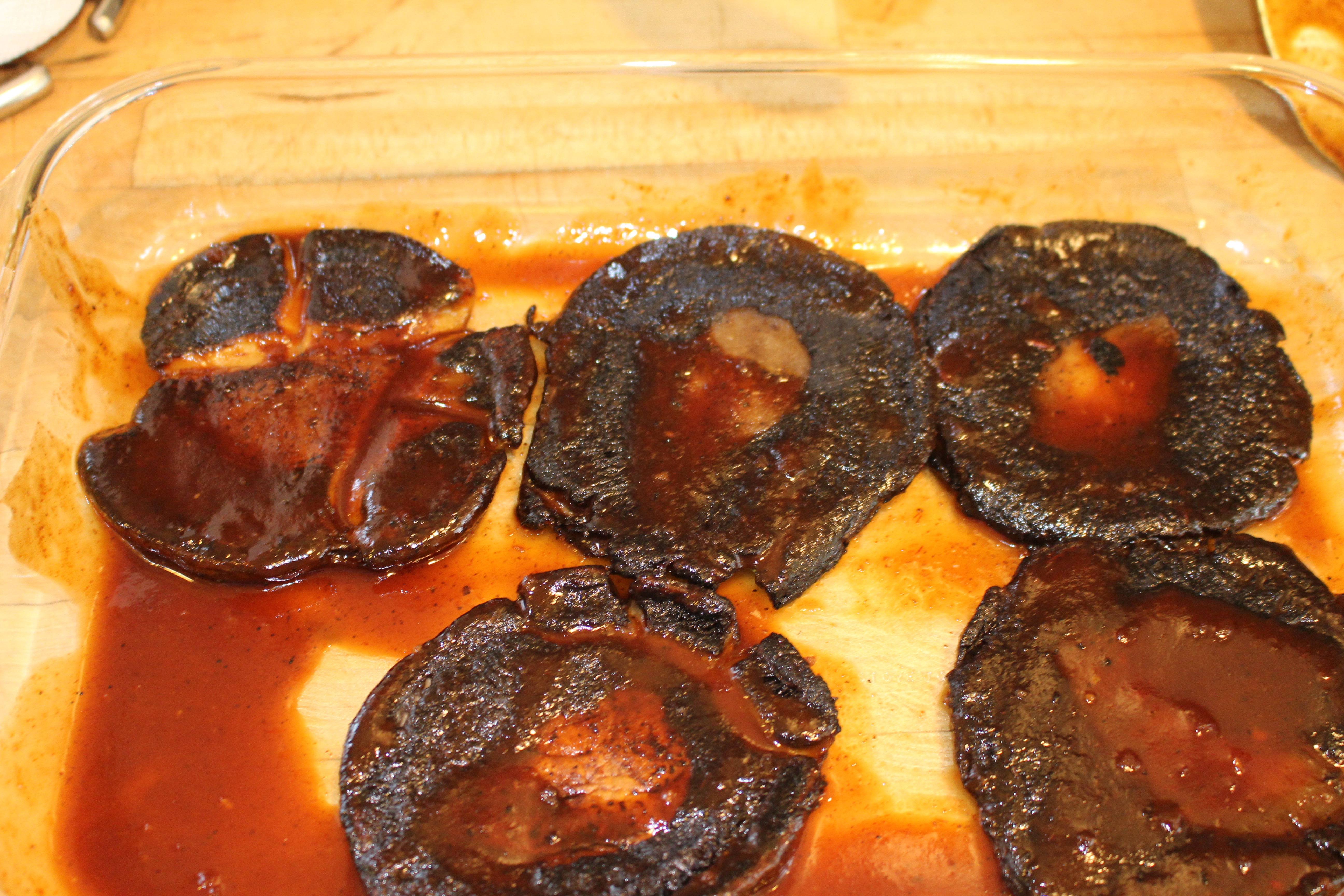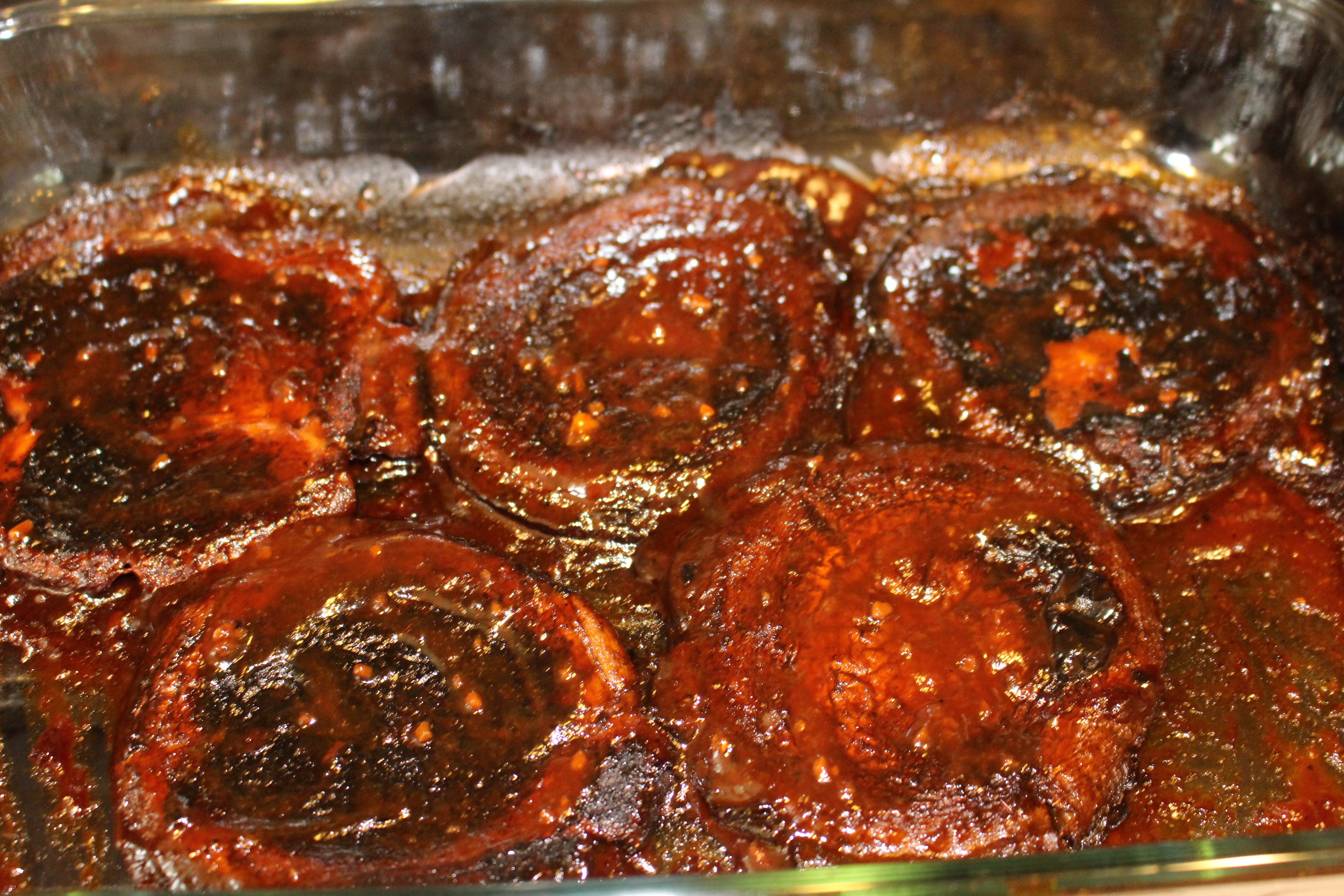 Marinate the mushrooms in BBQ sauce. Cover the bottom of a glass Pyrex casserole pan with the BBQ sauce of your choice. Place the cooked mushrooms into the casserole pan with the BBQ sauce. Turn the mushrooms over, so both sides are covered with the marinade, and let sit for 1 hour.