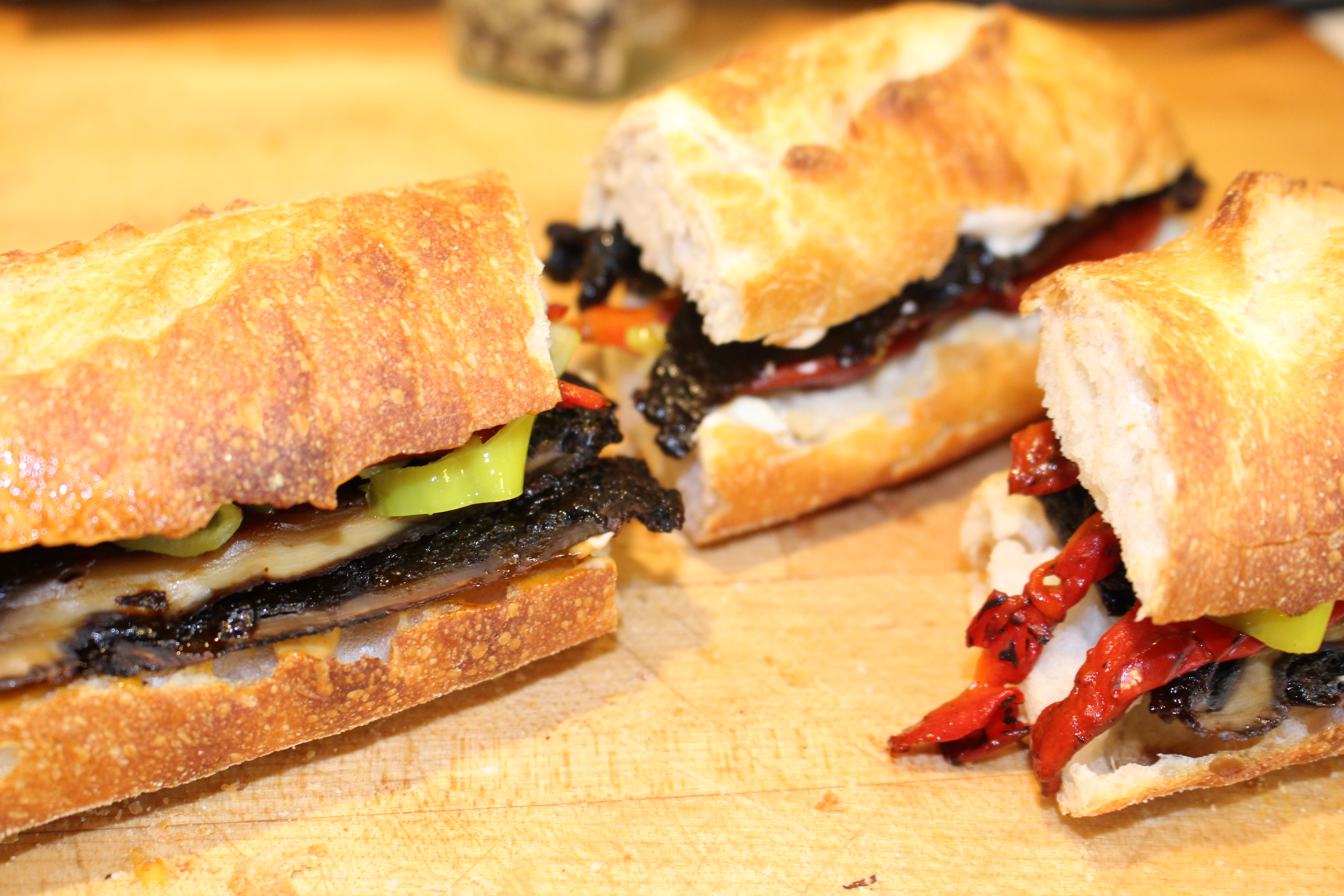 Slice the mushrooms on the diagonal, and build your sandwiches. I used Just Mayo, (vegan mayo or chipotle mayo) roasted red peppers, (that I warmed up on the griddle) pickles, pepperoncinis, and arugula.