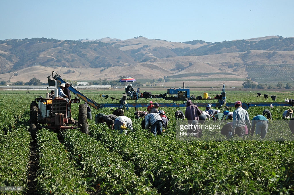 Migrant farm workers harvesting yellow bell peppers near Gilroy, California. Crews like this may include illegal immigrant workers as well as members of the United Farm Workers Union founded by Cesar Chavez.