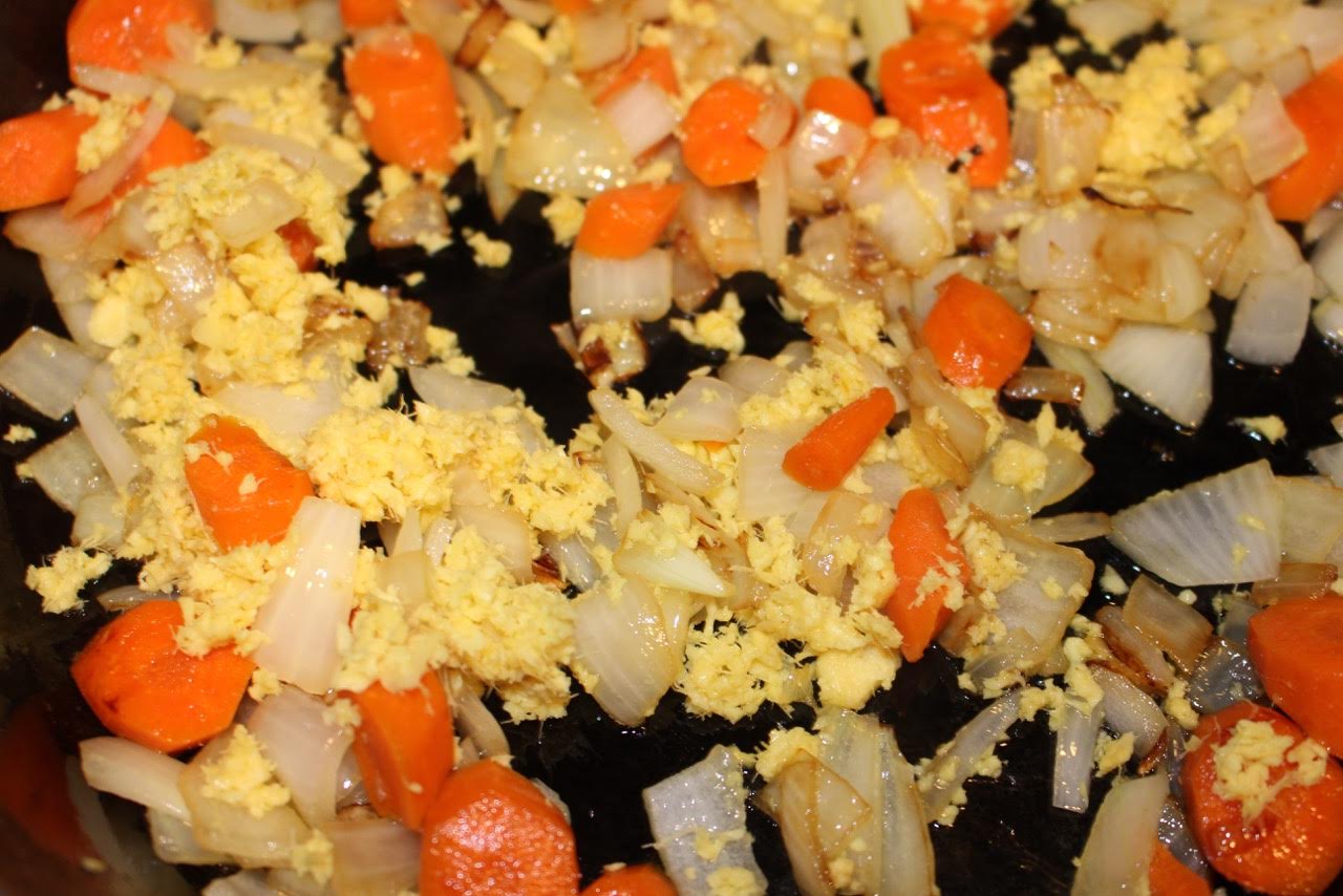 2. Meanwhile, sauté the onions, carrots and celery in the coconut oil, with the ginger and garlic, for about 10 minutes, until soft.