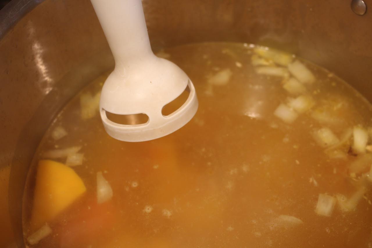 6. With an immersion blender, purée the squash and vegetables until smooth.