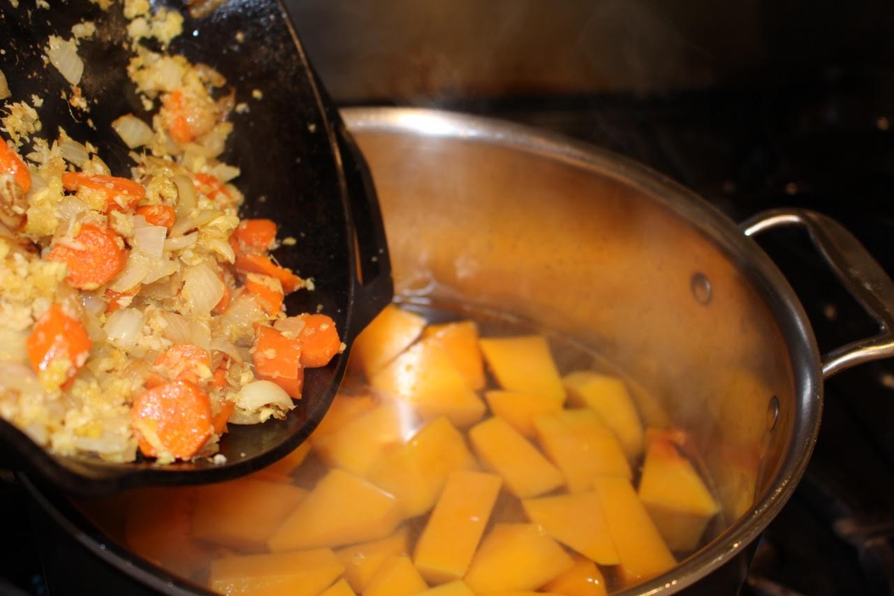 1. In large pot, bring 16 cups of water to a boil with the butternut squash in it.