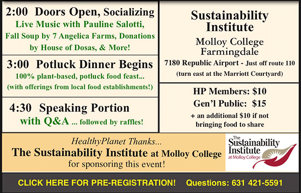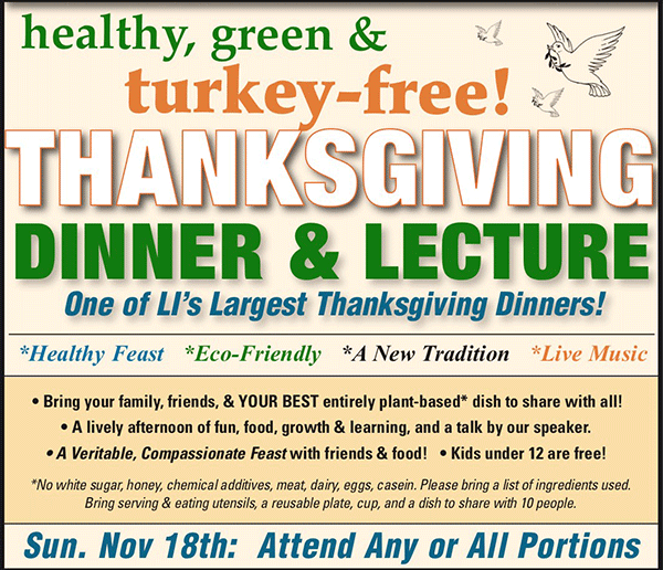 Join the Sustainability Institute of Molloy College for their annual Healthy, Green & Turkey-Free Thanksgiving Dinner and Lecture on Sunday, November 18th starting at 2:00pm.