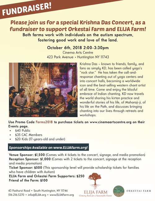Gather at the Cinema Art Centre in Huntington for a very special Krishna Das Concert, as a fund raiser to support Orkestai Farm and Elija Farm. Both farms work with young people on the spectrum, fostering good work and love of the land.
