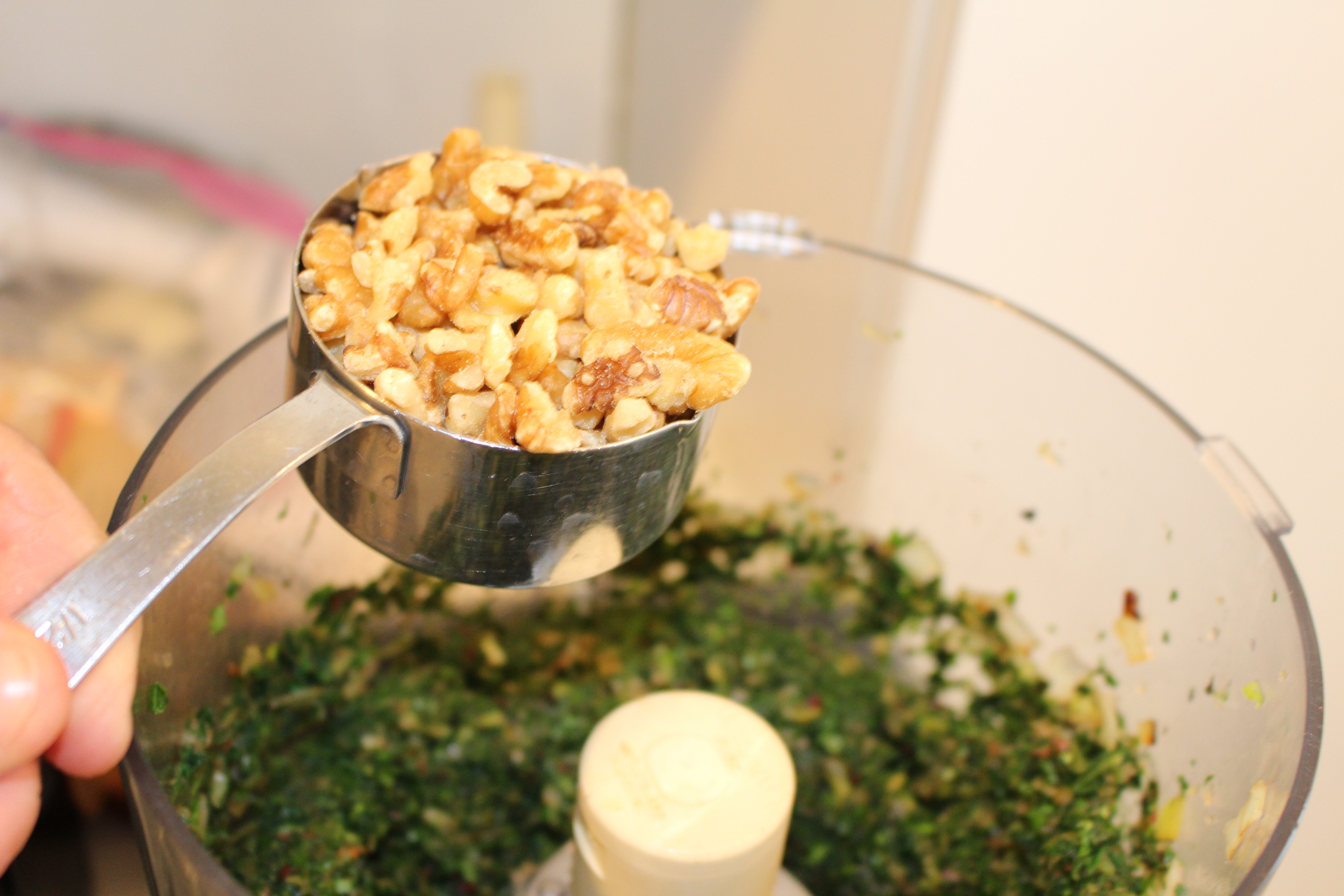 5. Add the garlic, walnuts, sautéed onions & celery, and cilantro and pulse until smooth puree remains, wiping down sides as needed.