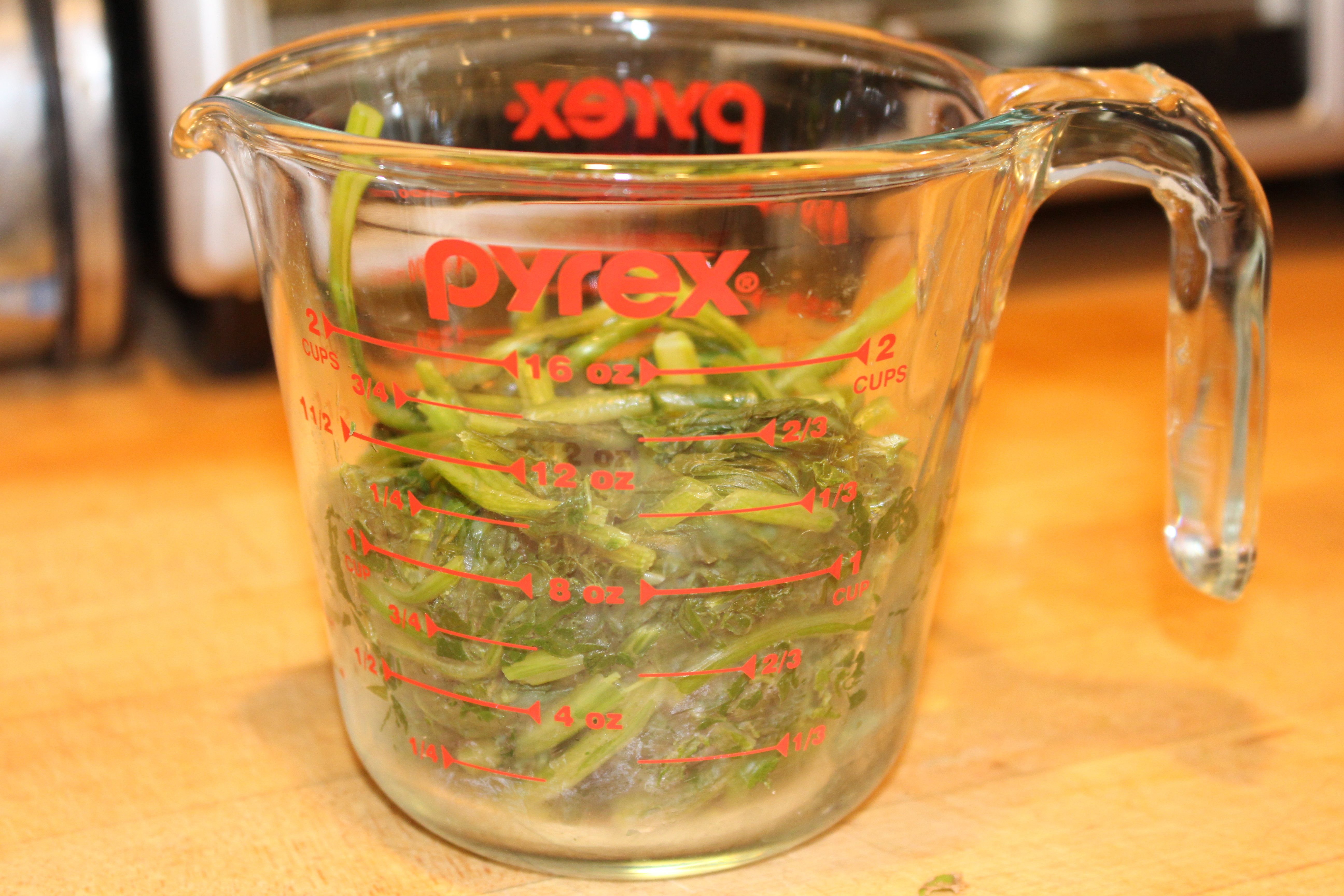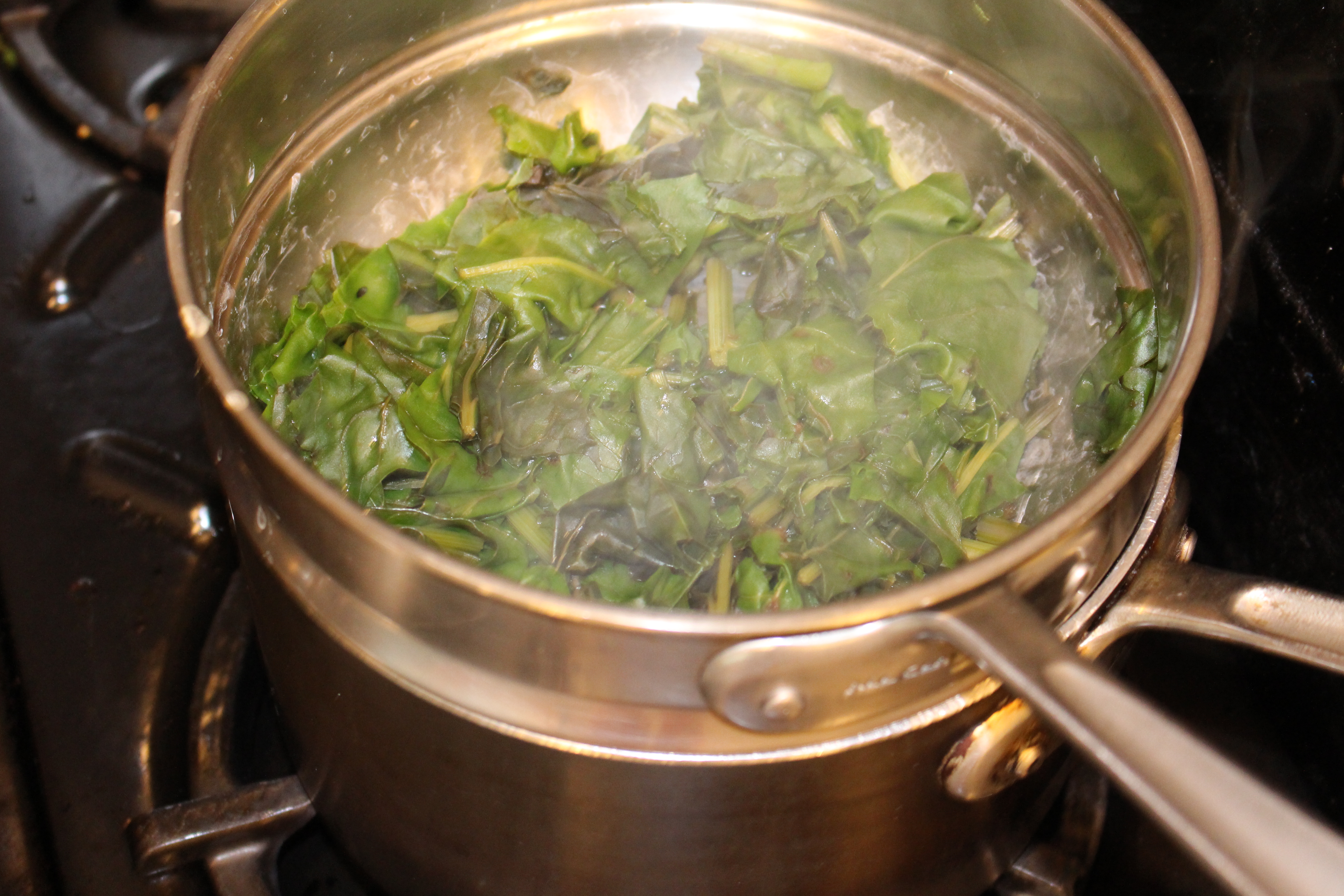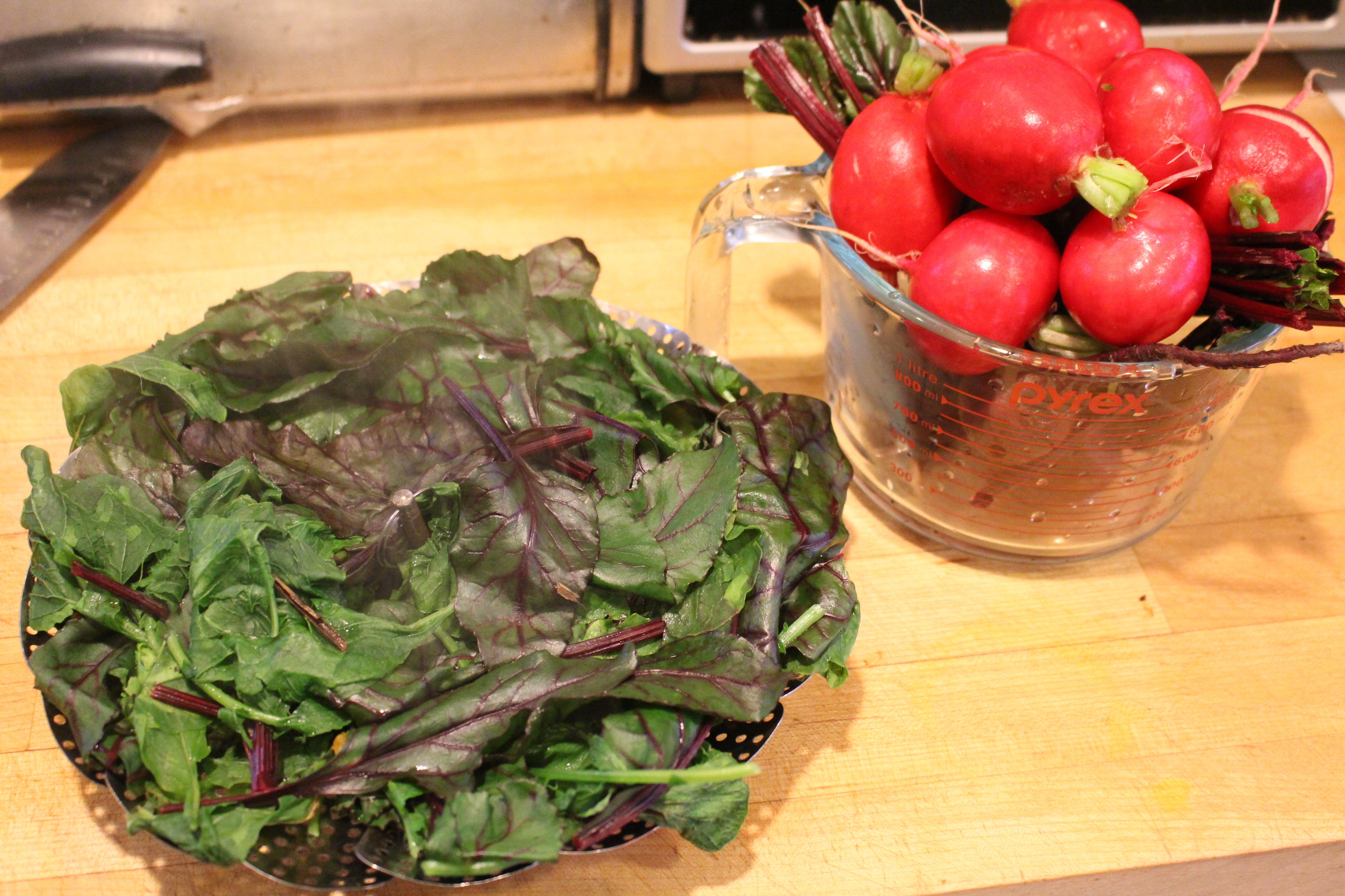 - Steam radish tops above 1” of water for 5 minutes. Let cool.