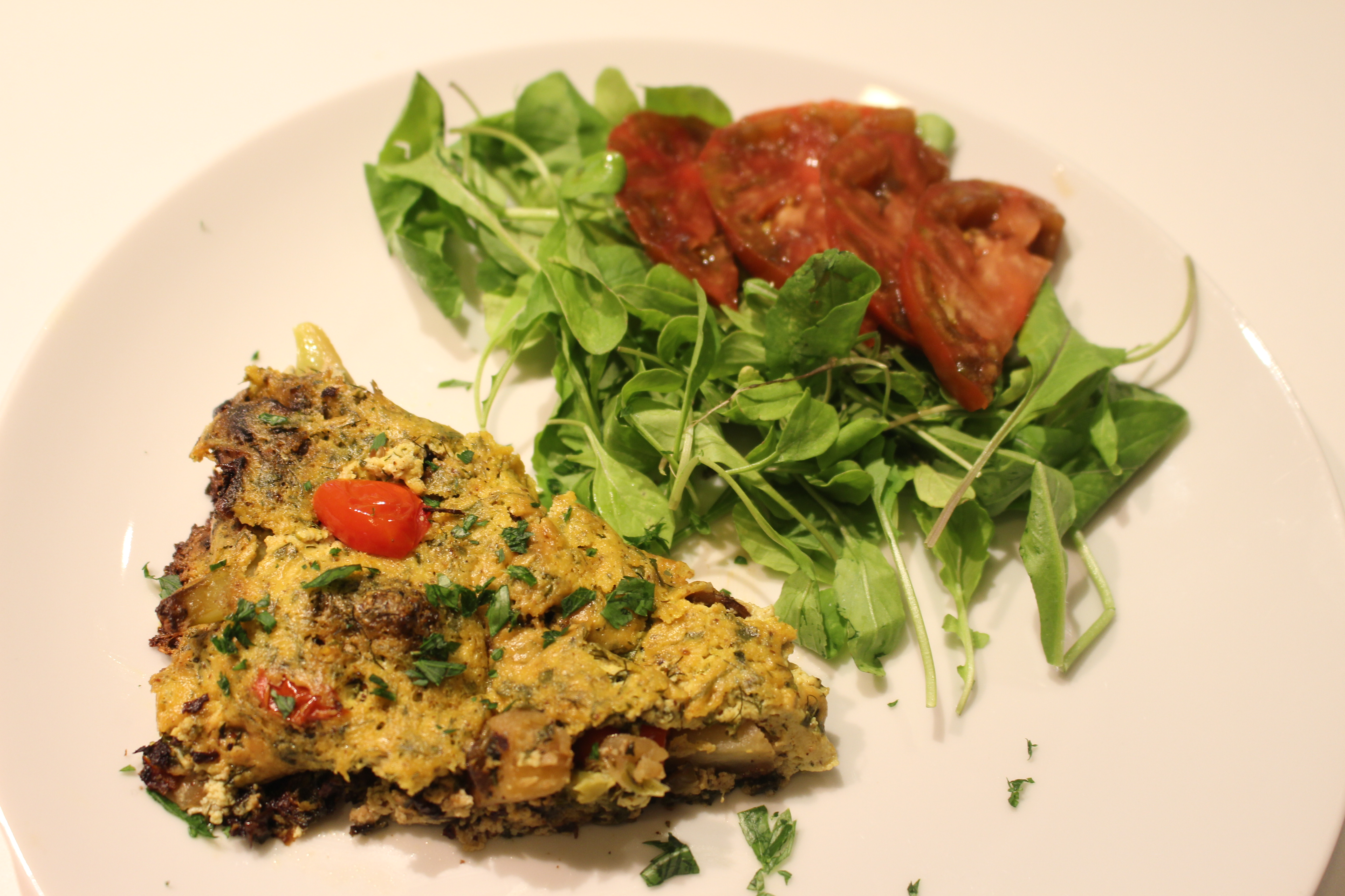 - If adding vegan cheese, remove from oven now and sprinkle on top. Return to oven, and continue cooking for 10 more minutes, until cheese melts and frittata is firm and has golden edges.