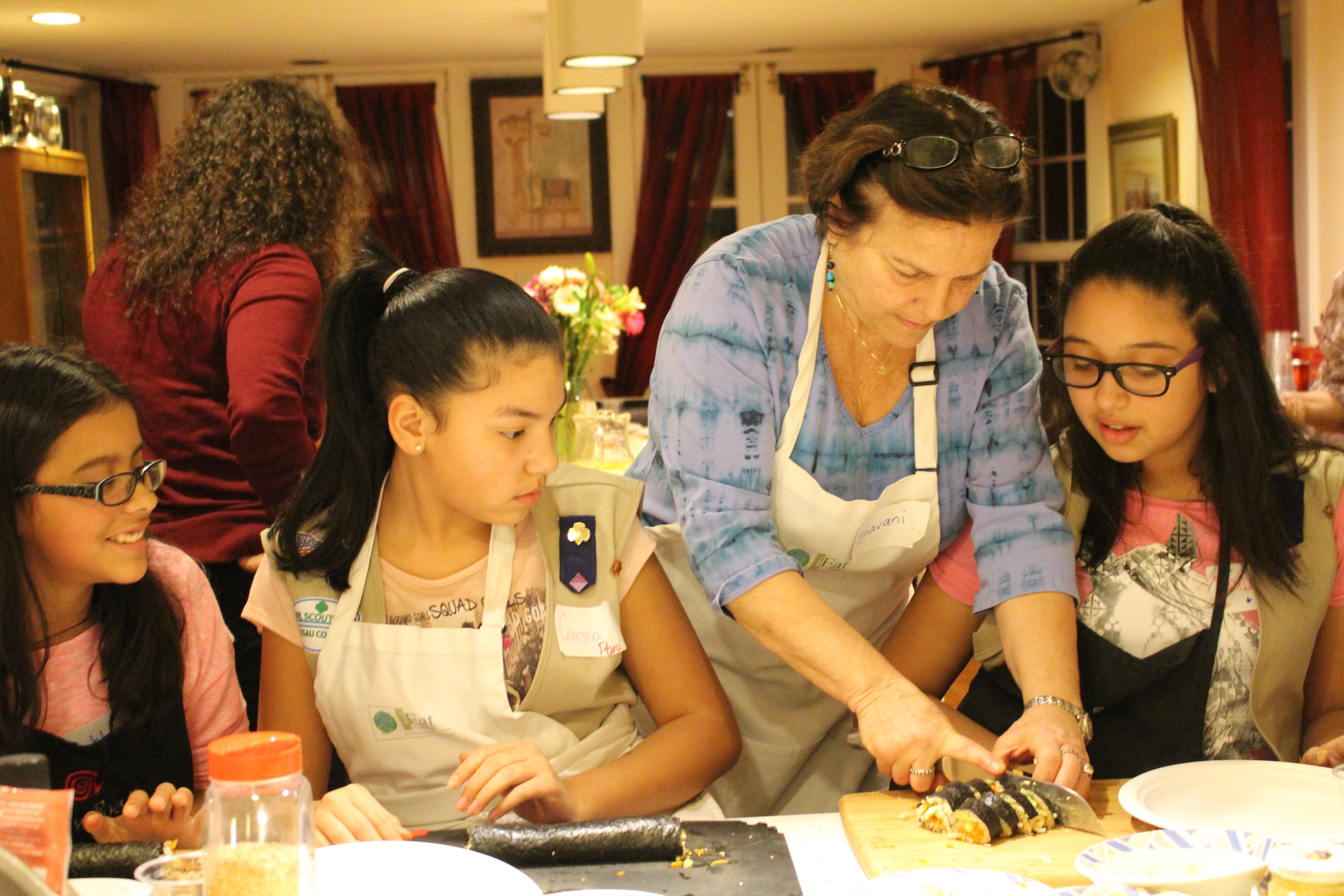 They were open to trying new foods and were enthusiastic about participating in the cooking and in the eating! We started the evening by making Vegetarian Sushi Rolls, filled with a sautéed carrot/onion/ginger mixture, and then added avocado or cucumber as desired. Next, we made a Japanese Stir Fry with Tofu, along with Sesame Rice Noodles, and finished up the evening with a Vegan Raspberry Lindzer Tart Cookie. It was a fun and educational evening for all!