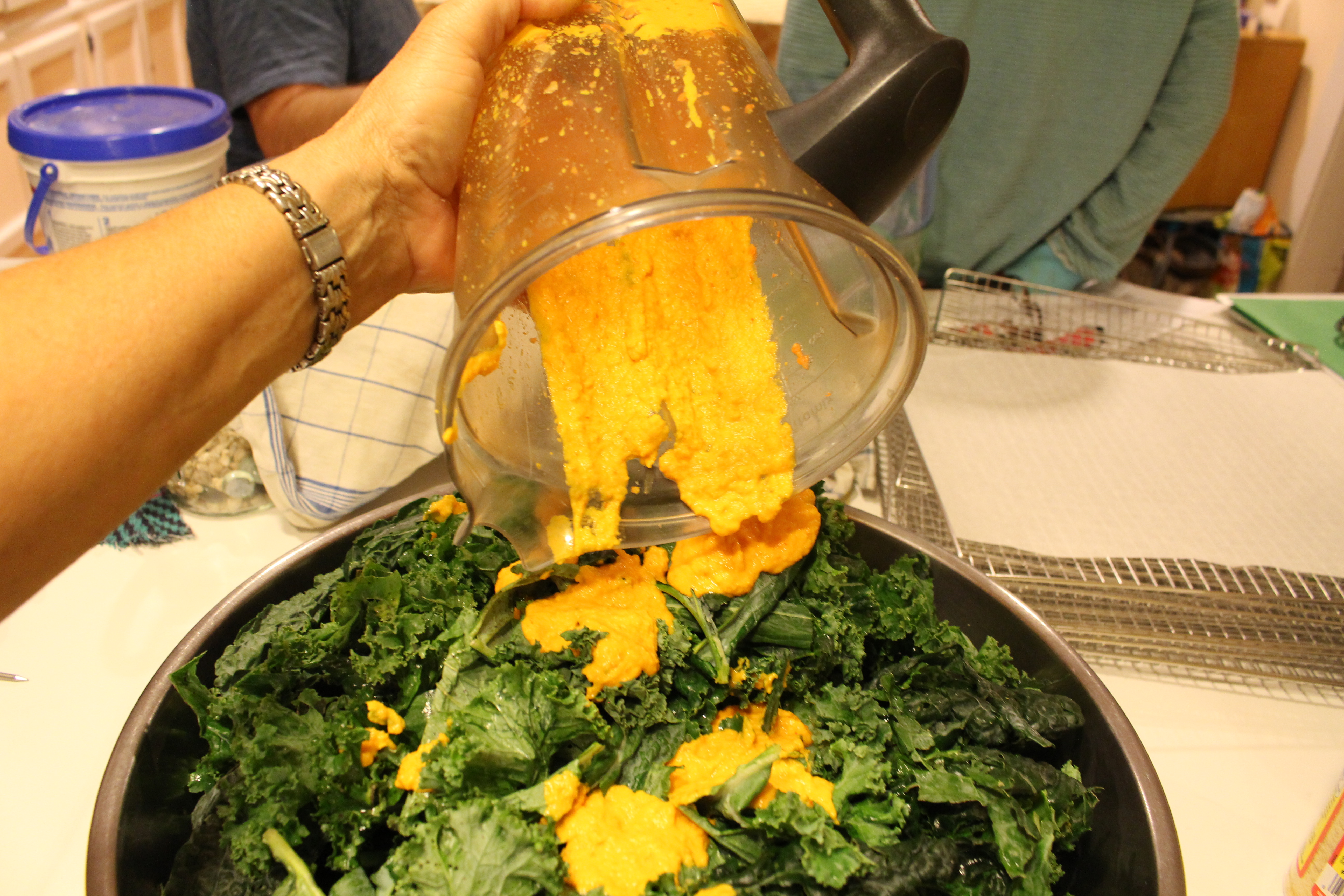 - Toss the pureed veggies over the kale, spreading them evenly on each piece.