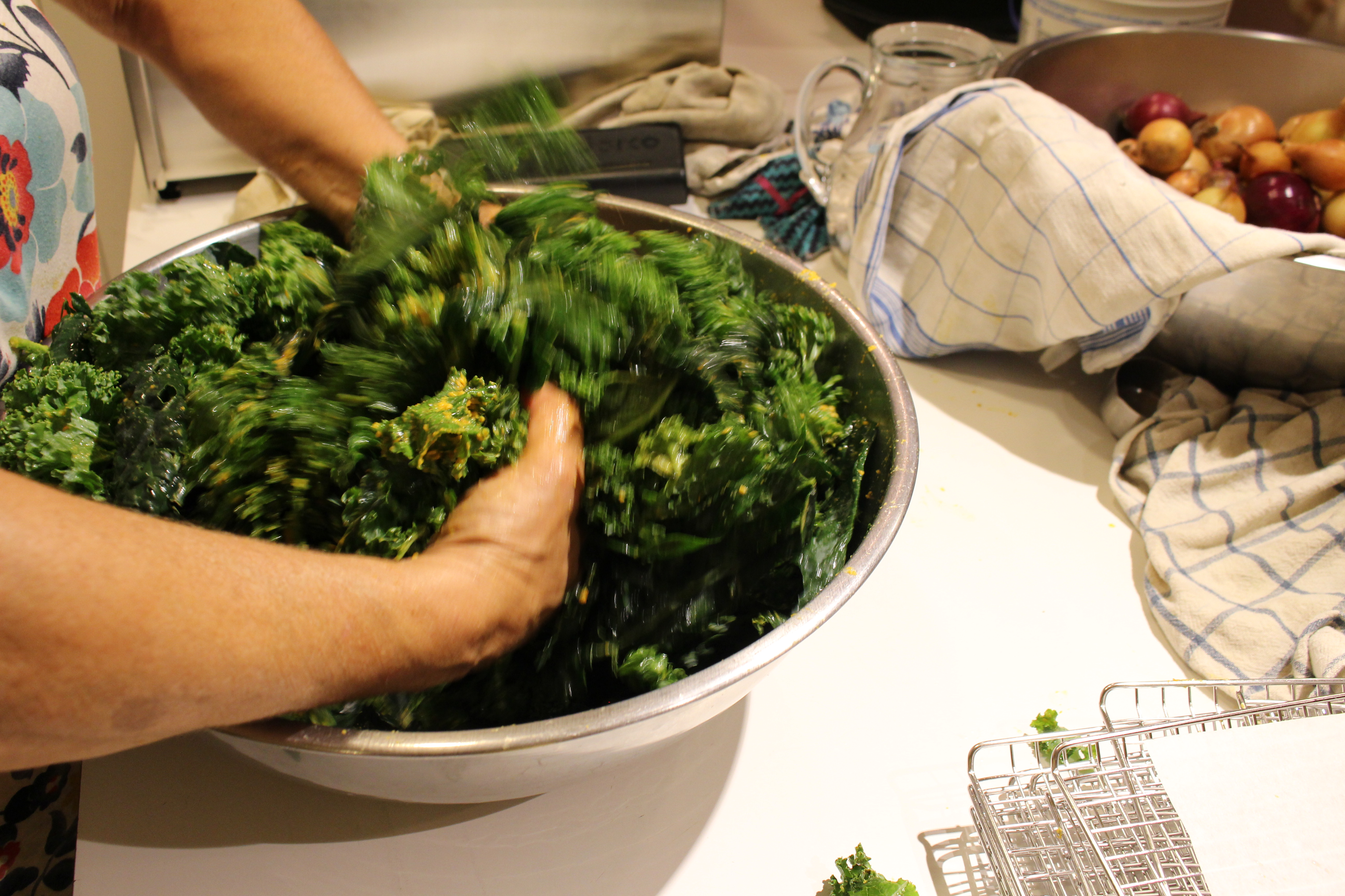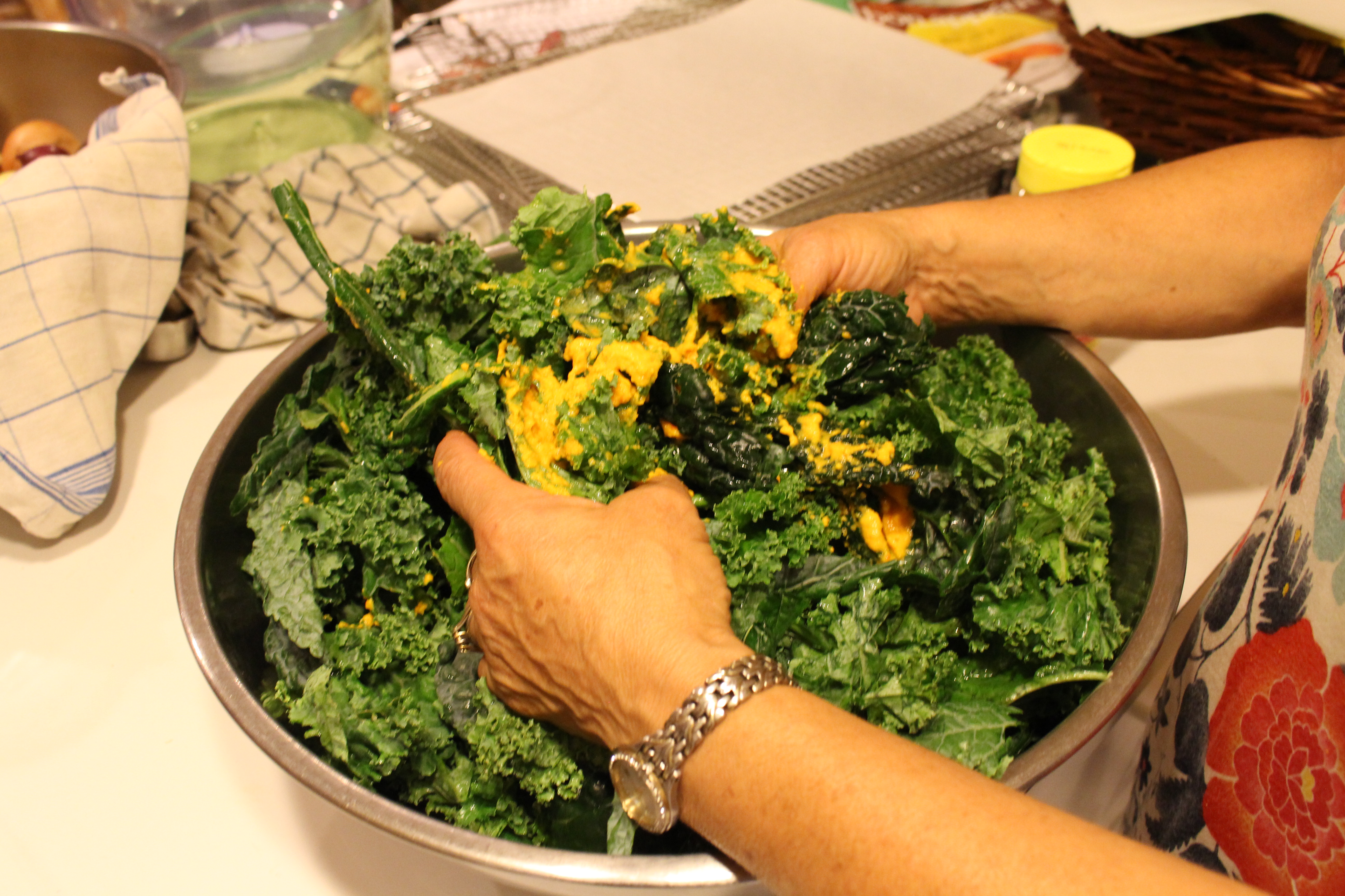 4. Toss the pureed veggies over the kale, spreading them evenly on each piece.