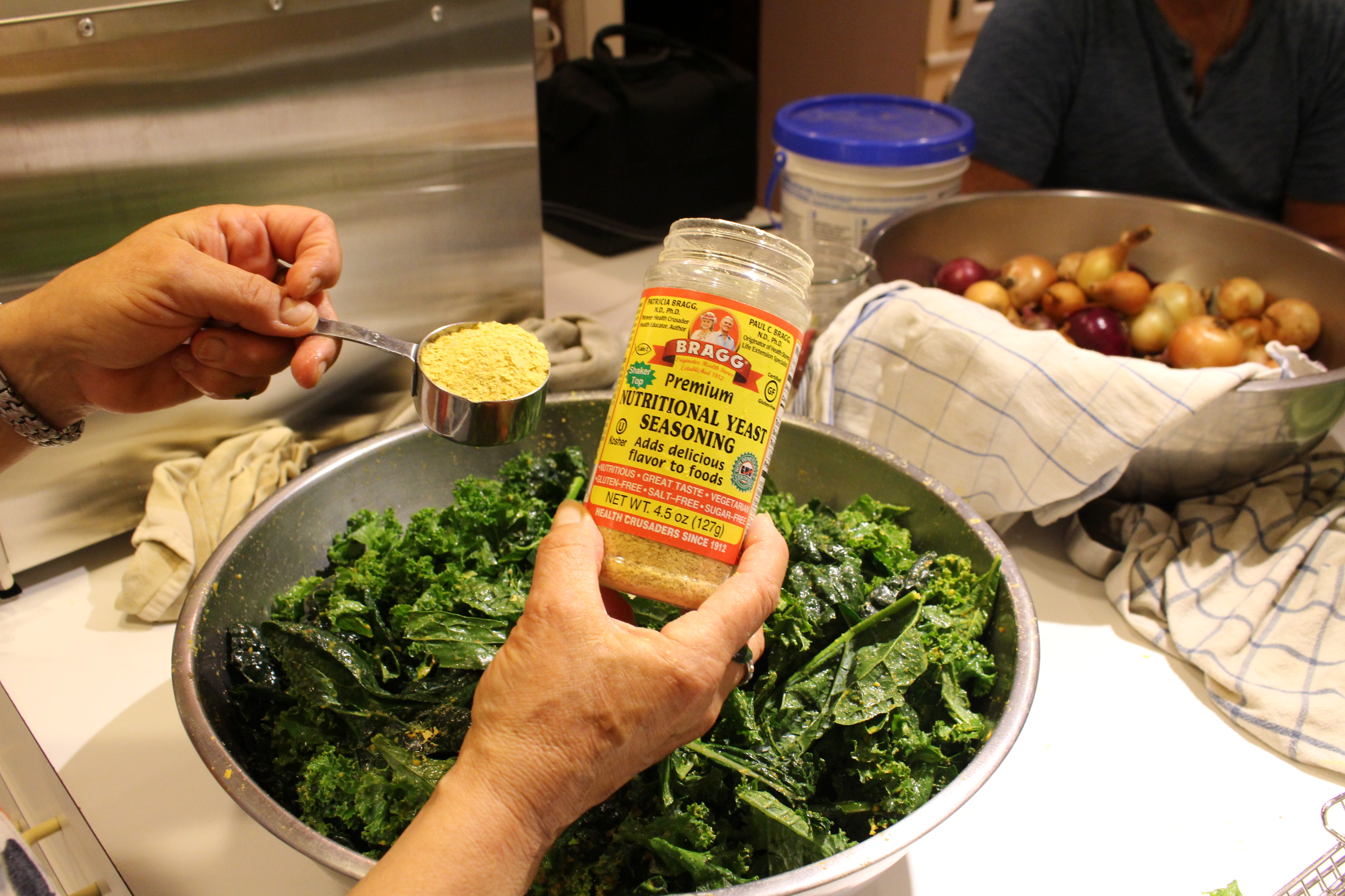 - Sprinkle the nutritional yeast over the kale and toss again.