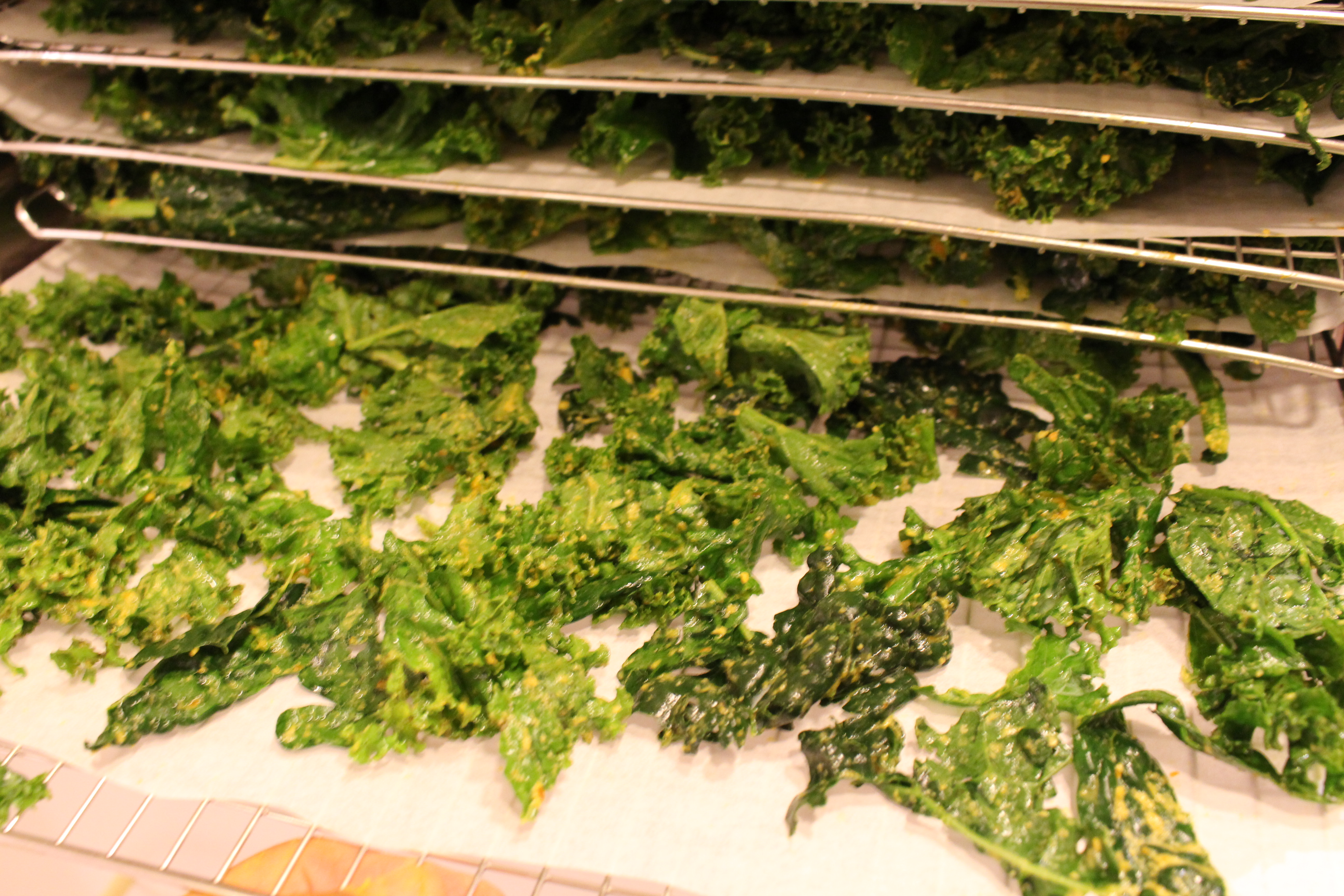 - Lay out the kale flat on a cookie sheet, lined with parchment paper, or dehydrator tray, making sure not to overlap the pieces. Use as many cookie sheets or trays as you need.