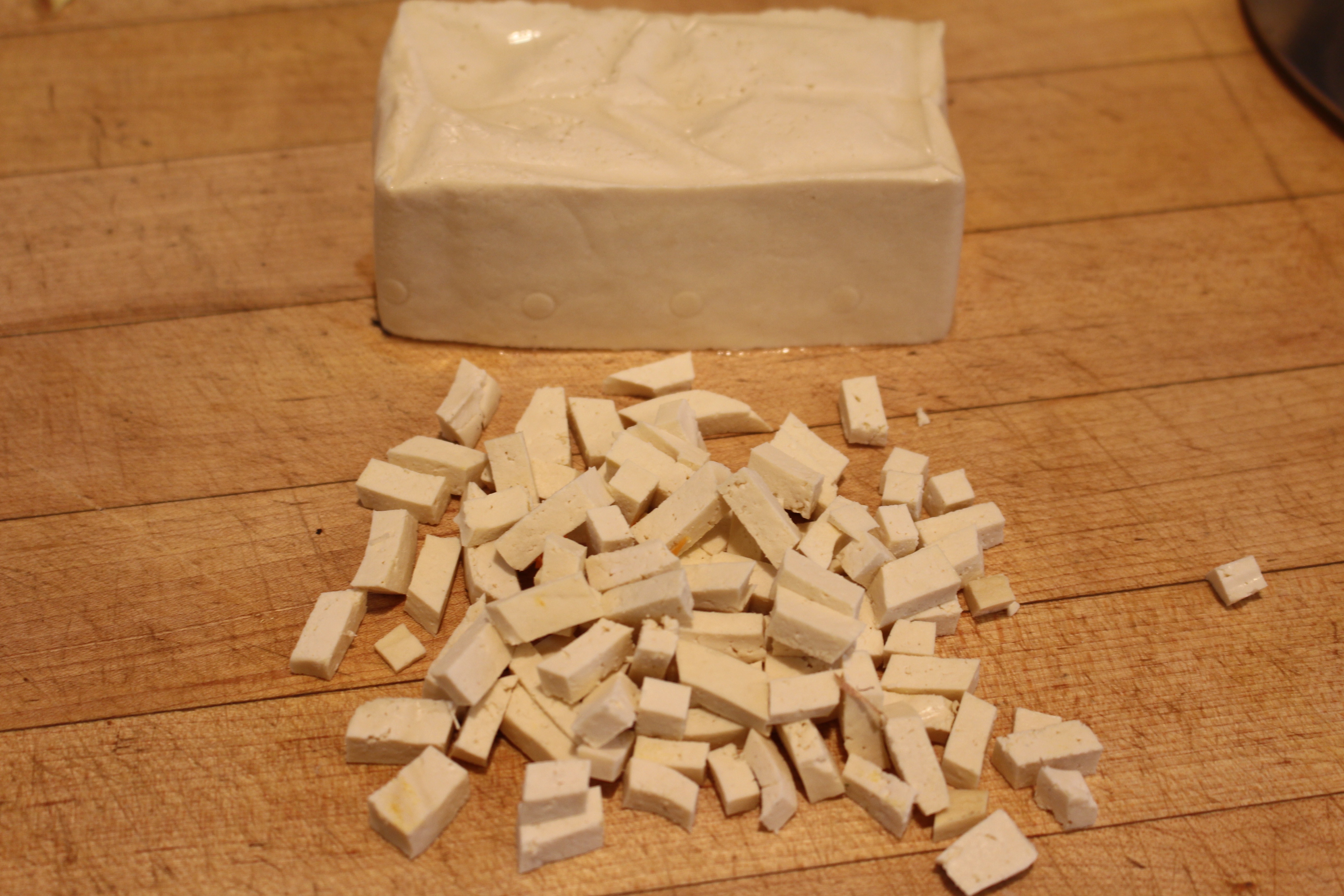 - Cook for 5 minutes. Reduce heat to simmer, and add onions and tofu.