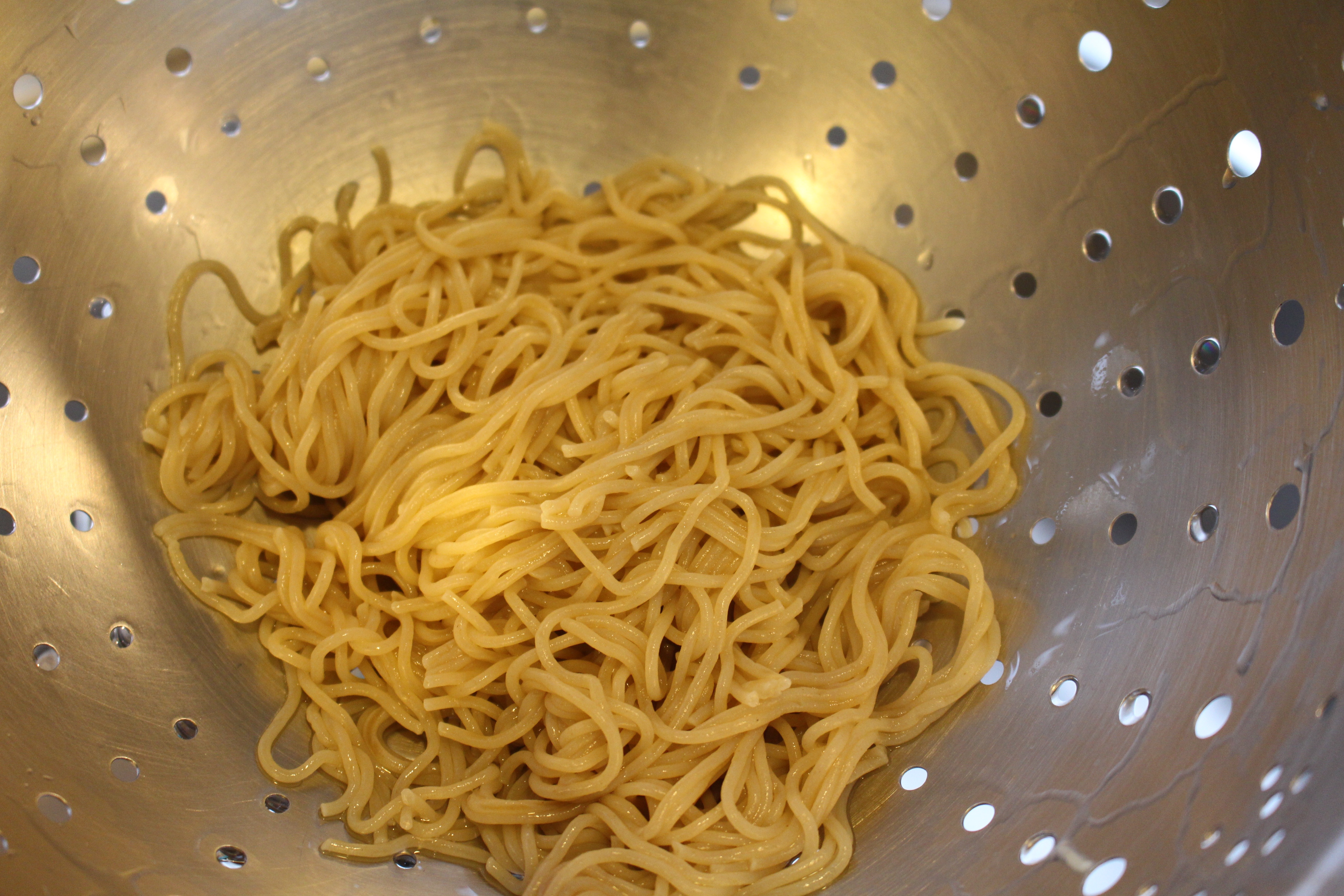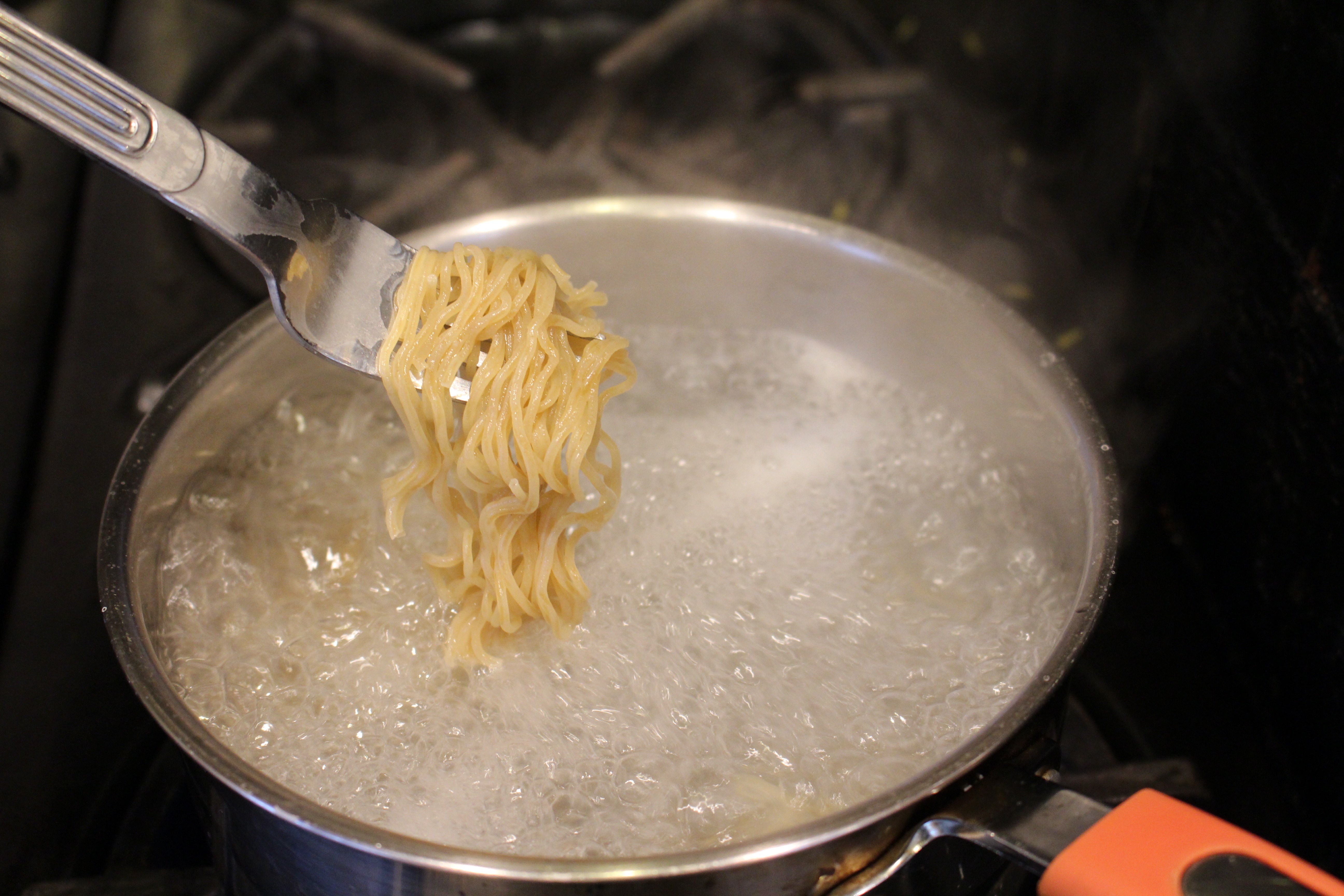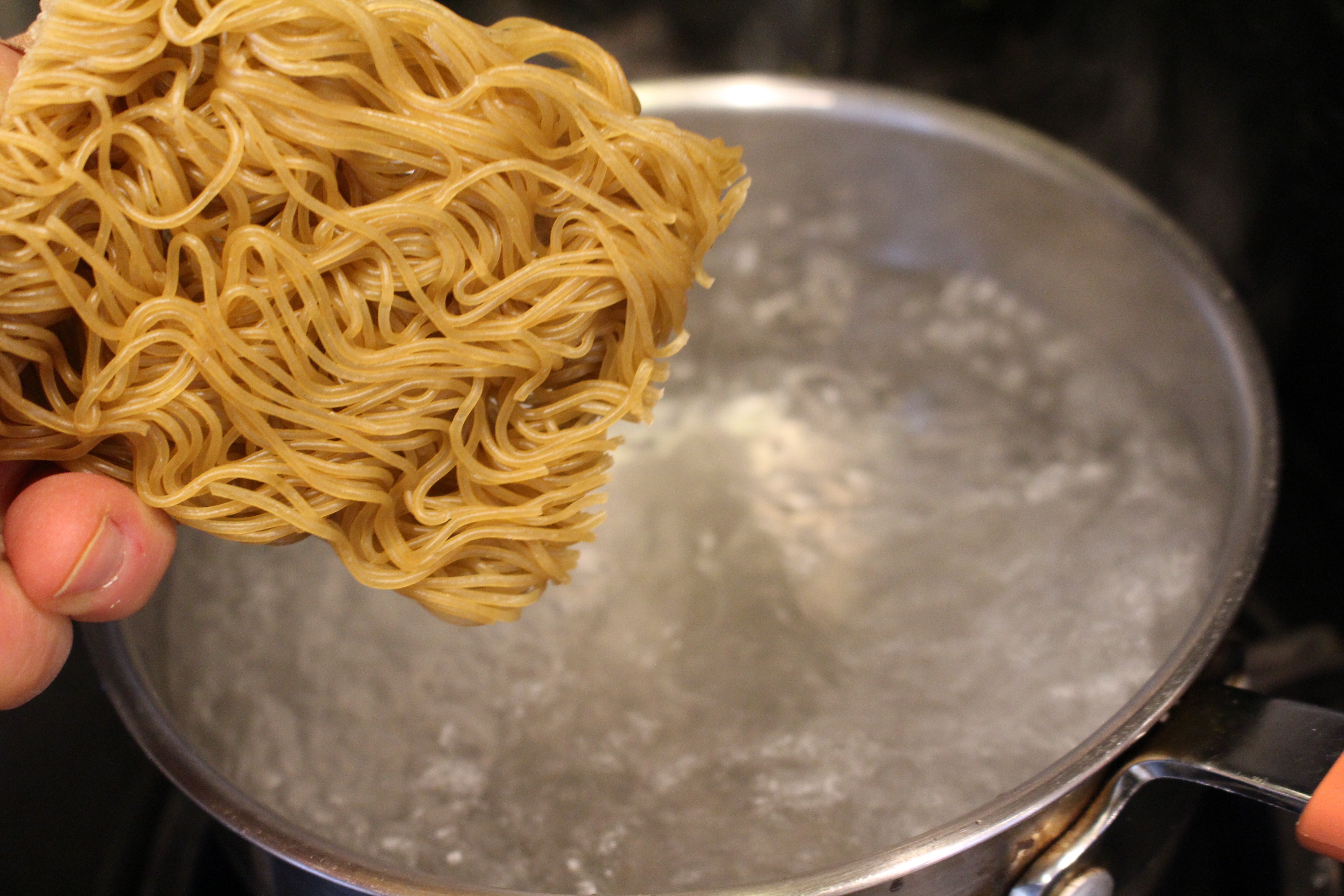 - Meanwhile, bring another pot of water to a boil, and cook the ramen, 1 cake per person, according to directions, about 3 minutes. Drain when ready, and run under cold water to stop the cooking.