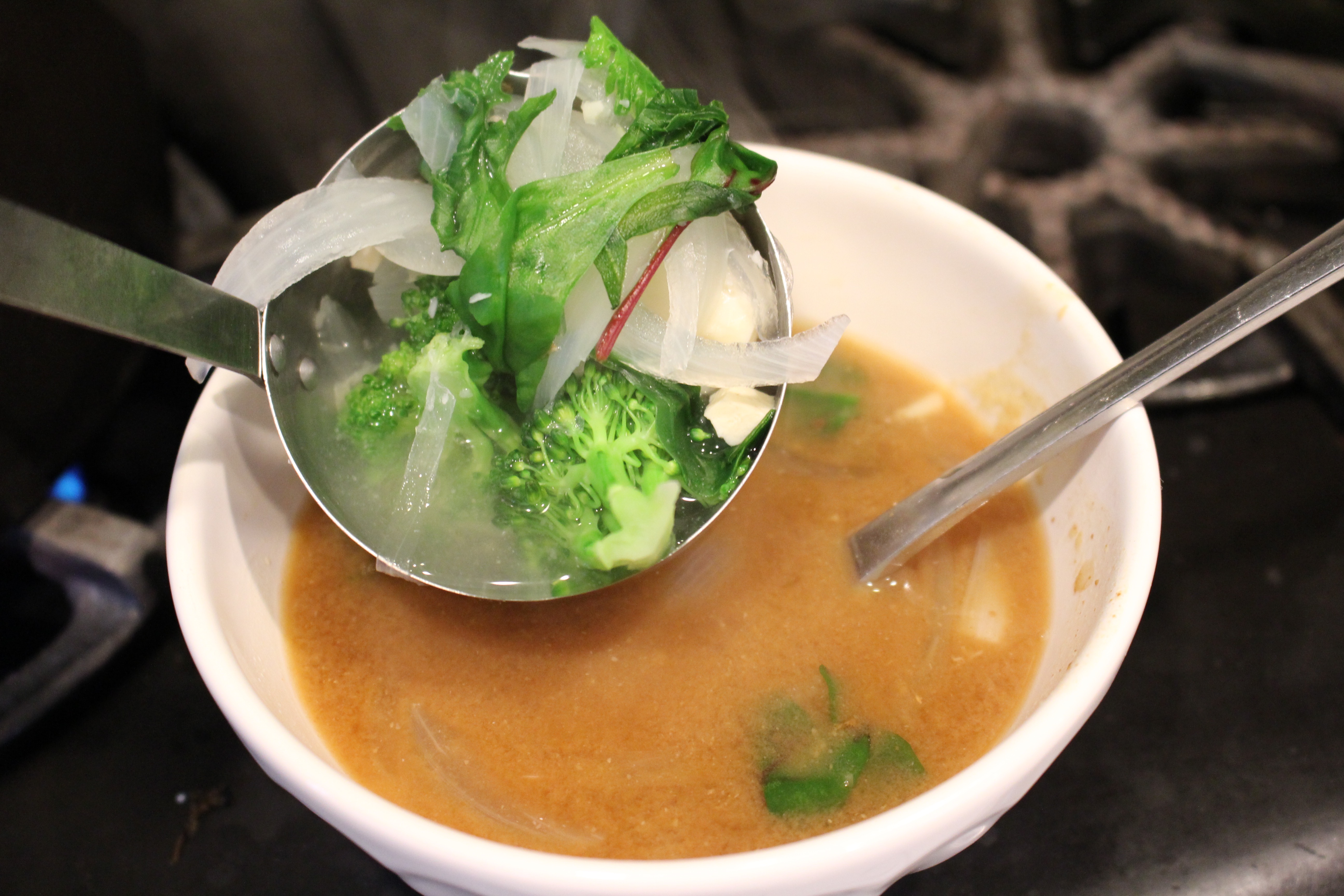 - Put the 2 teaspoons of miso into each bowl, and add 1 ladle of broth only to the bowl. Dissolve the miso into the broth in each bowl, then add another ladle of broth with the vegetables and tofu.