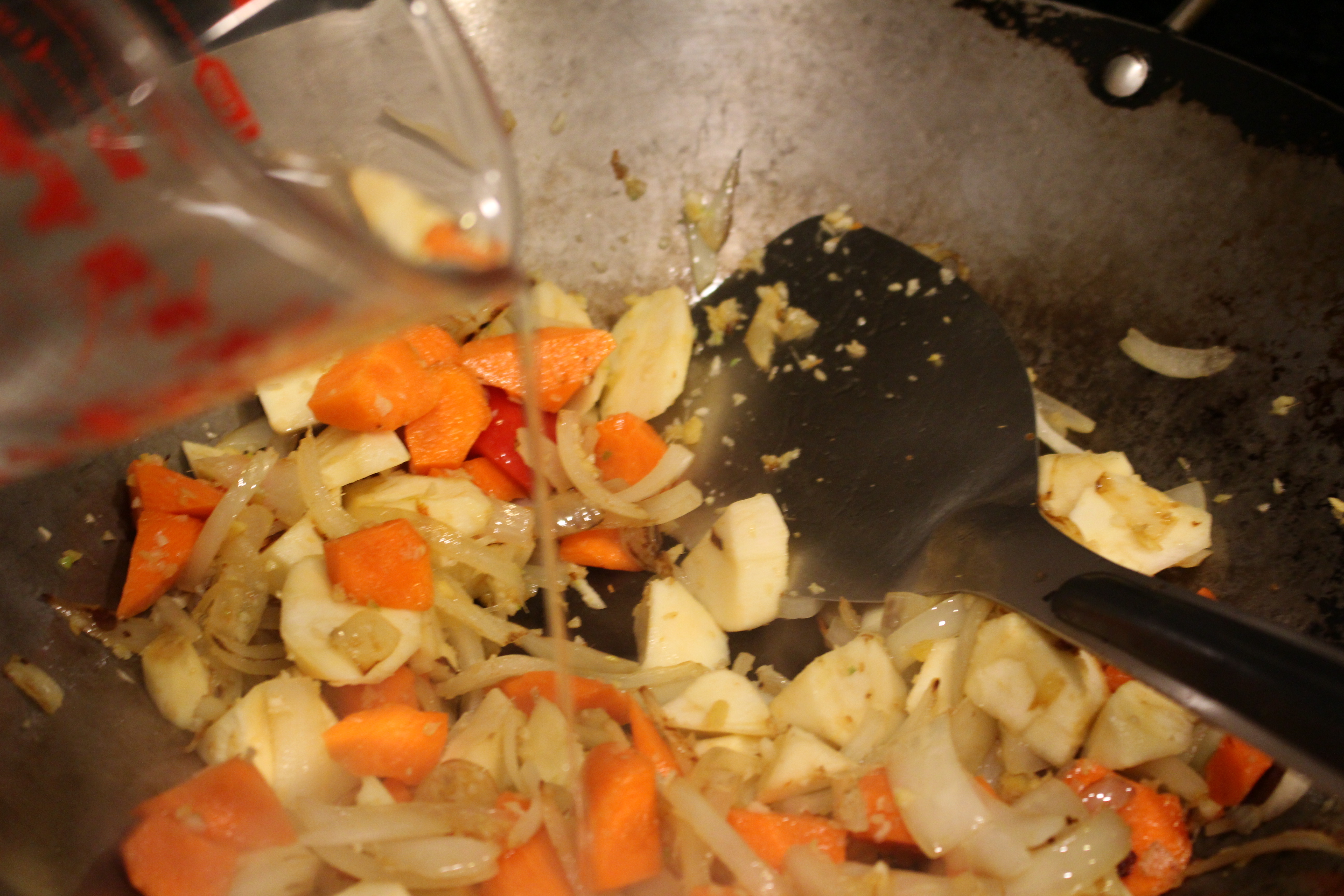 Meanwhile, sauté the onion in olive oil, with the garlic and ginger and cook until translucent. Add the carrots and parsnips and cook a few minutes more.