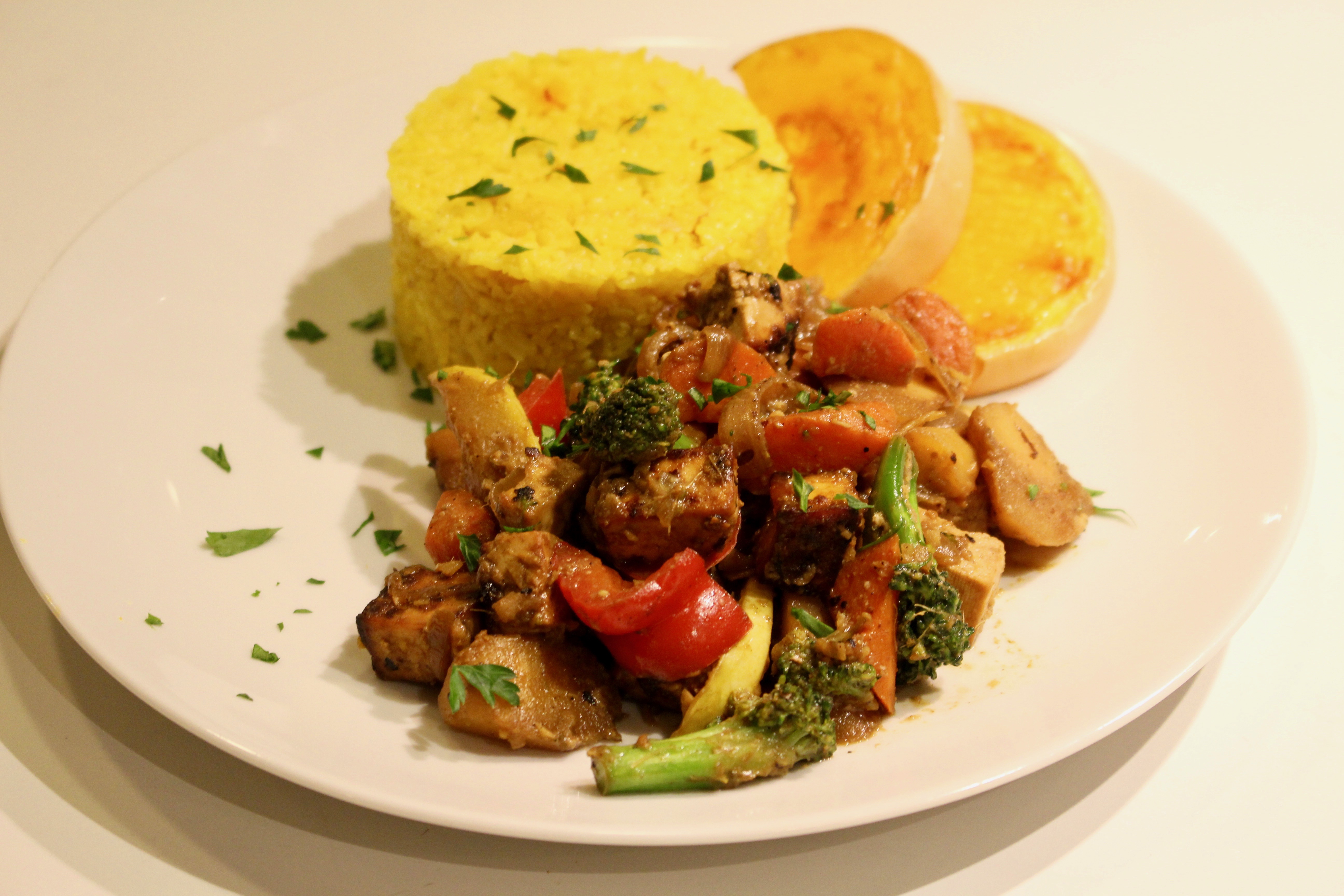 Add 2 Tbs. water (instead of more oil) and cook until the parsnips and carrots are getting soft. Then add the broccoli and cook another few minutes. Add the tamari and mirin to de-glaze the pan. Then add the red pepper and yellow squash and cook until tender. Add the miso baked tofu to the wok, and toss together.