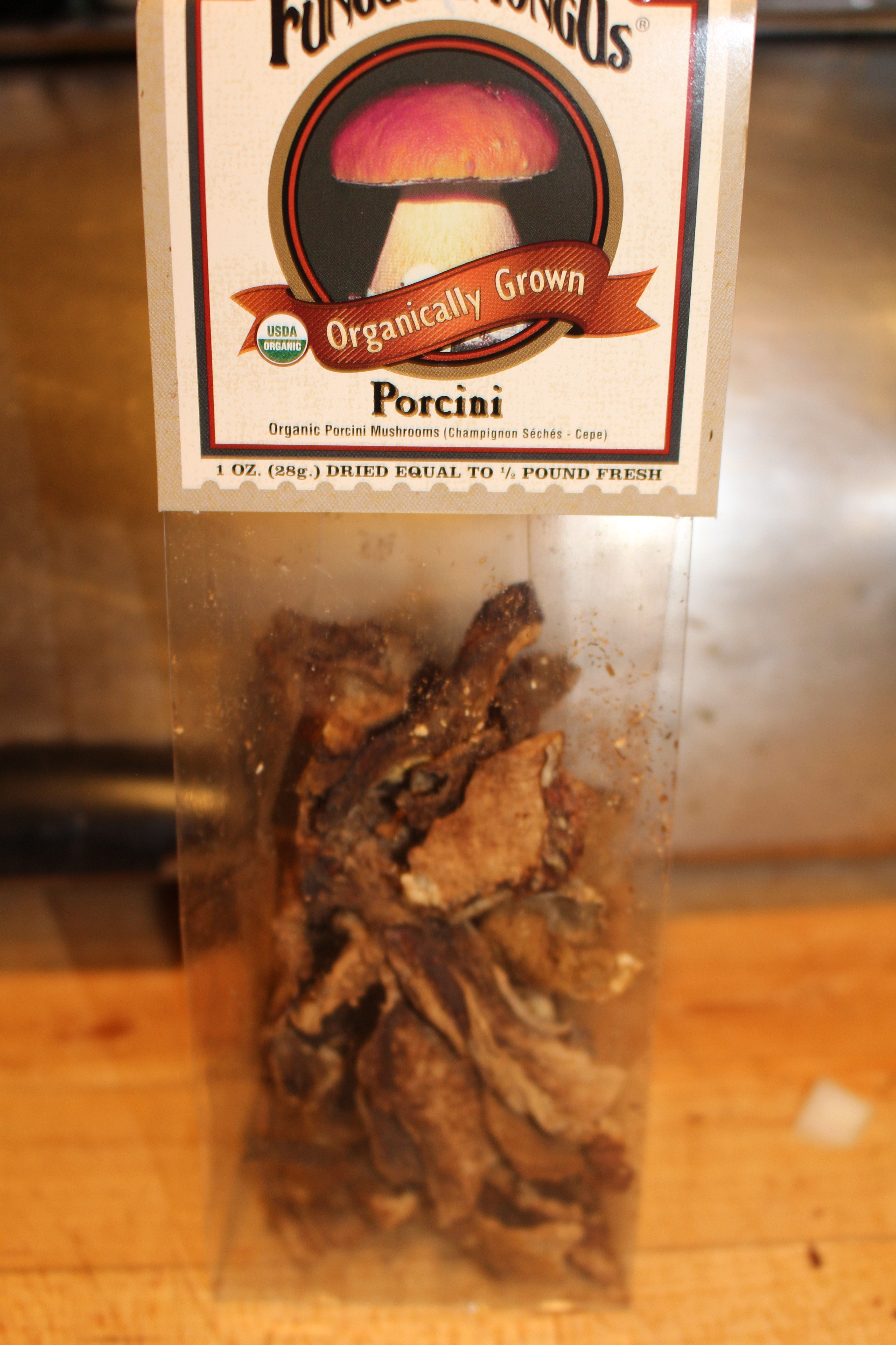 - 1 oz. dried porcini mushrooms, soaked in 1-1/2 cups hot water