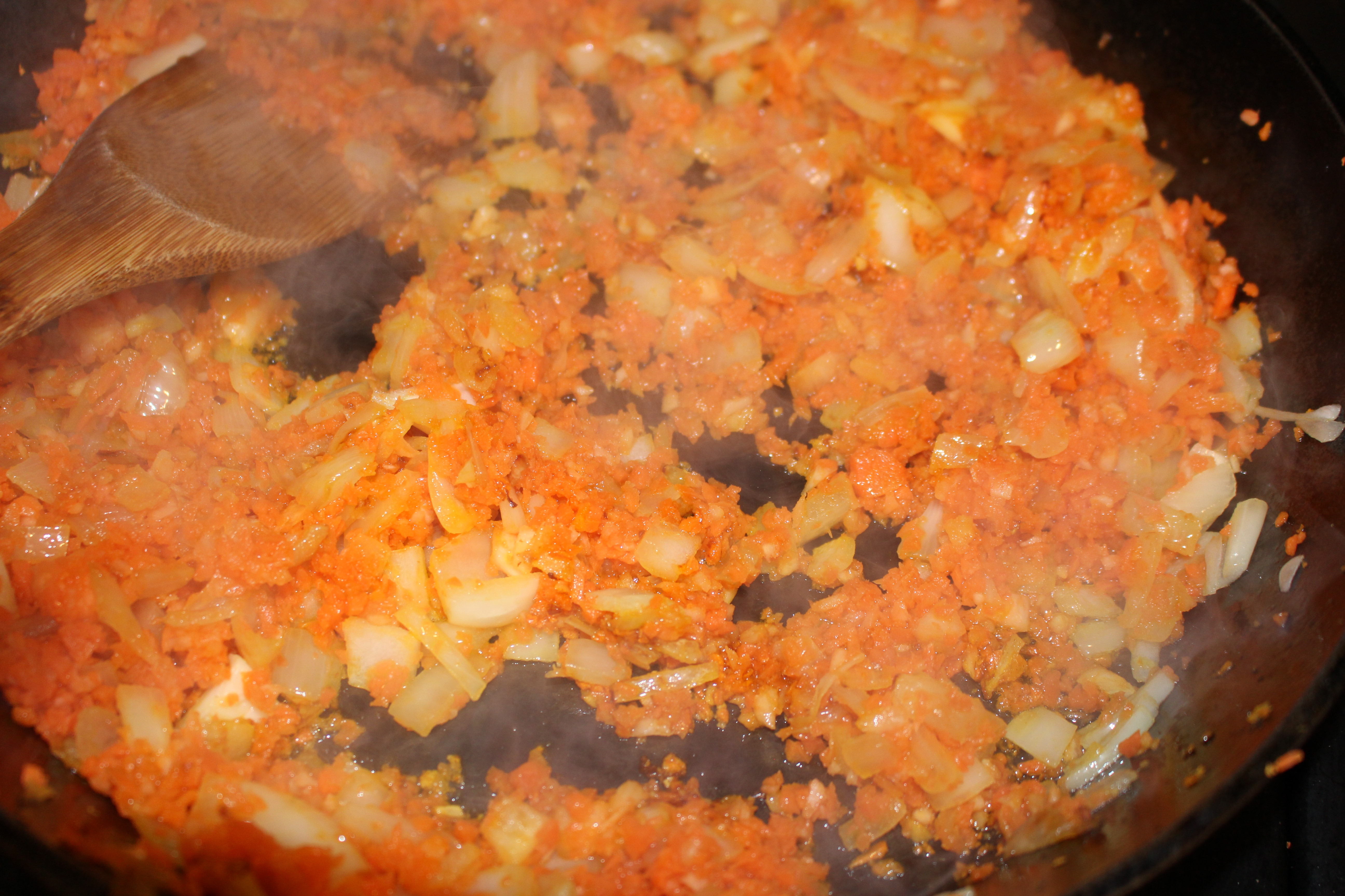 1. Coat bottom of cast iron pan with olive oil. Sauté onions, carrots, celery for a few minutes, then add garlic and cook for 5 minutes.