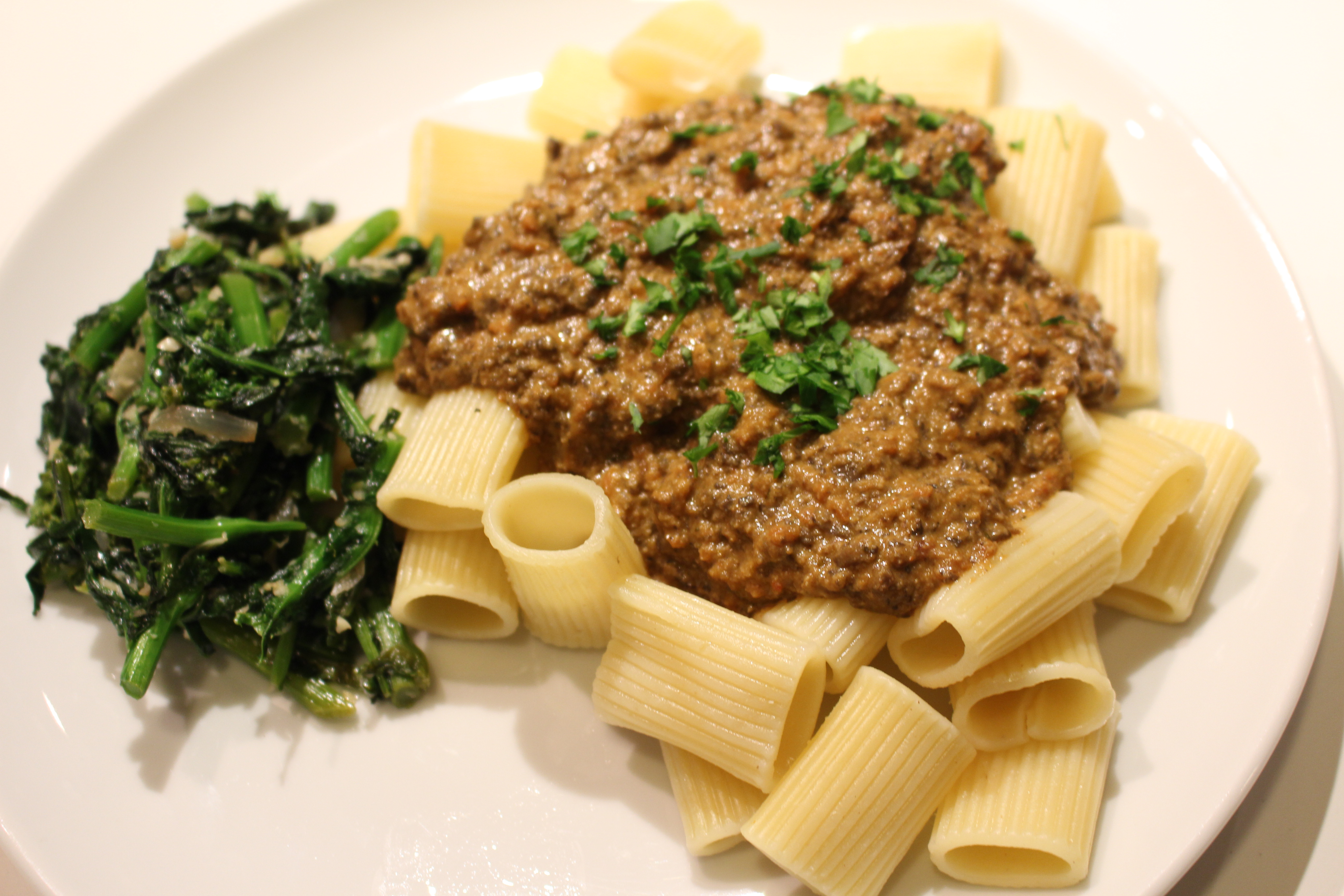 6. Meanwhile, cook pasta according to directions in salted water, (al dente). Time it, so that the pasta just comes out of the water, when you are ready to mix it with the sauce. Reserve some of the pasta water to add to the Bolognese sauce if it needs to be thinned out. Garnish with parsley.