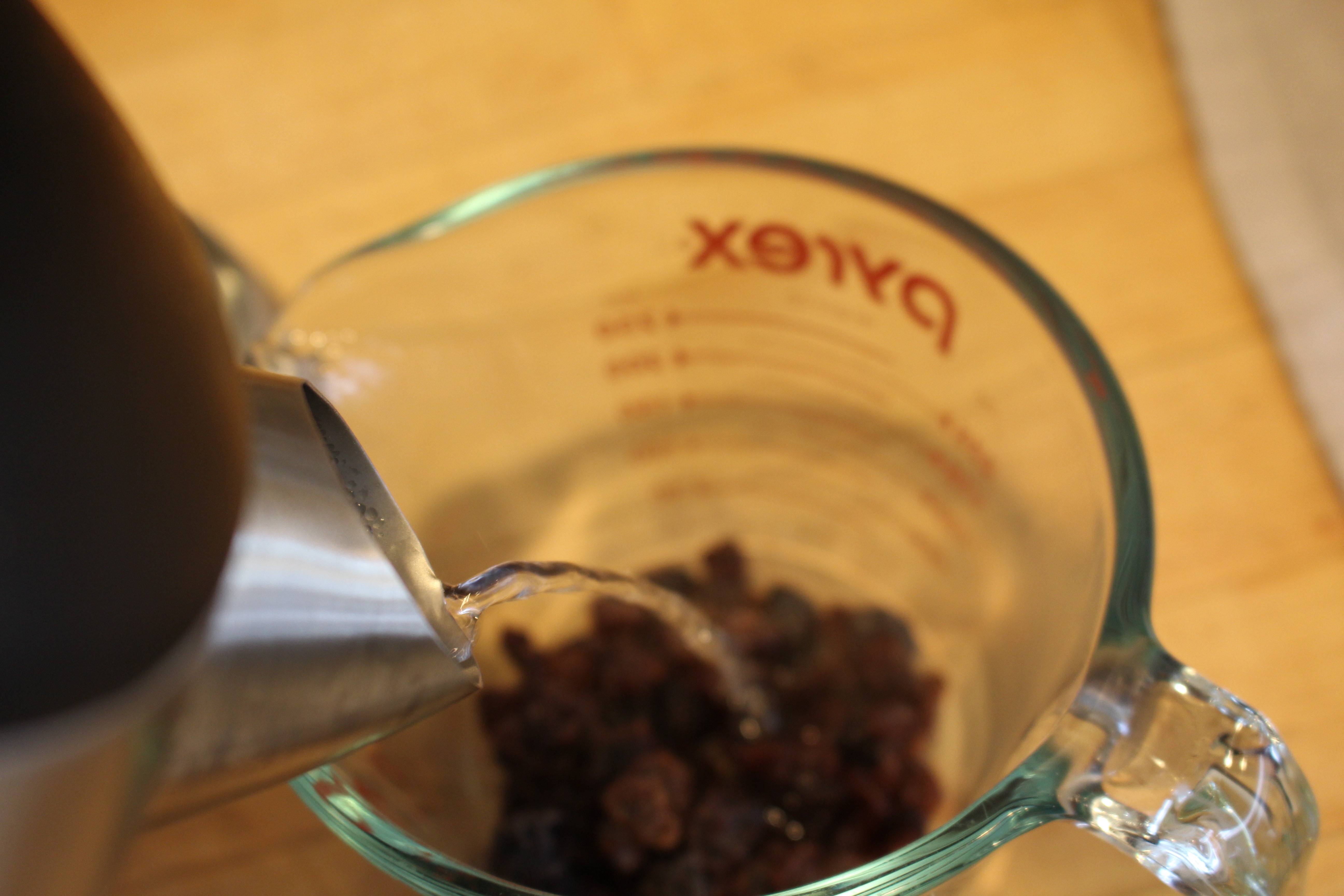 - Pour boiling water over the raisins and let soak for 10 minutes. Drain