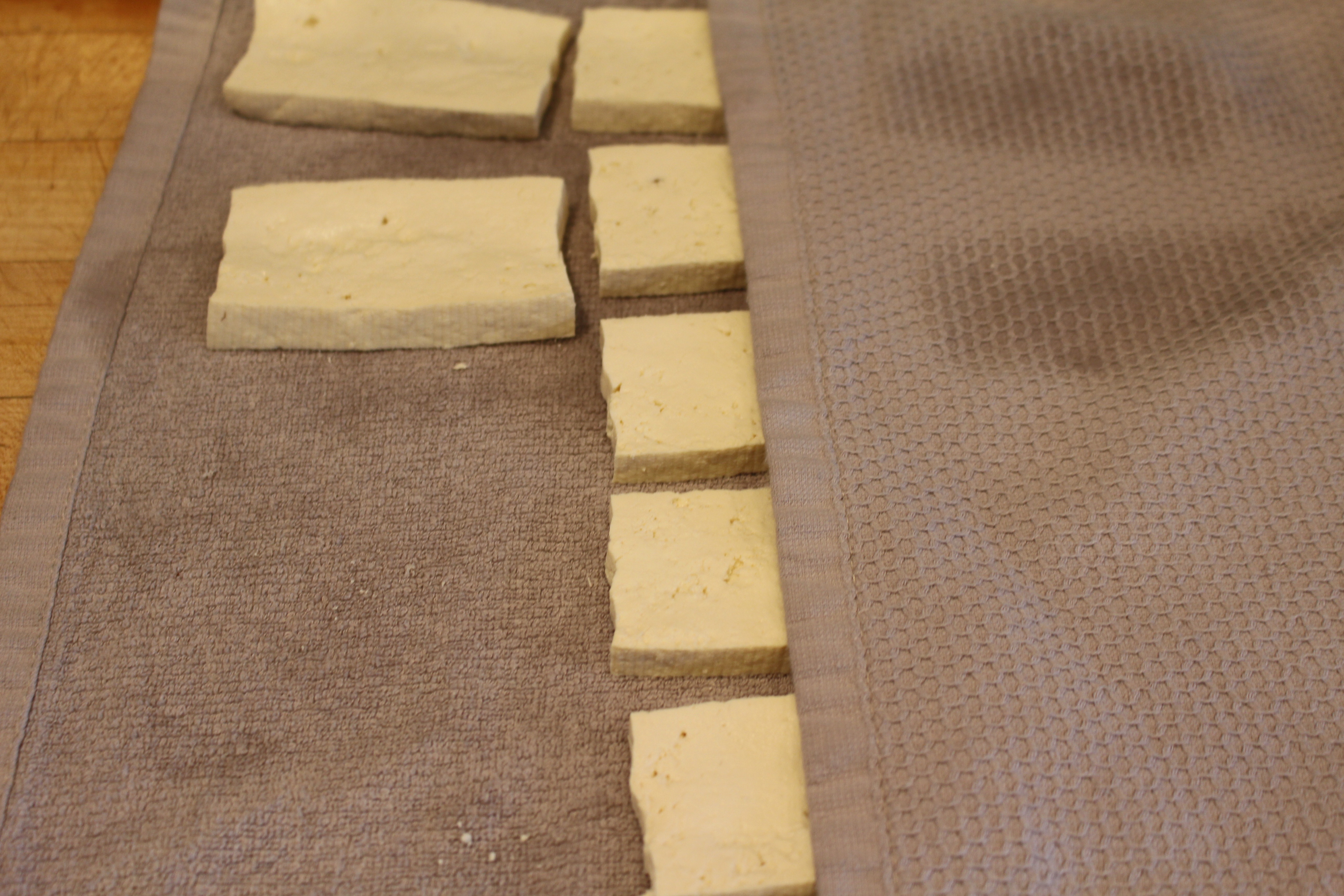 - Lay out tofu slices on dry towel, cover with another towel, and press lightly, to dry.