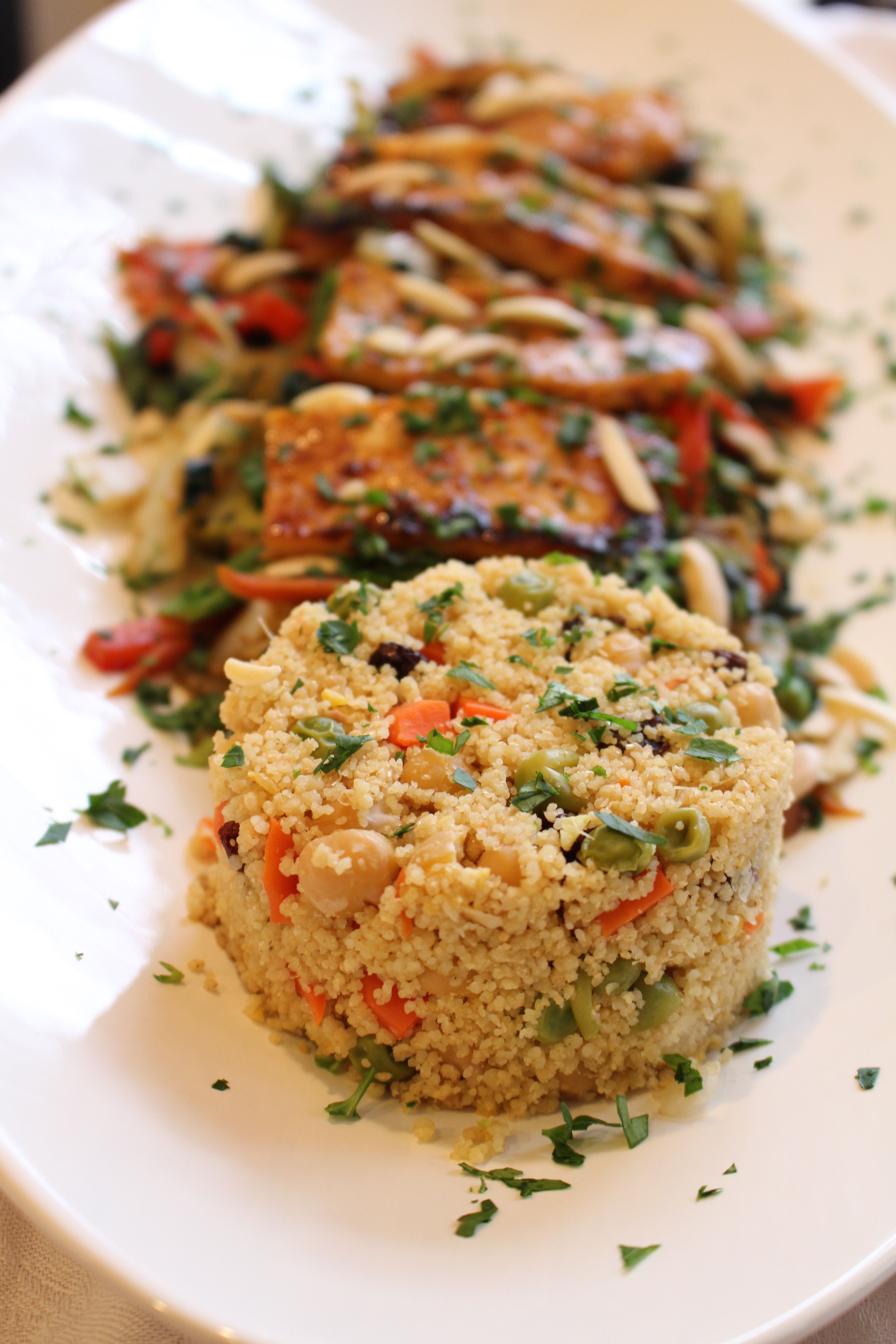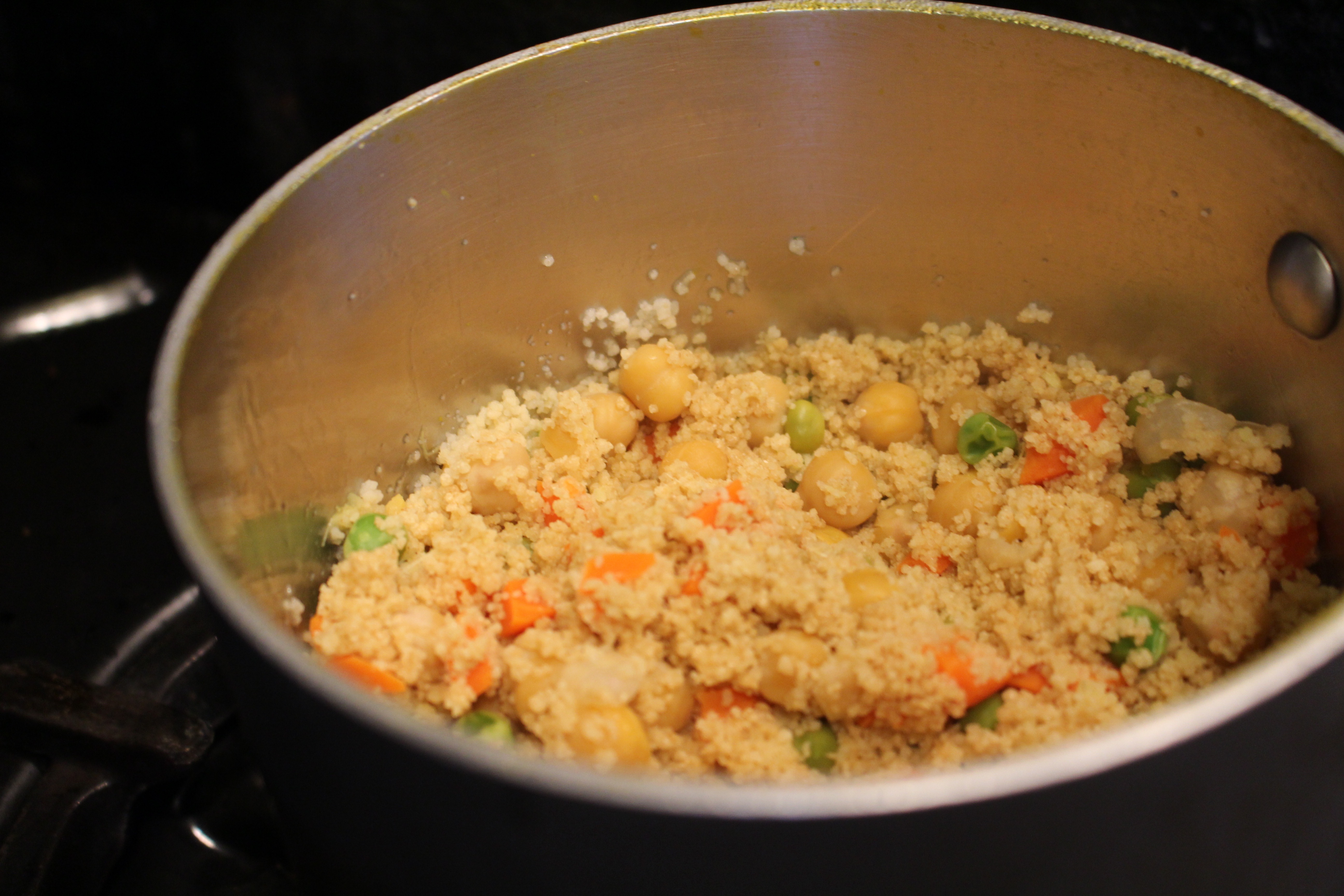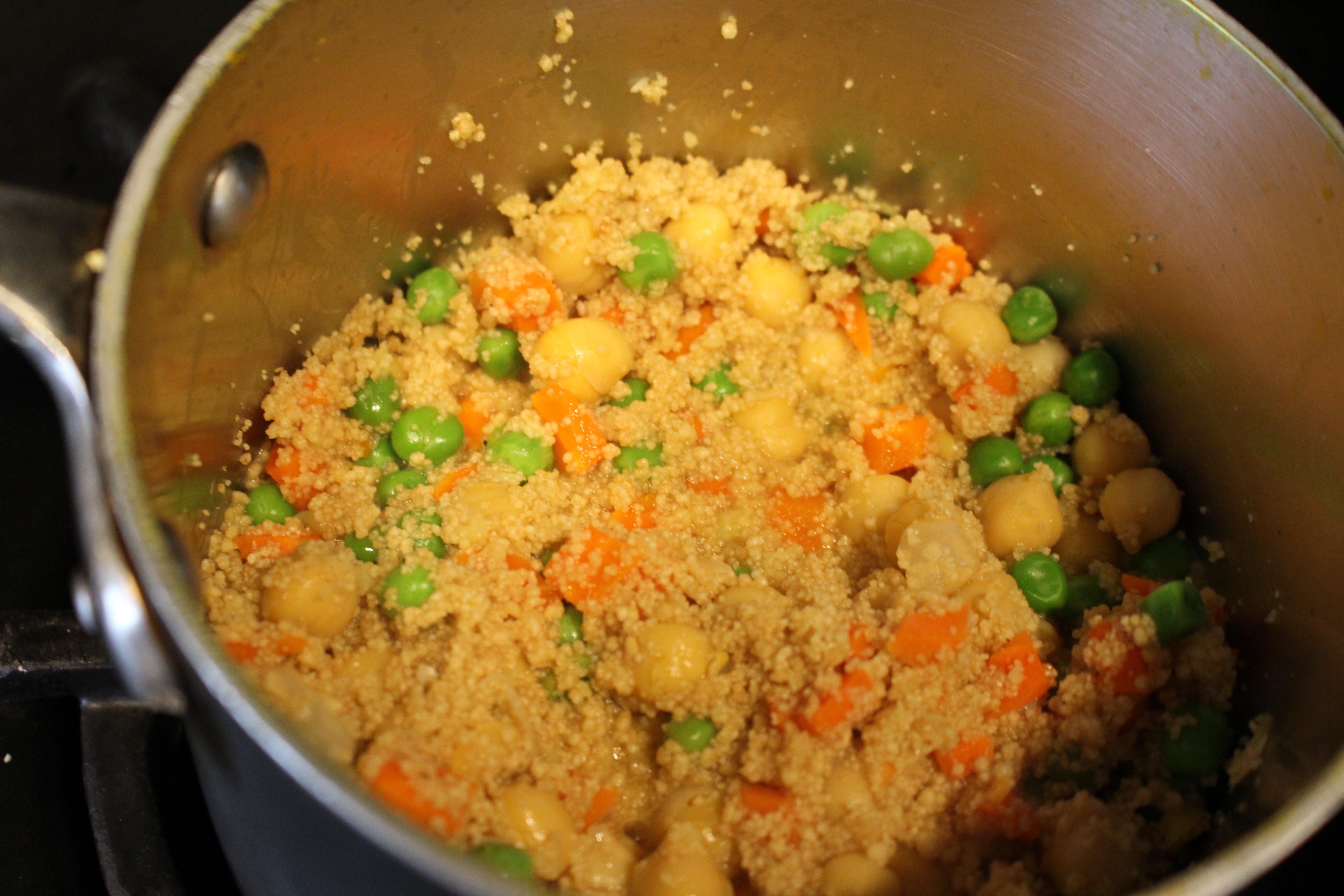 - Combine ¾ cup orange juice, honey, ½ cup water, 2 t. ginger, salt and chickpeas in saucepan and bring to a boil. Add the diced carrots and cook 3 minutes. Add the peas and cook 1 minute, then add the cous cous, stir, cover pot, and remove from heat. Let stand for 10 minutes. Stir in the drained raisins.