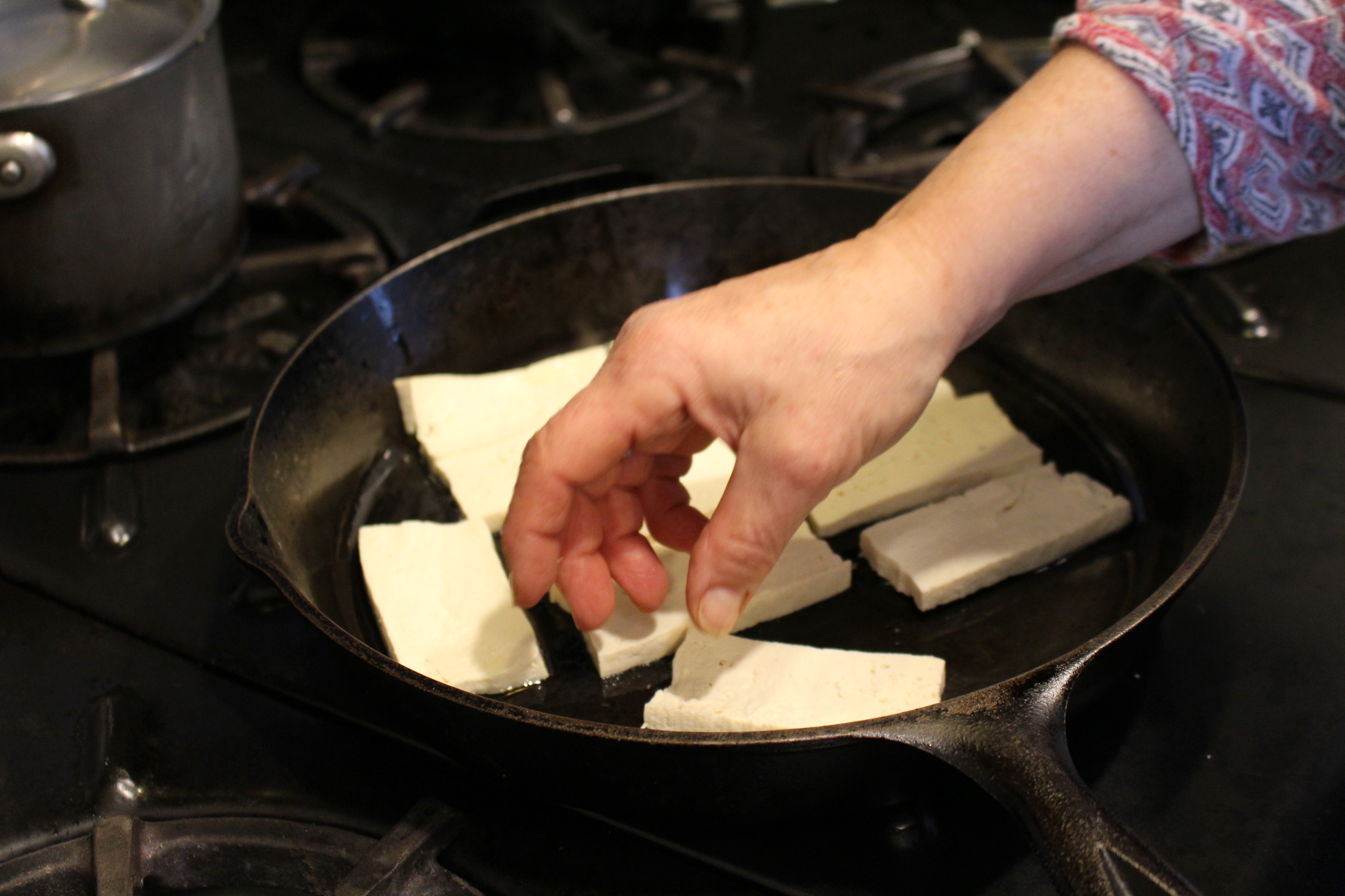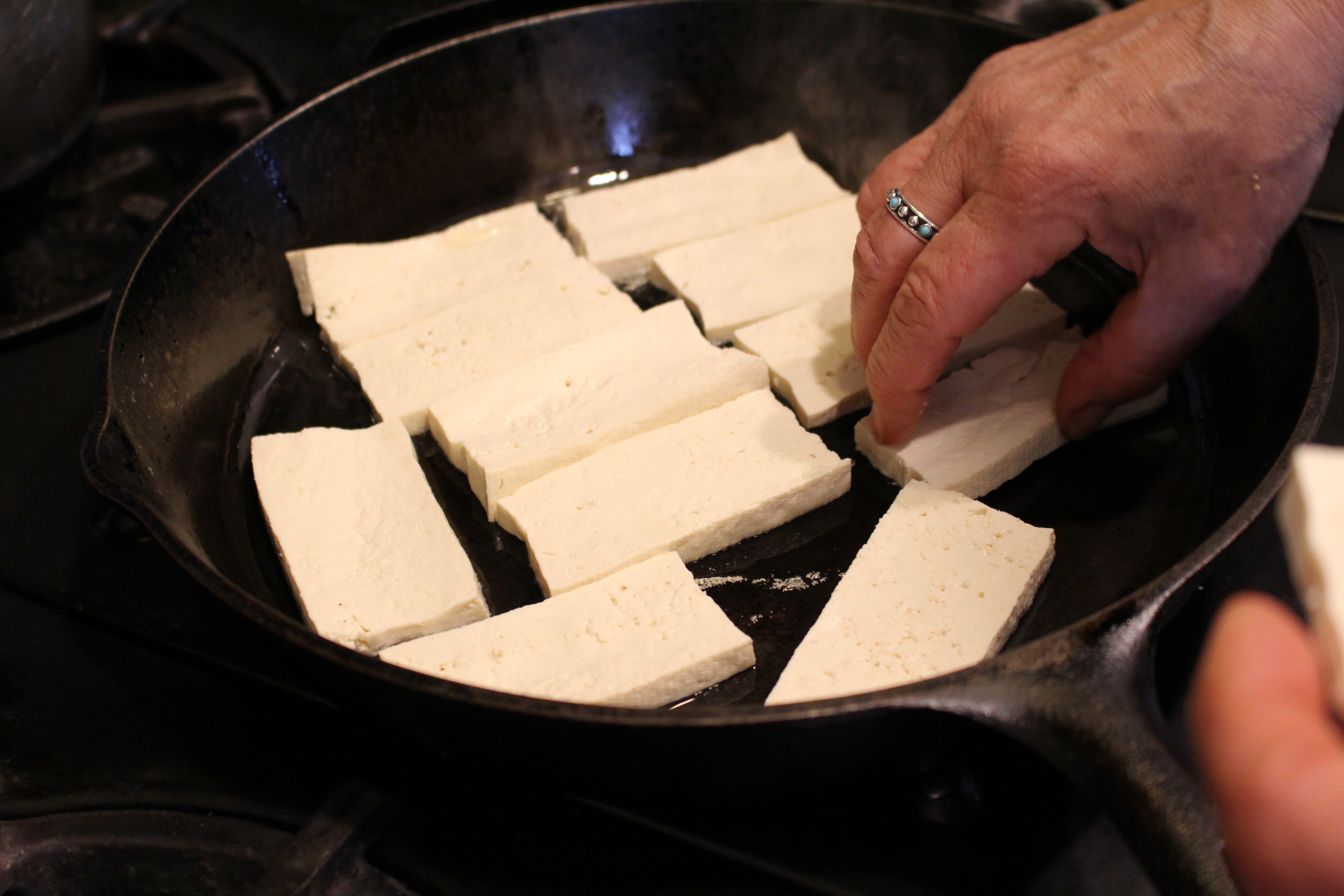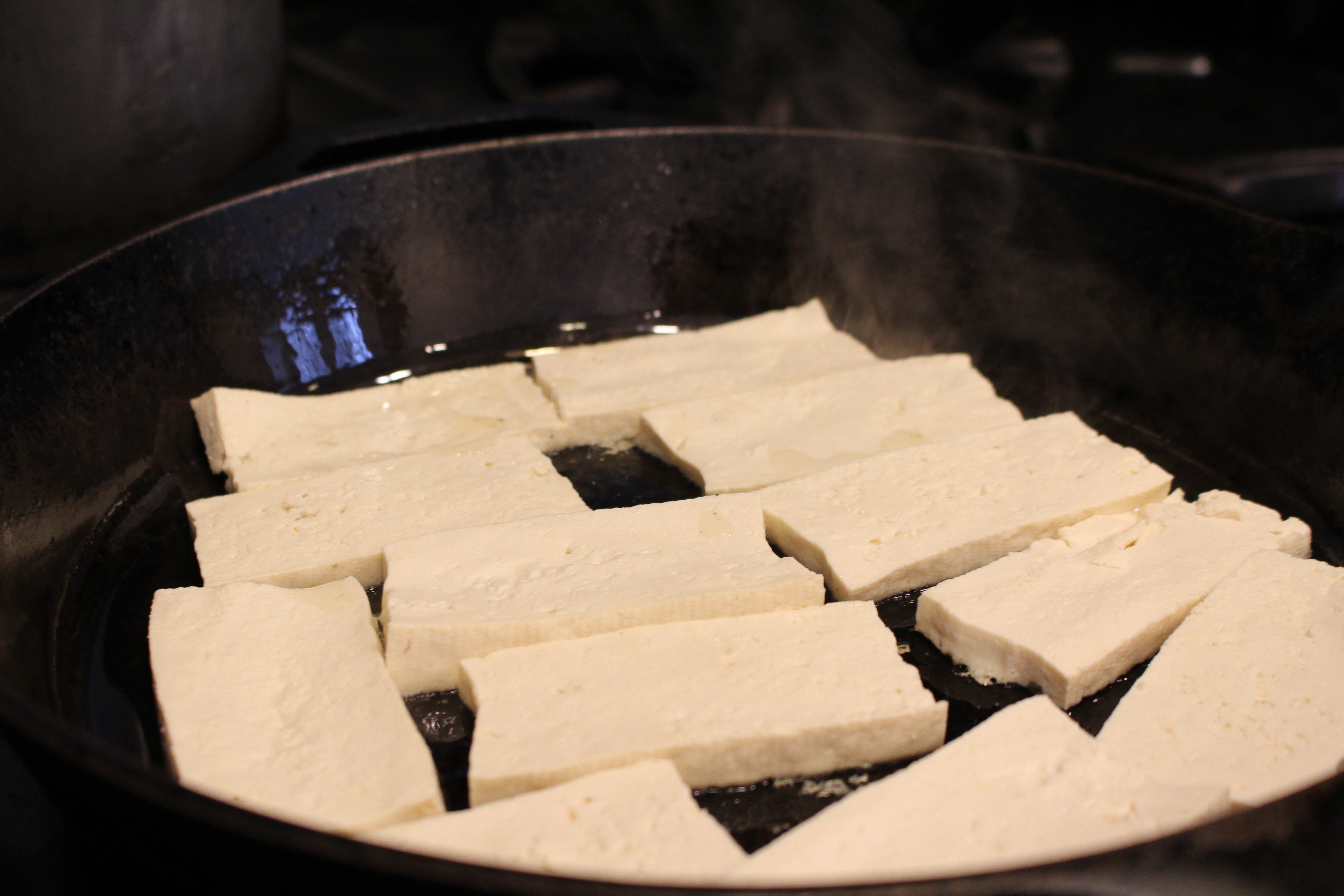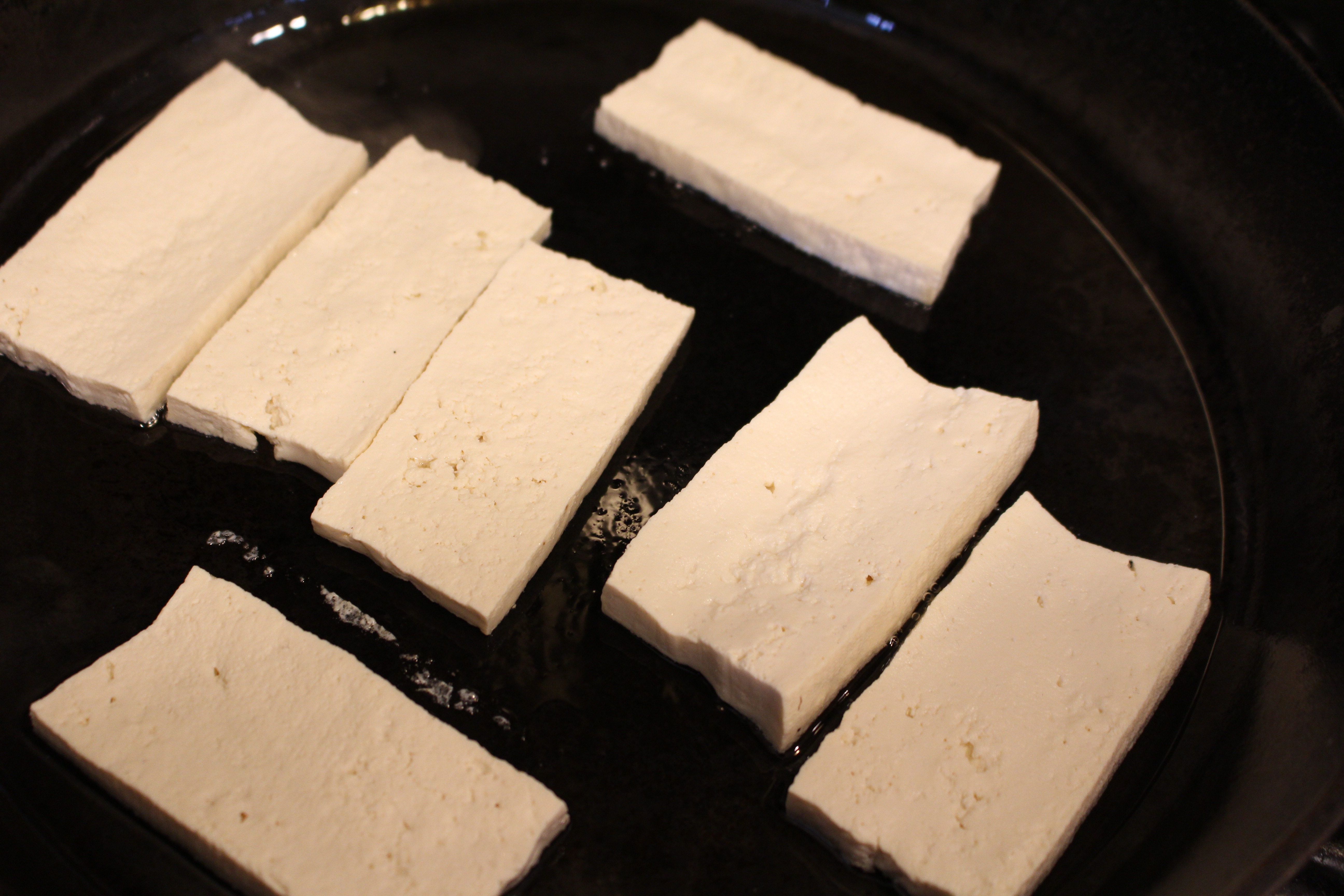 - Meanwhile, cover bottom of cast iron frying pan with oil, and sauté the tofu slices until golden brown on each side. Remove from pan and set aside.