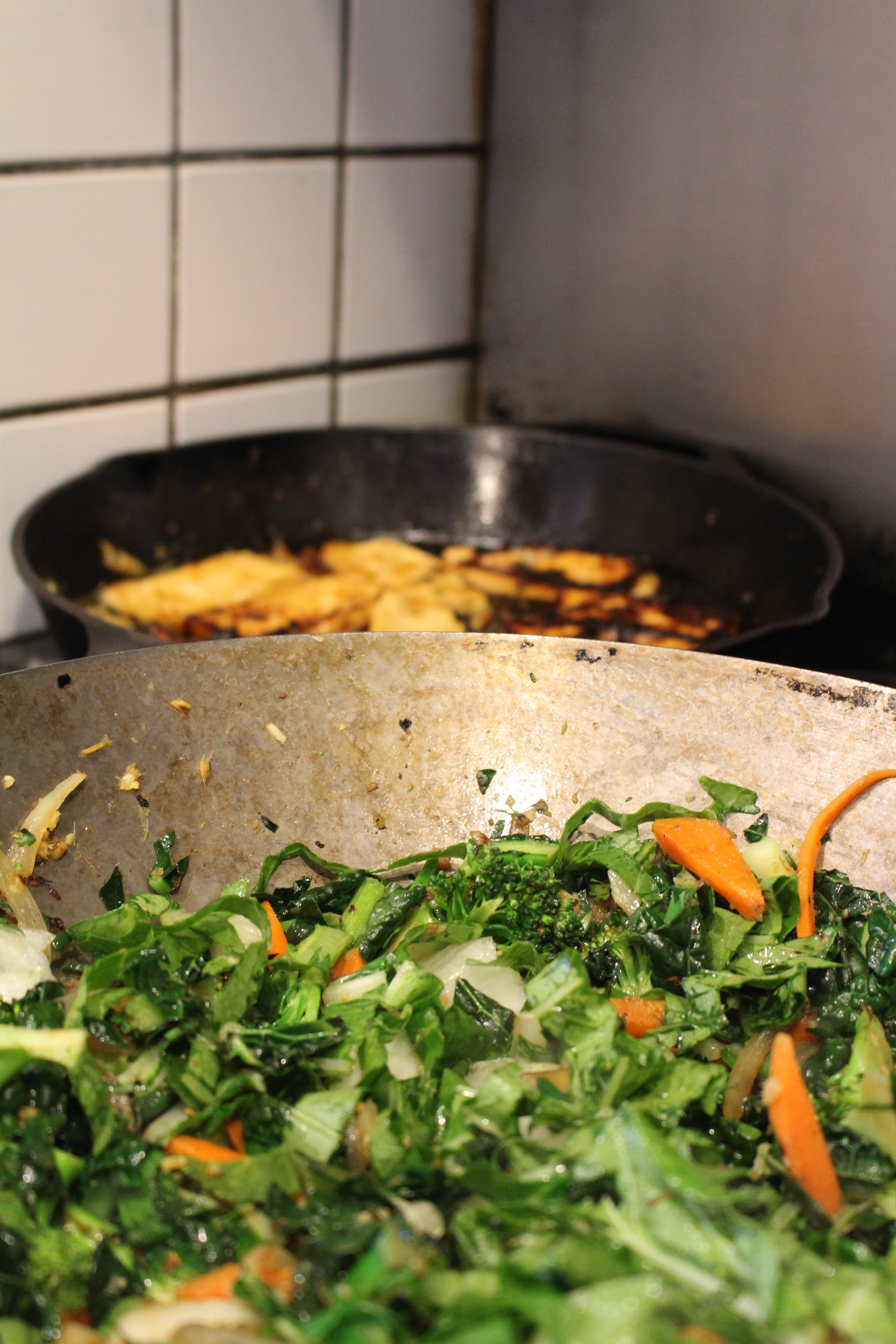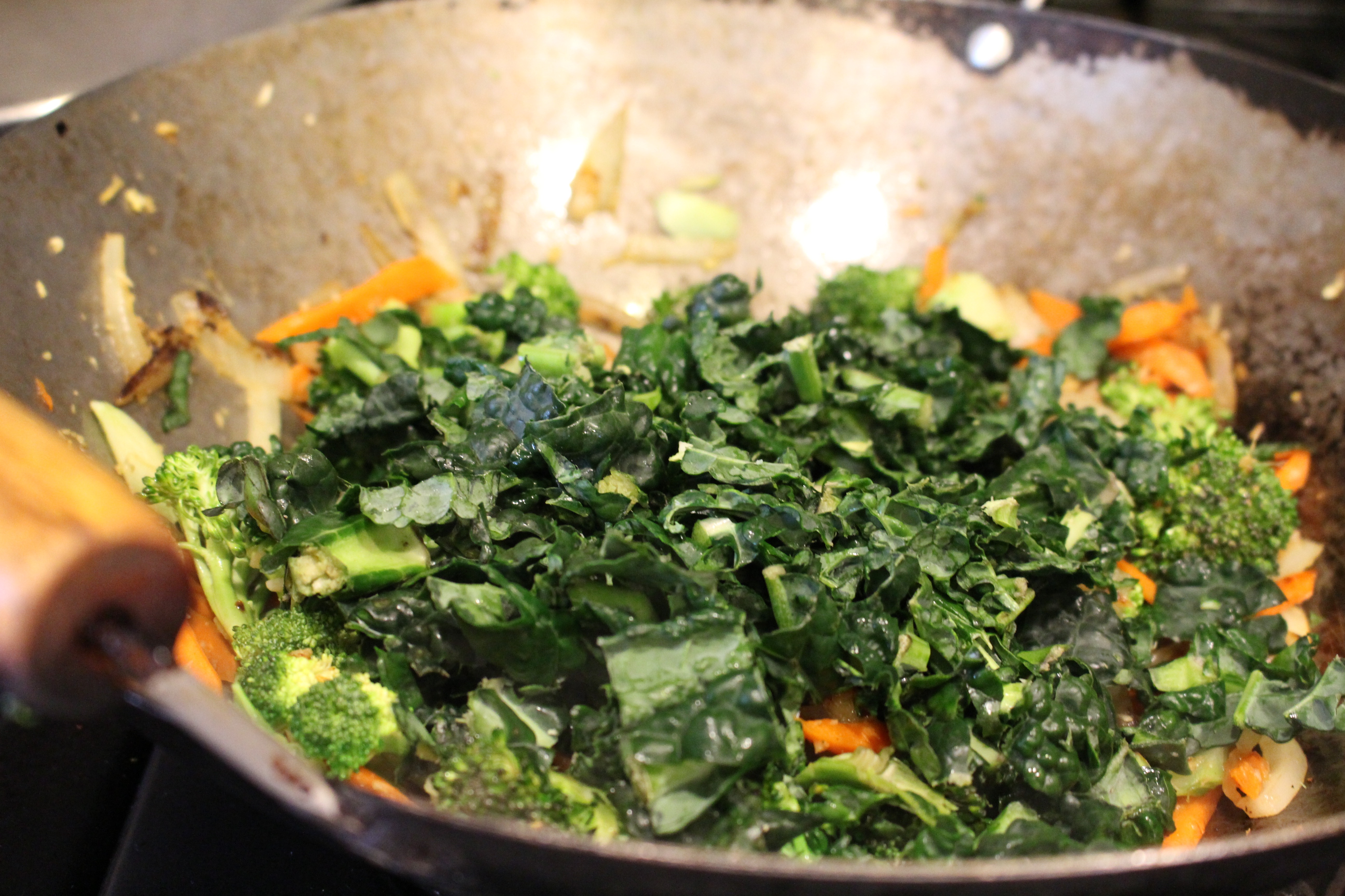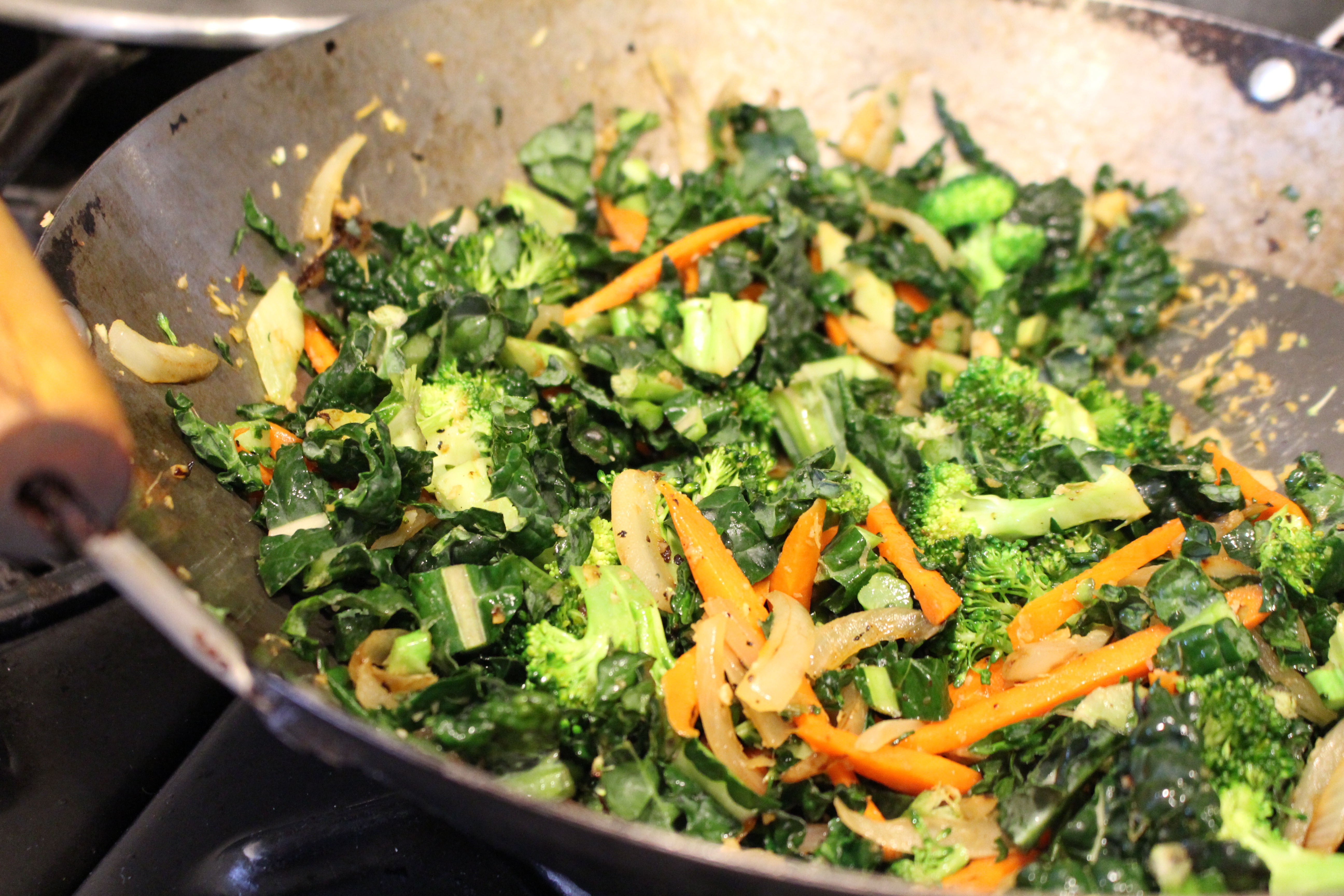 - Meanwhile, cover bottom of wok with oil. When oil is hot, add the onions, carrots, ginger and garlic. Cook until the onions and carrots are soft, then add the cumin, Chinese Five Spice and 2 Tbs. Tamari. Continue cooking at med. high heat, stirring constantly for 3 more minutes. Add the broccoli and the greens, cook for a few minutes, then add ¼ cup orange juice.