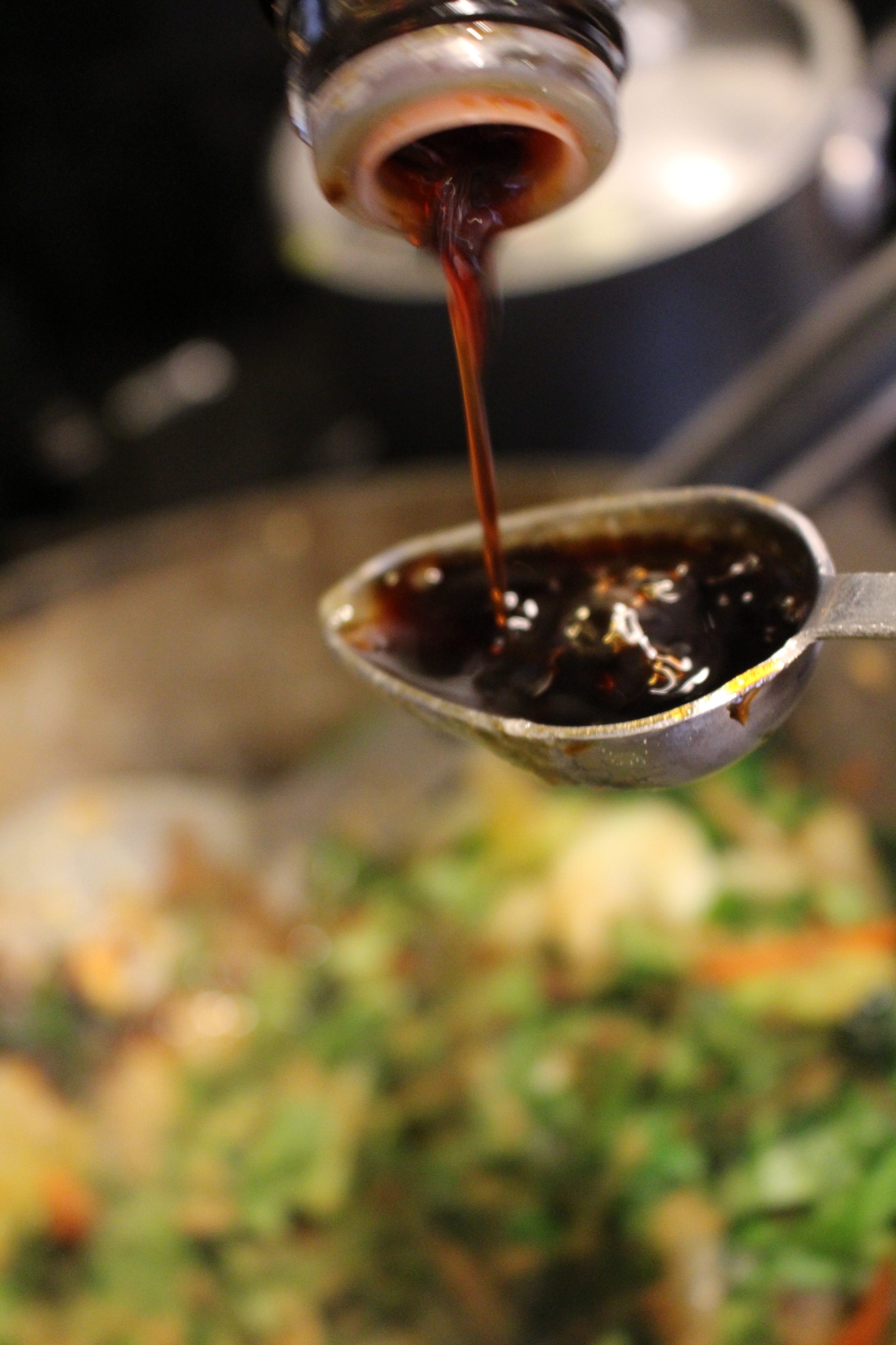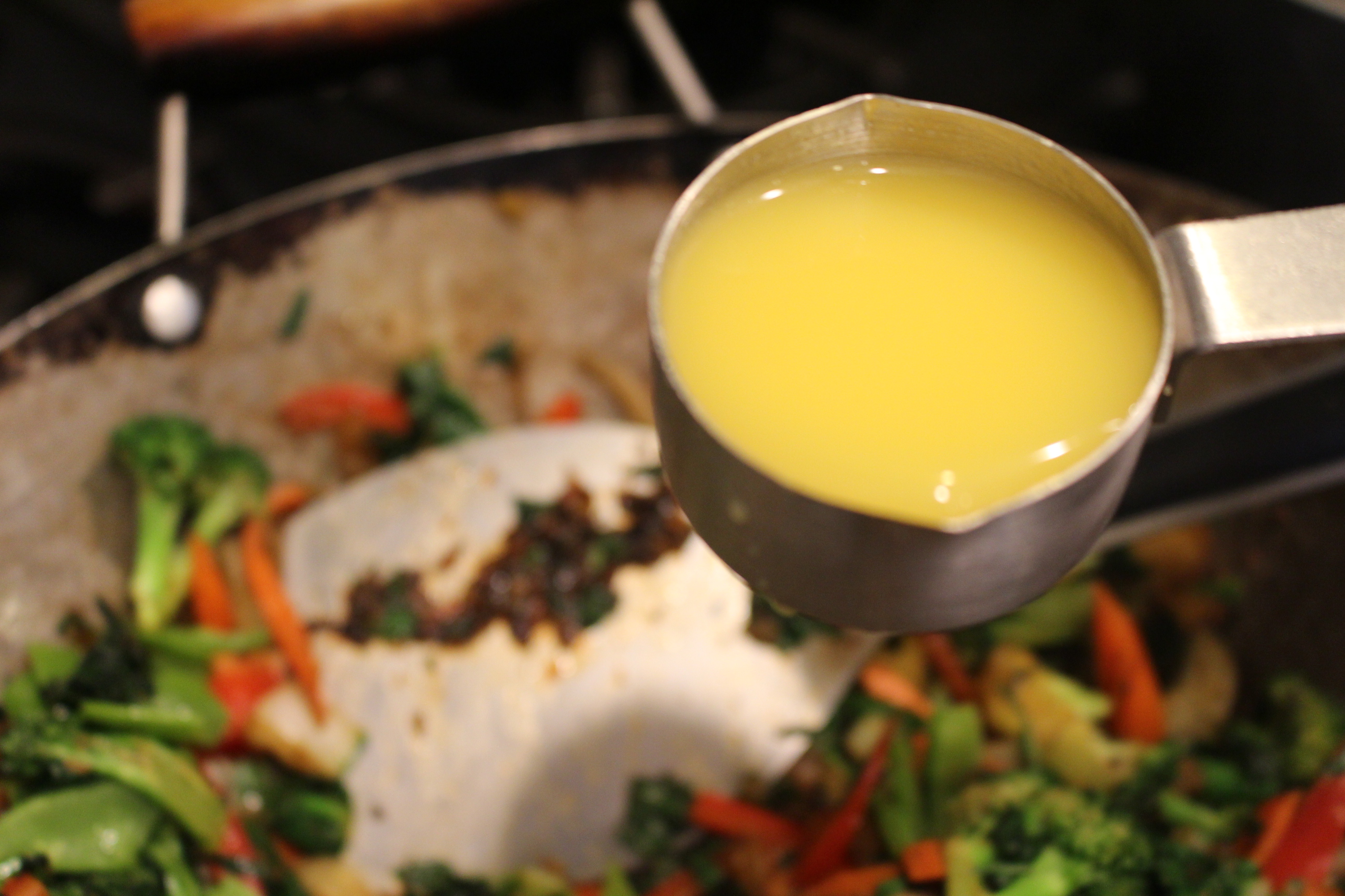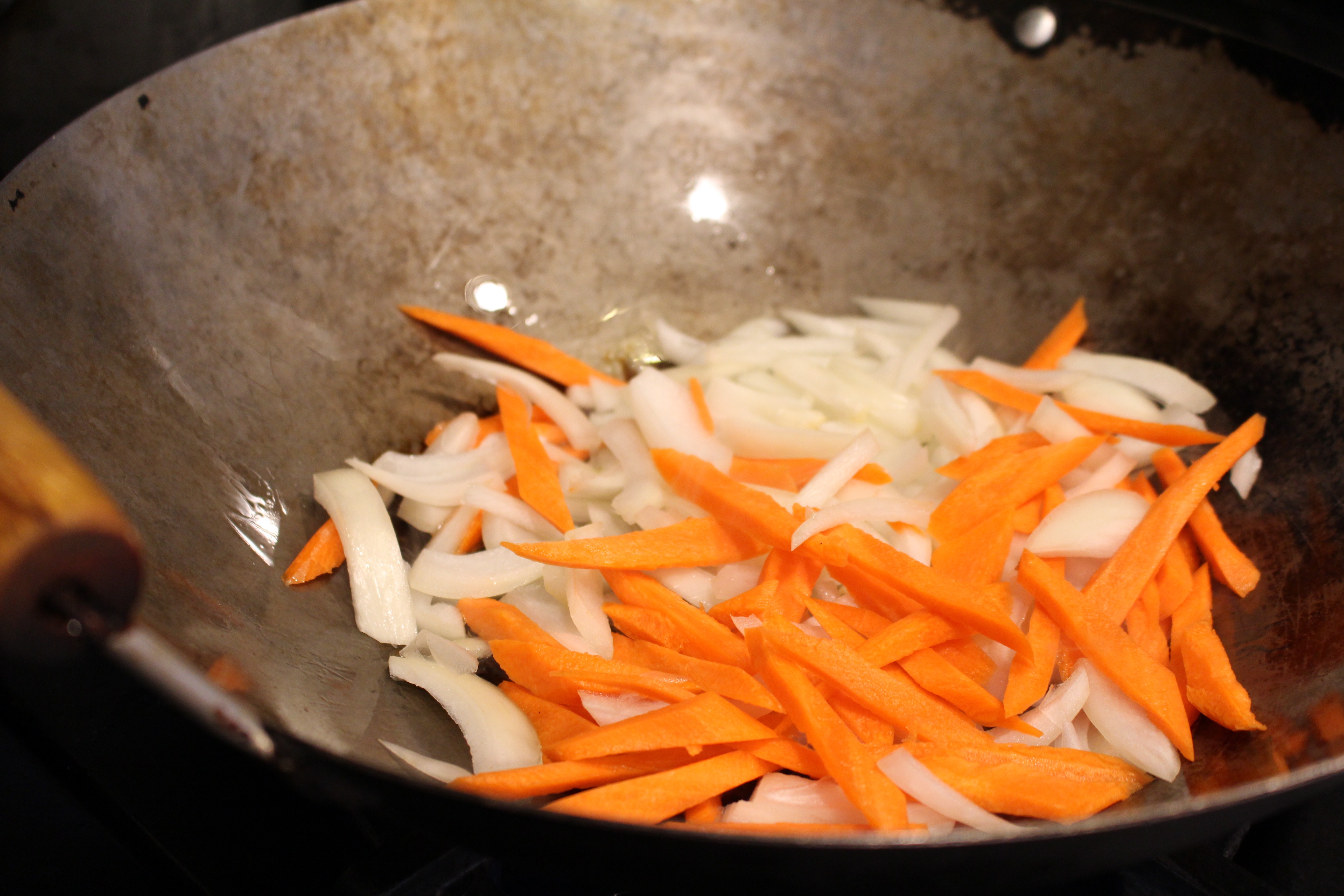 - Meanwhile, cover bottom of wok with oil. When oil is hot, add the onions, carrots, ginger and garlic. Cook until the onions and carrots are soft, then add the cumin, Chinese Five Spice and 2 Tbs. Tamari. Continue cooking at med. high heat, stirring constantly for 3 more minutes. Add the broccoli and the greens, cook for a few minutes, then add ¼ cup orange juice.