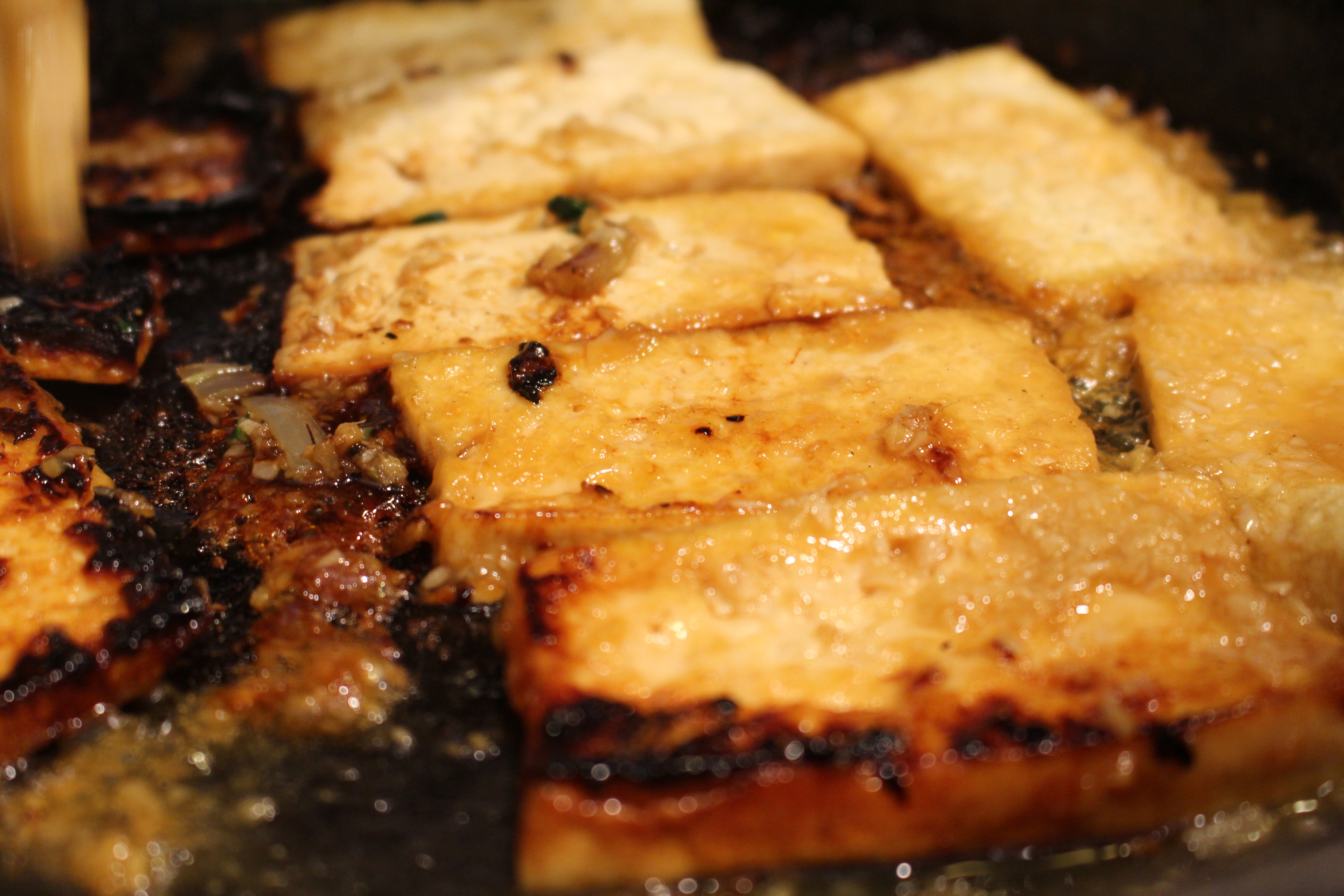 - Meanwhile, cover bottom of cast iron frying pan with oil, and sauté the tofu slices until golden brown on each side. Remove from pan and set aside