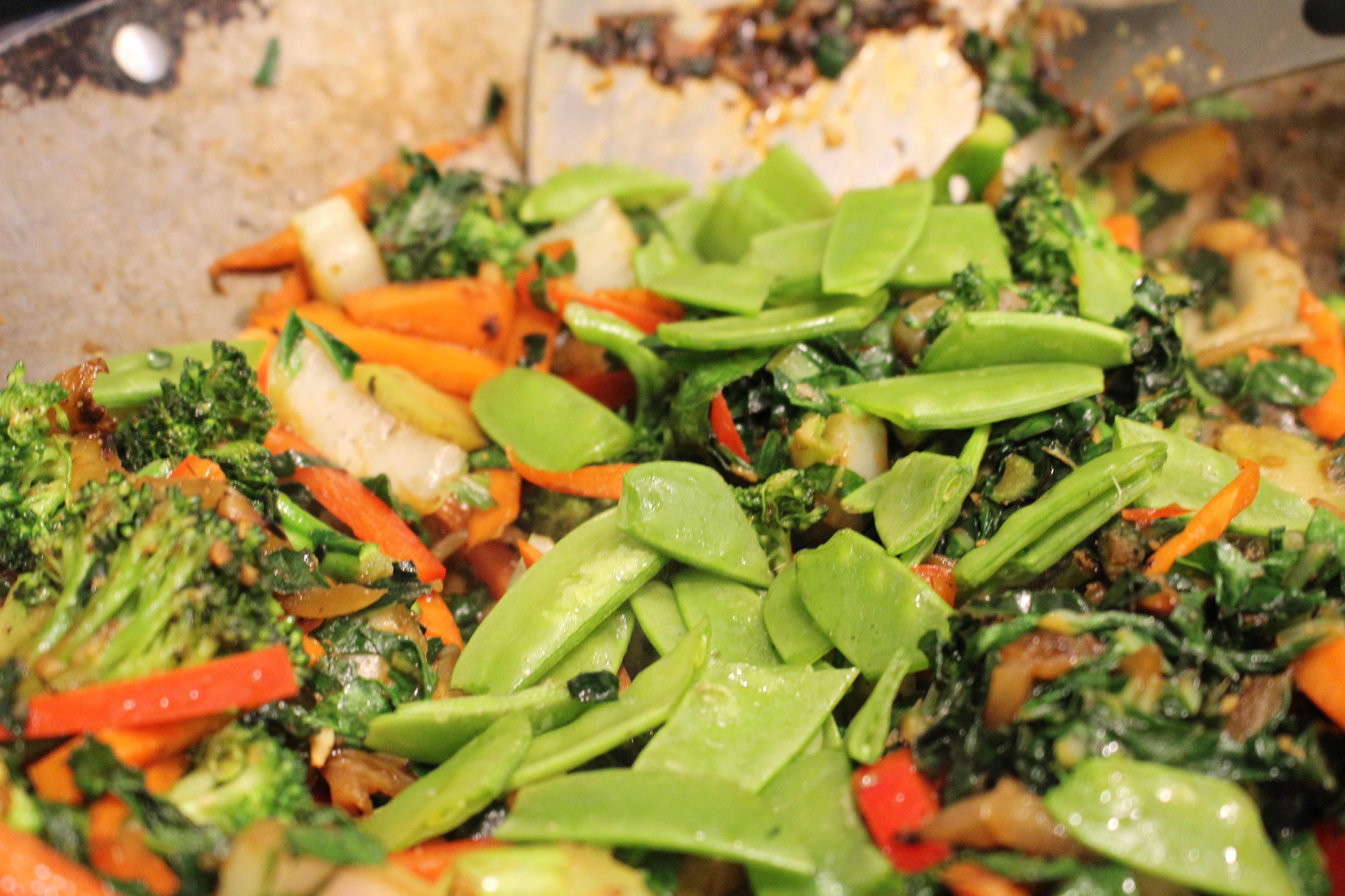 - When vegetables are cooked (they should be cooked, but not too soft), add the red pepper and snow peas, parsley, cilantro, and almonds. Adjust S + P to taste