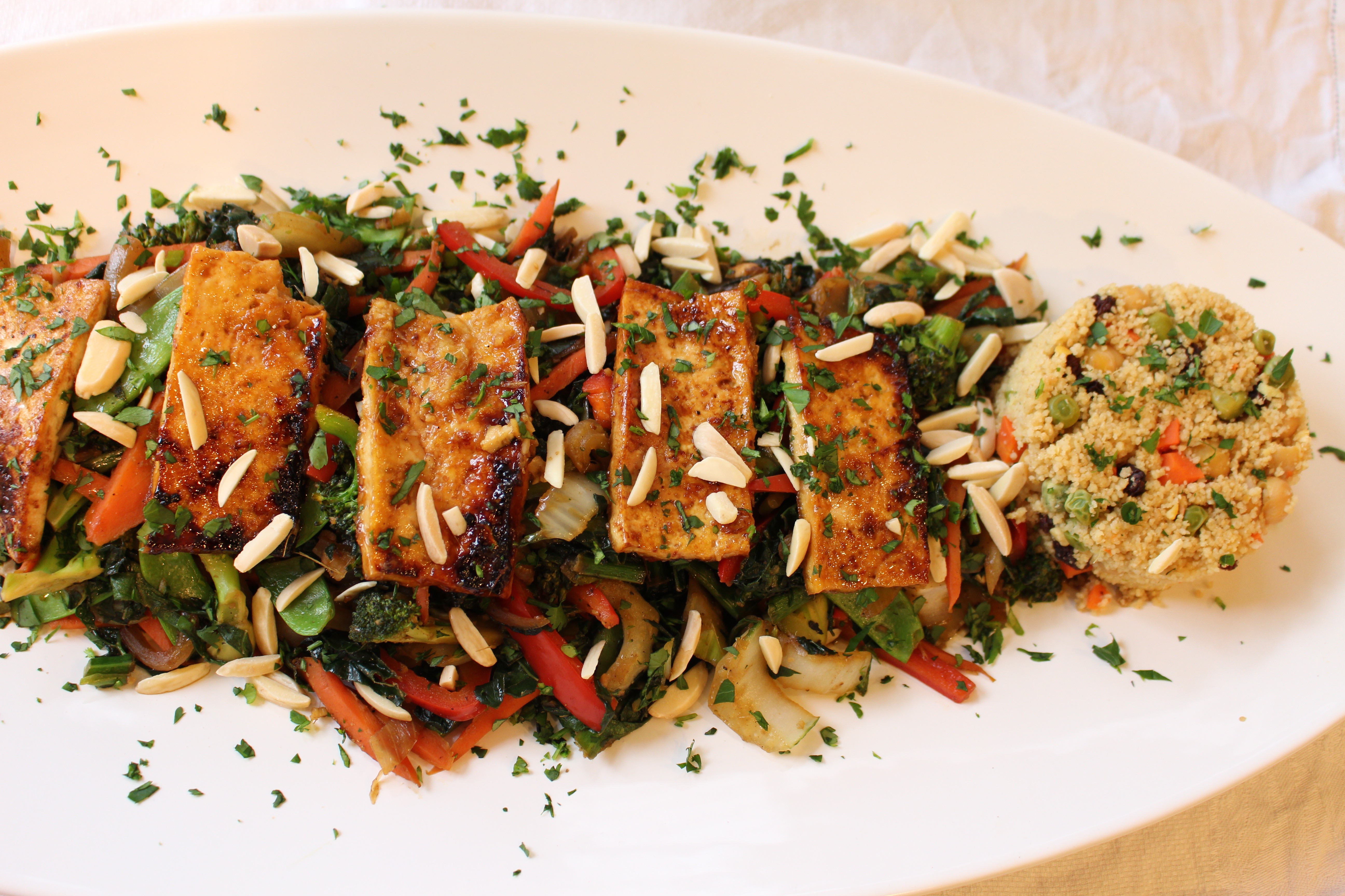 - When vegetables are cooked (they should be cooked, but not too soft), add the red pepper and snow peas, parsley, cilantro, and almonds. Adjust S + P to taste.