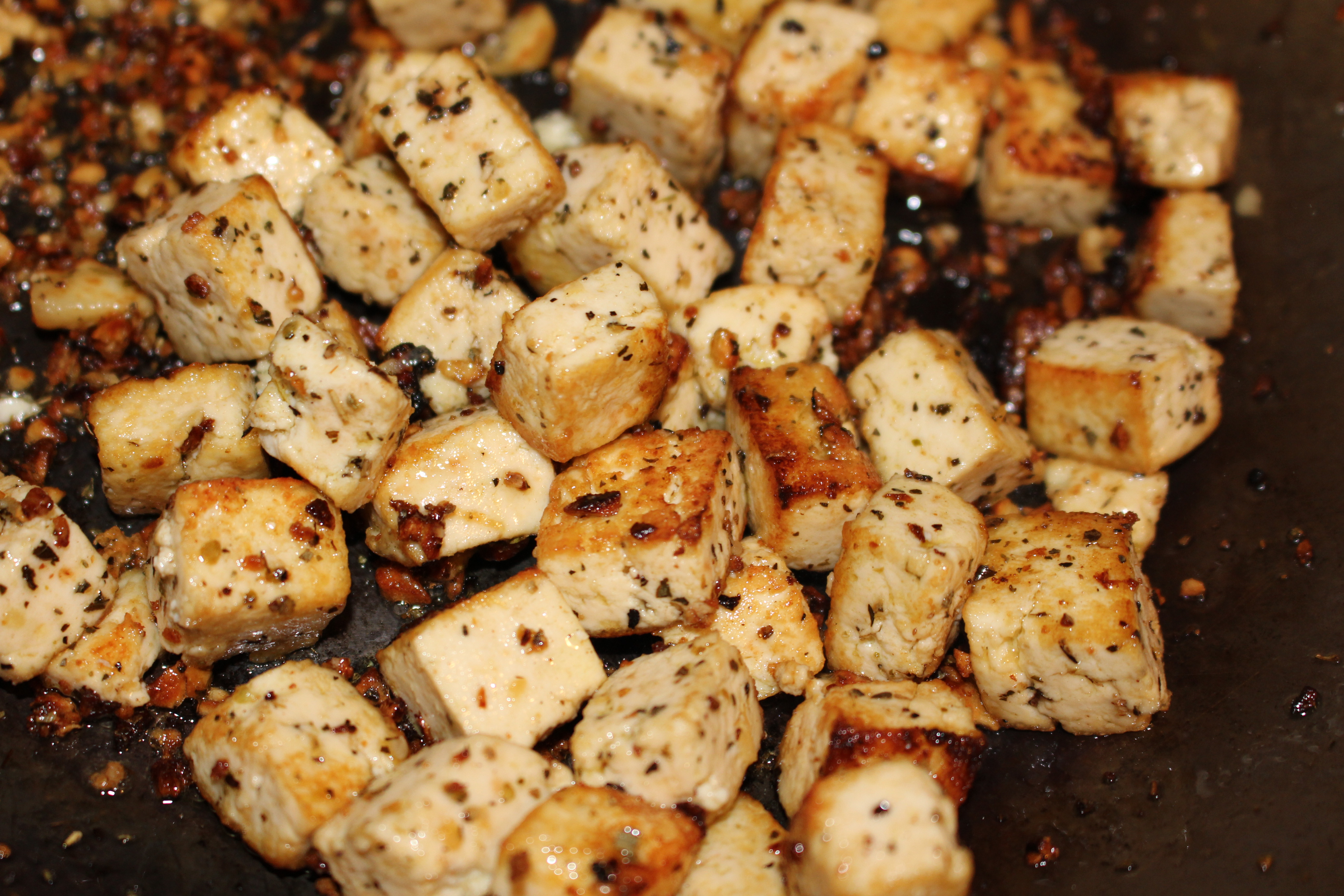 - Sauté until golden brown on all sides. Remove from pan and discard burnt garlic. Repeat with other half of tofu.
