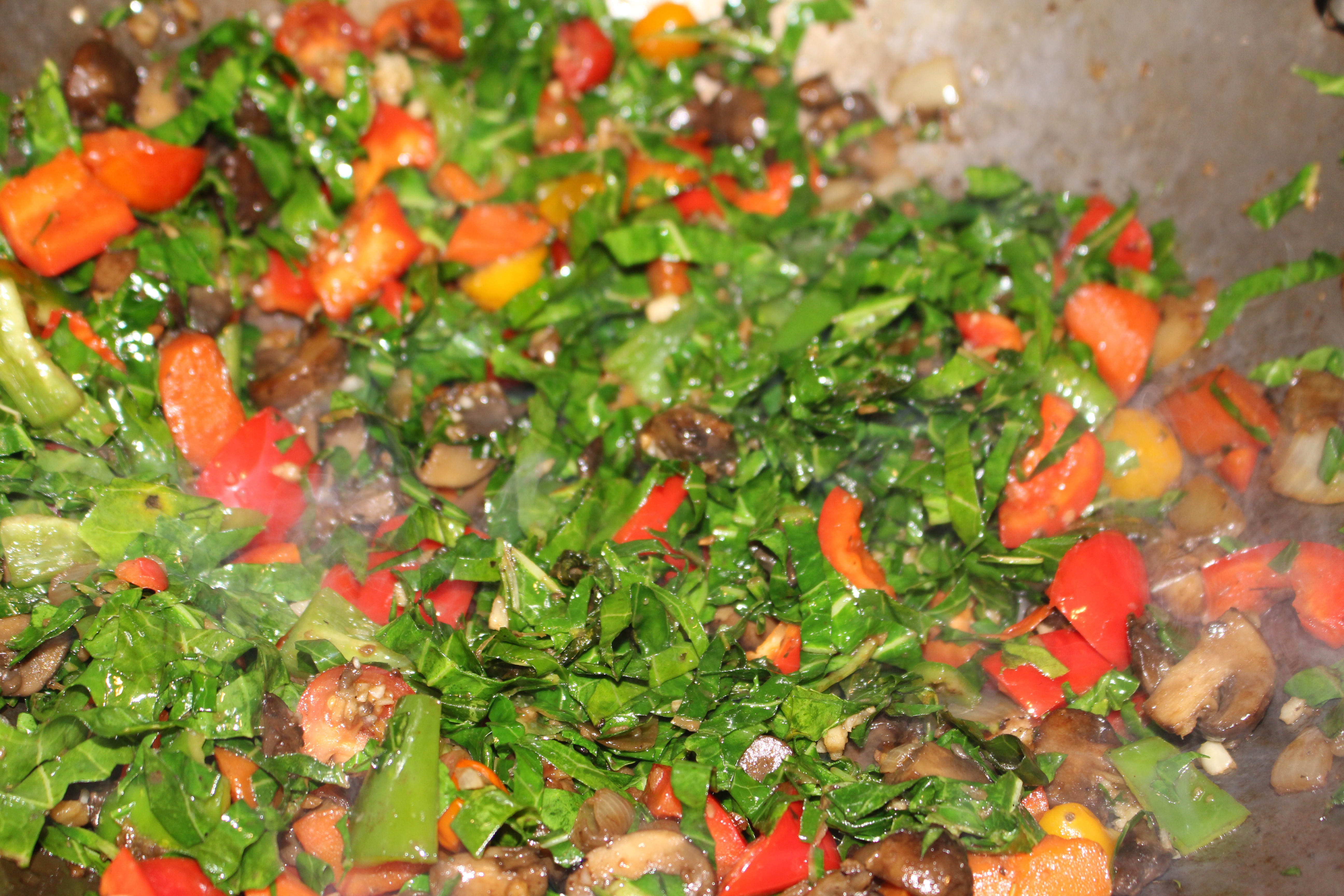 - Cook until wine is absorbed. Add the peppers and collard greens, a little salt and pepper, and then deglaze the pan with the ¼ cup of white wine.