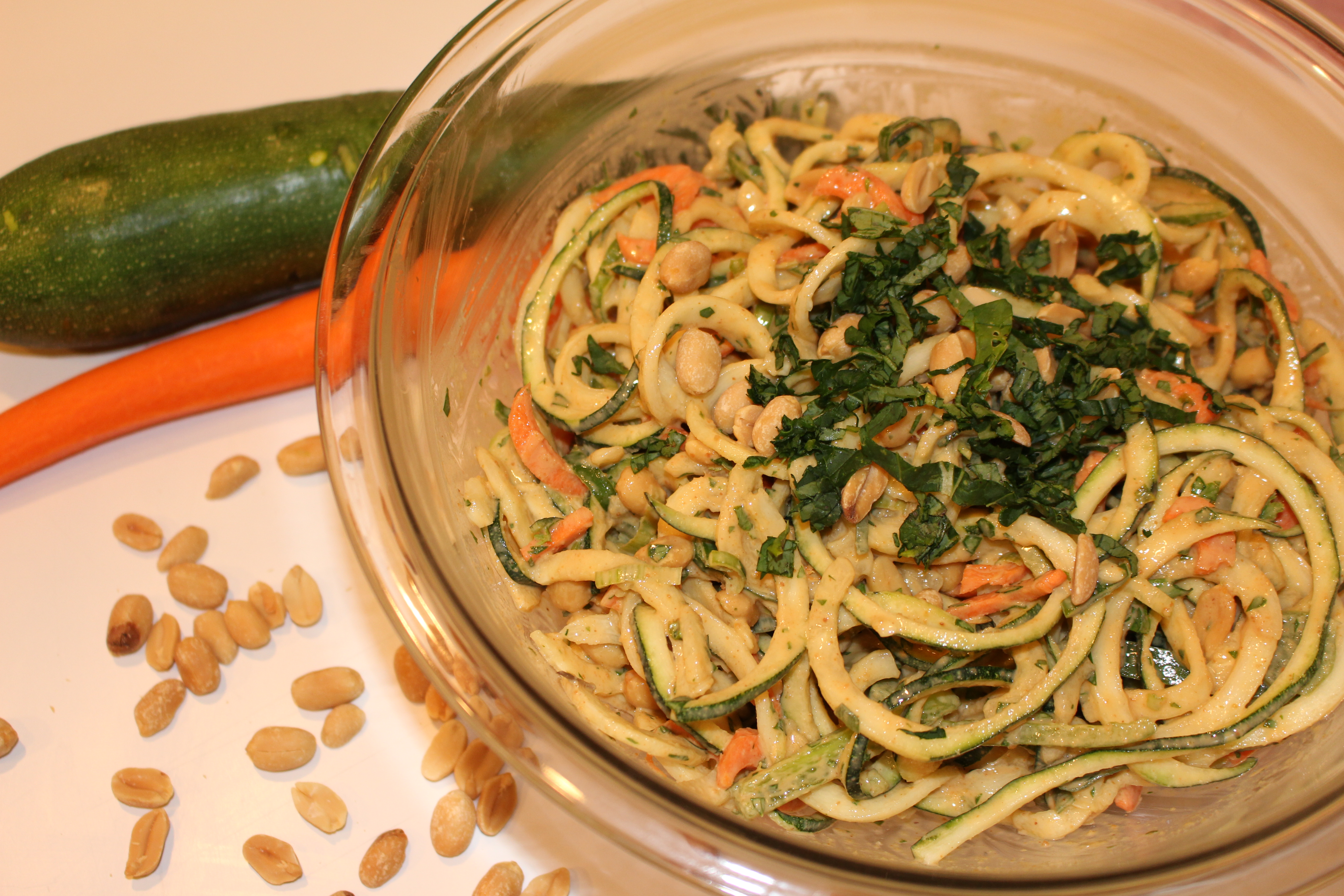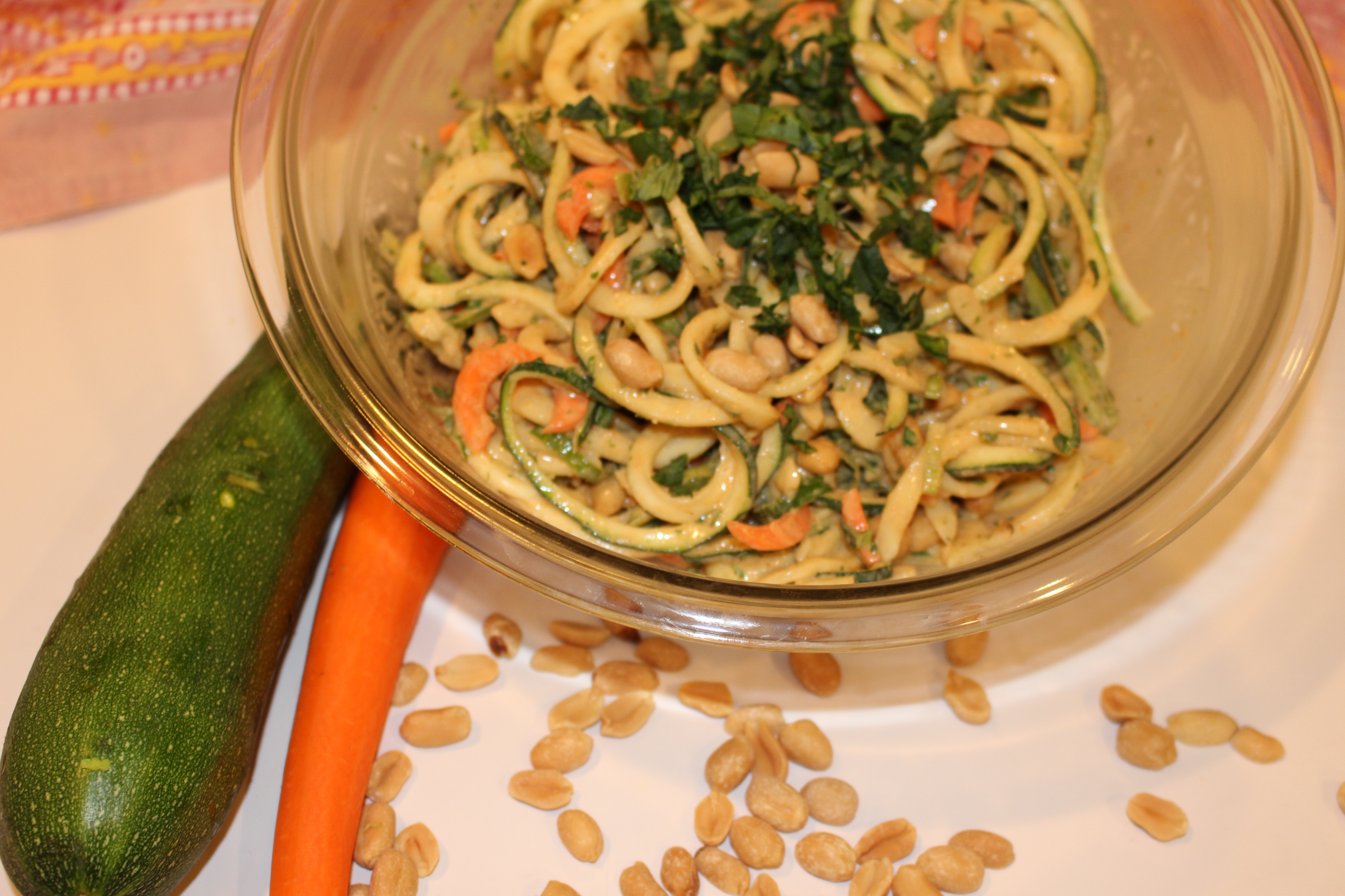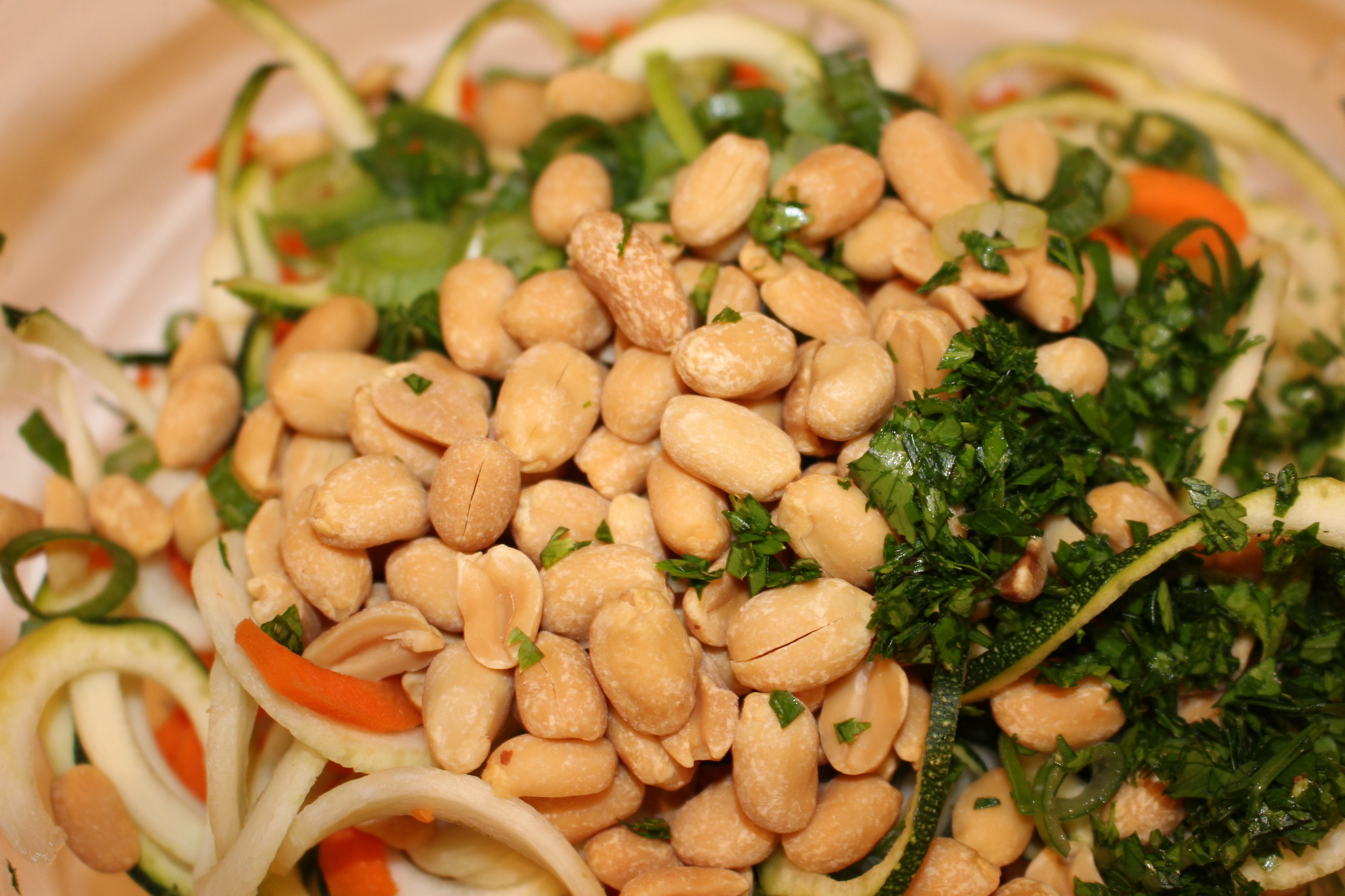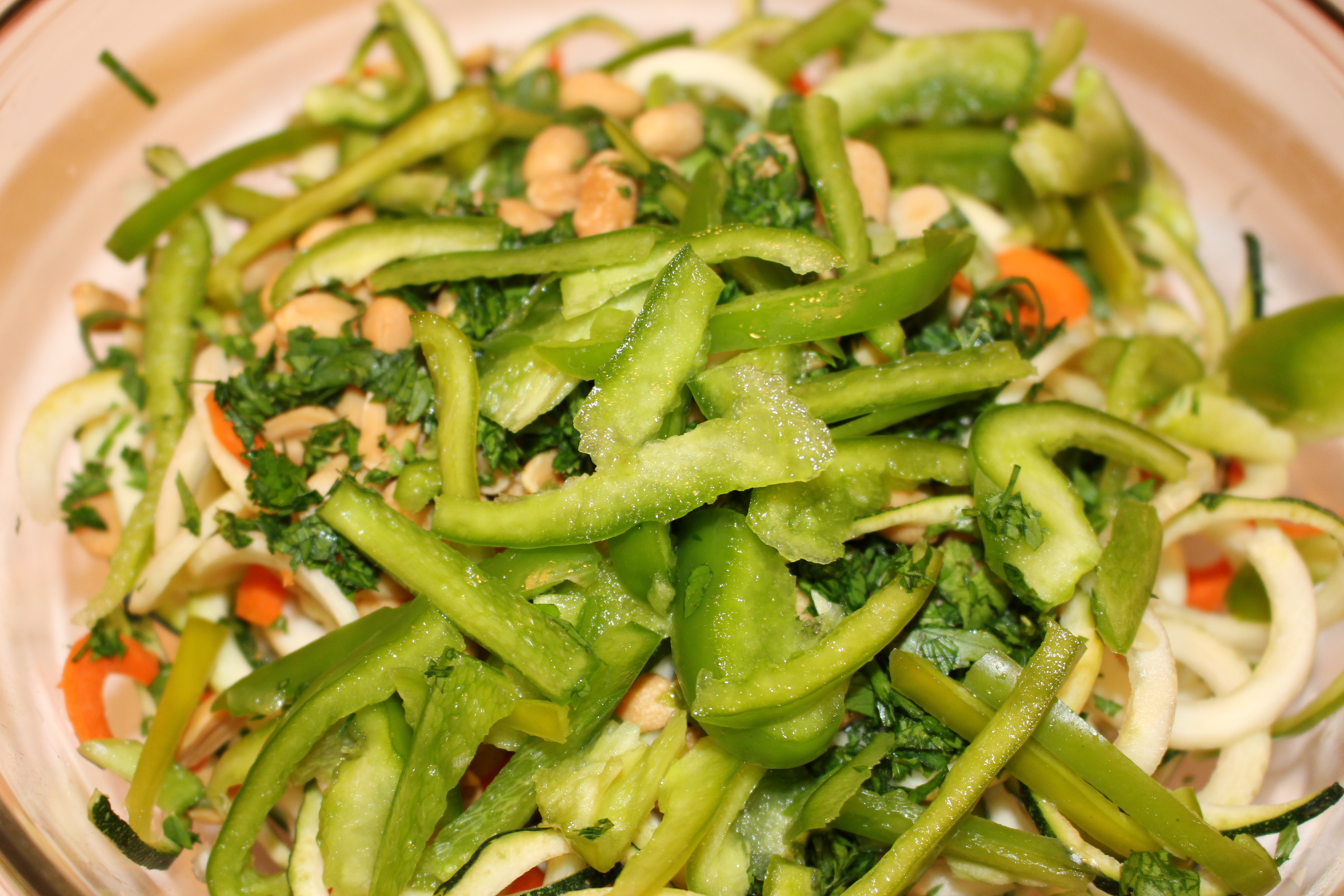 - In large bowl, combine the zucchini, carrots, green pepper, scallions, parsley, and peanuts.