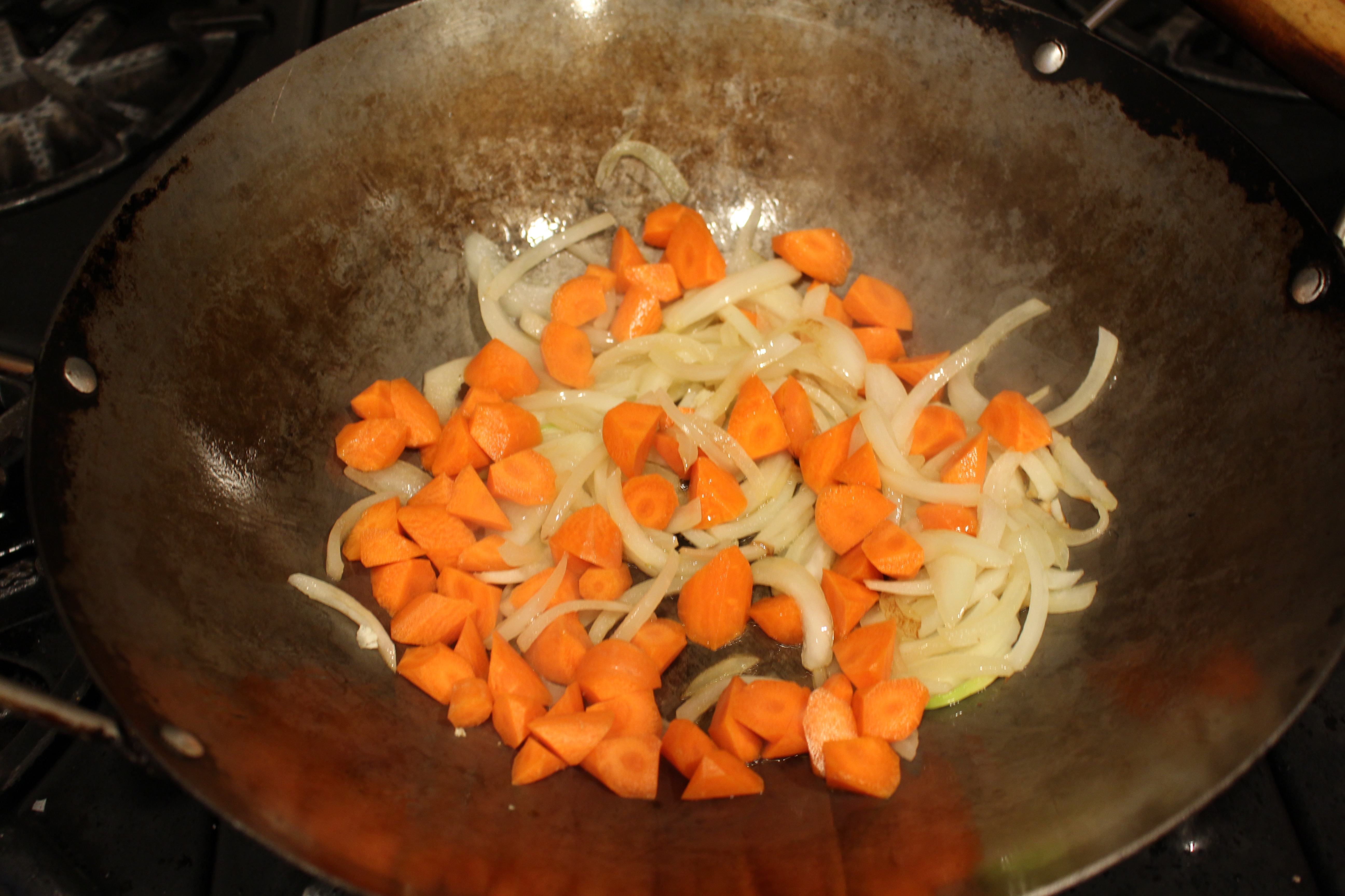 1. Cover the bottom of wok with oil. When oil is hot, add the onions.