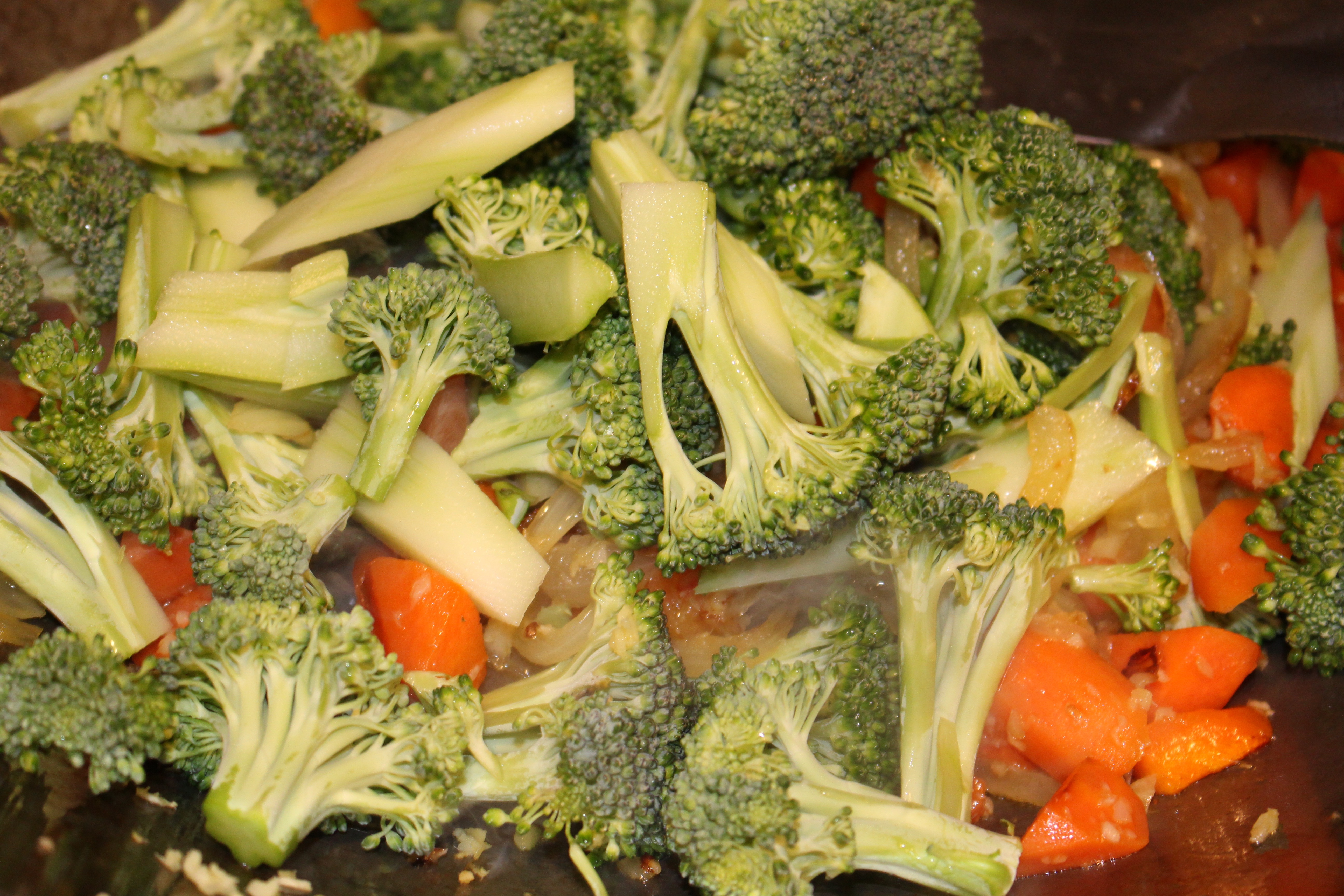 Continue cooking at medium-high heat, stirring constantly for 5 minutes. Then add the broccoli, and add more oil or a little water if needed.