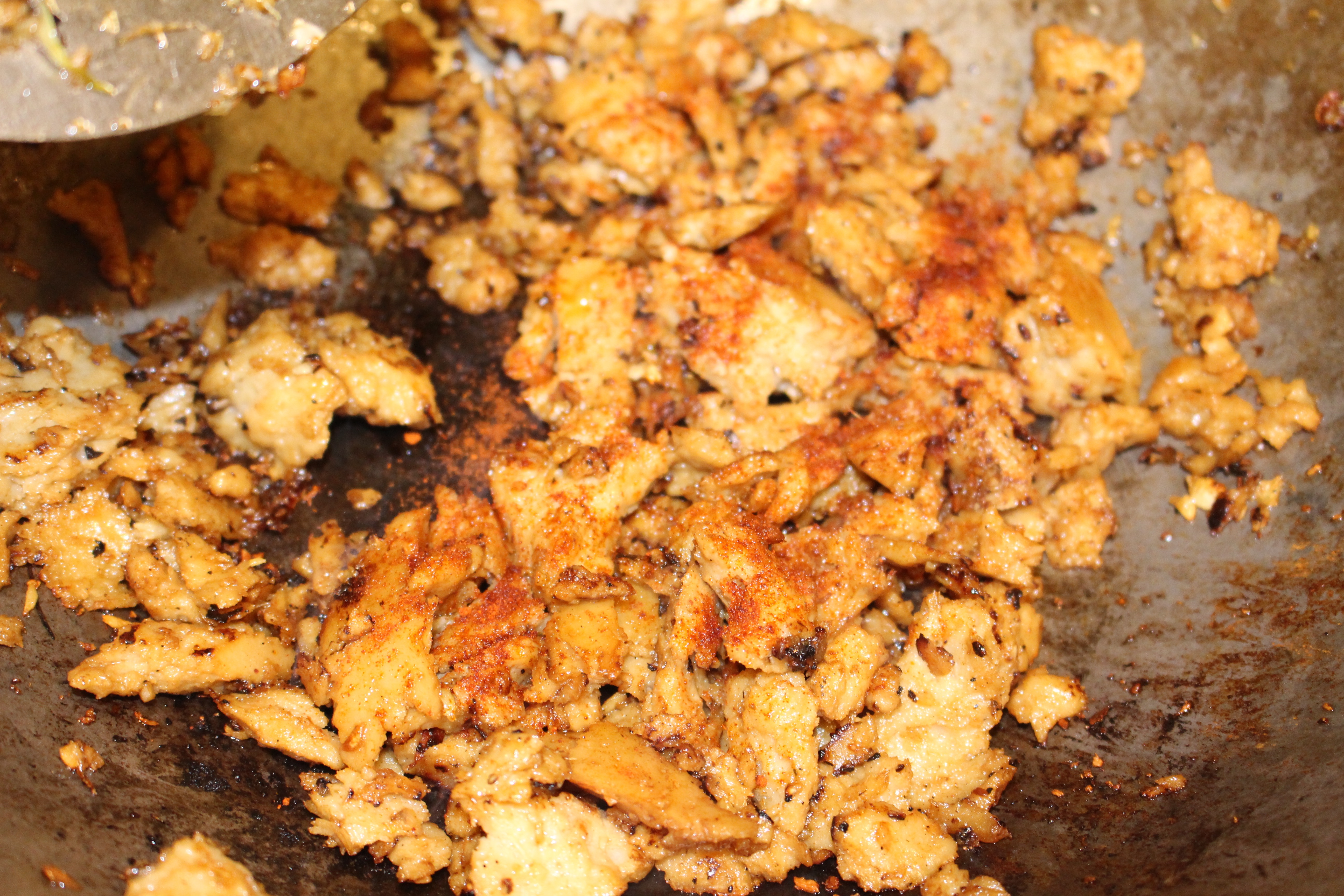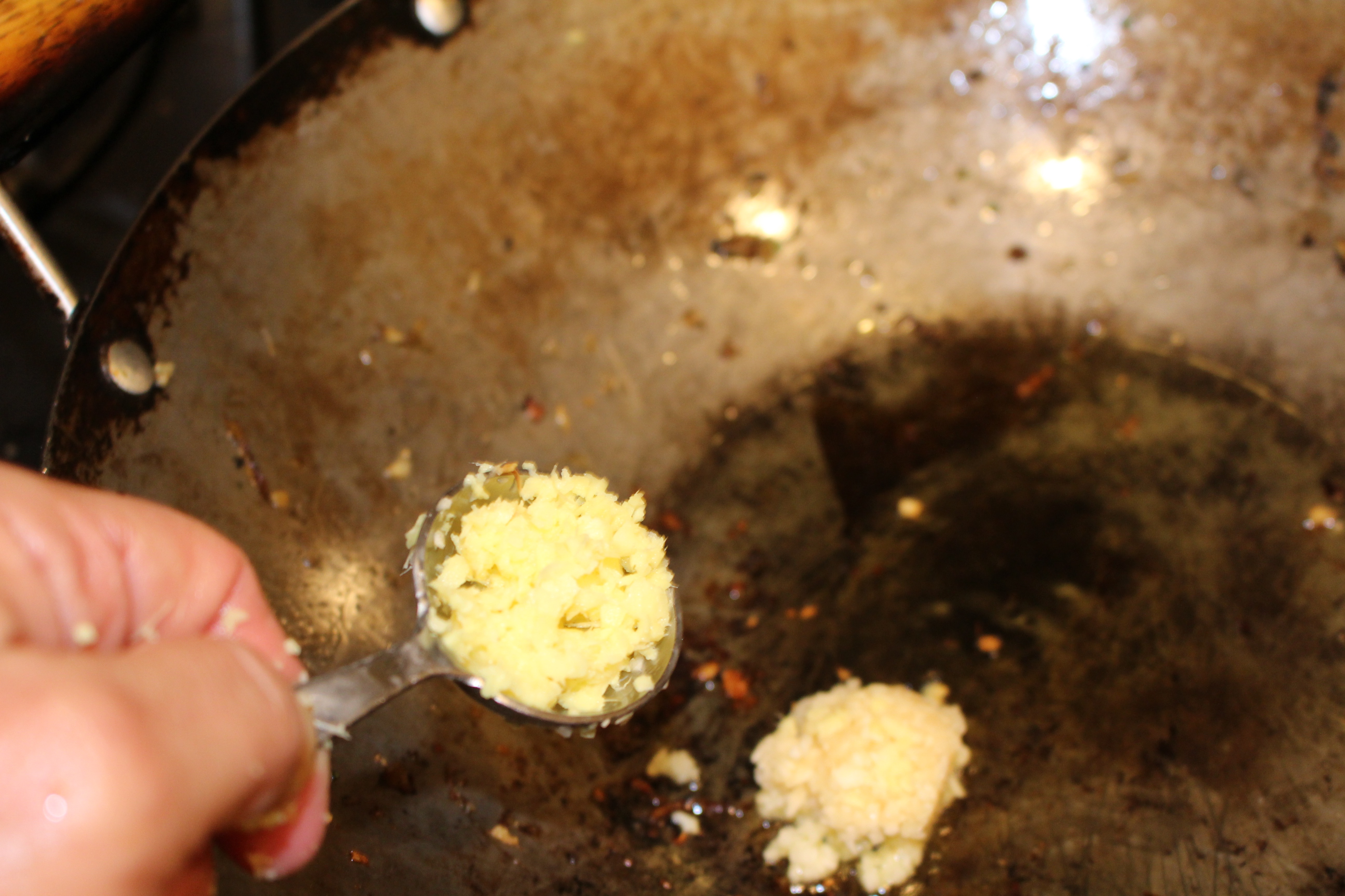 5. Add more oil to the bottom of the wok. Add the remaining ginger and garlic to the wok and cook for 30 seconds. Add the seitan, and sear that for 5 minutes.