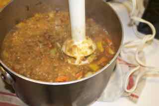 4. With an immersion blender, partially blend the soup, leaving some texture to the soup.