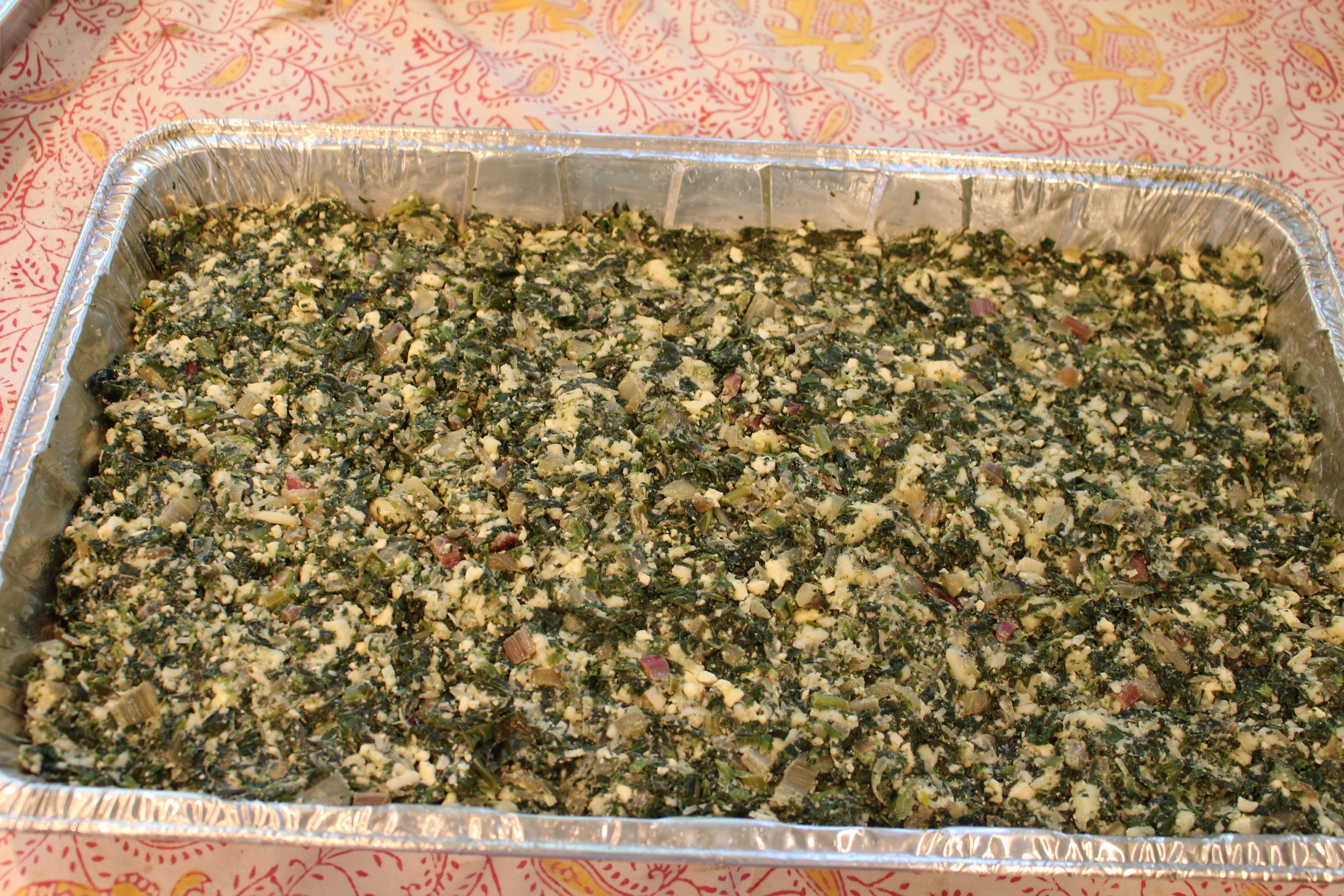 Lay out first sheet of filo, on the bottom of chaffing pan. Use a piece of the cut off pastry to add to the length. Brush with oil/butter mixture, using a wide pastry brush. Repeat and continue layering the filo pastry. You want to use half of the filo for the bottom, and half of the filo for the top. Usually, there are about 20 sheets in the box, so use 8-10 sheets on the bottom, then spread the kale/swiss chard/ cheese filling out evenly on top of the layered filo pastry. Press the filling down gently, evening it out all around.