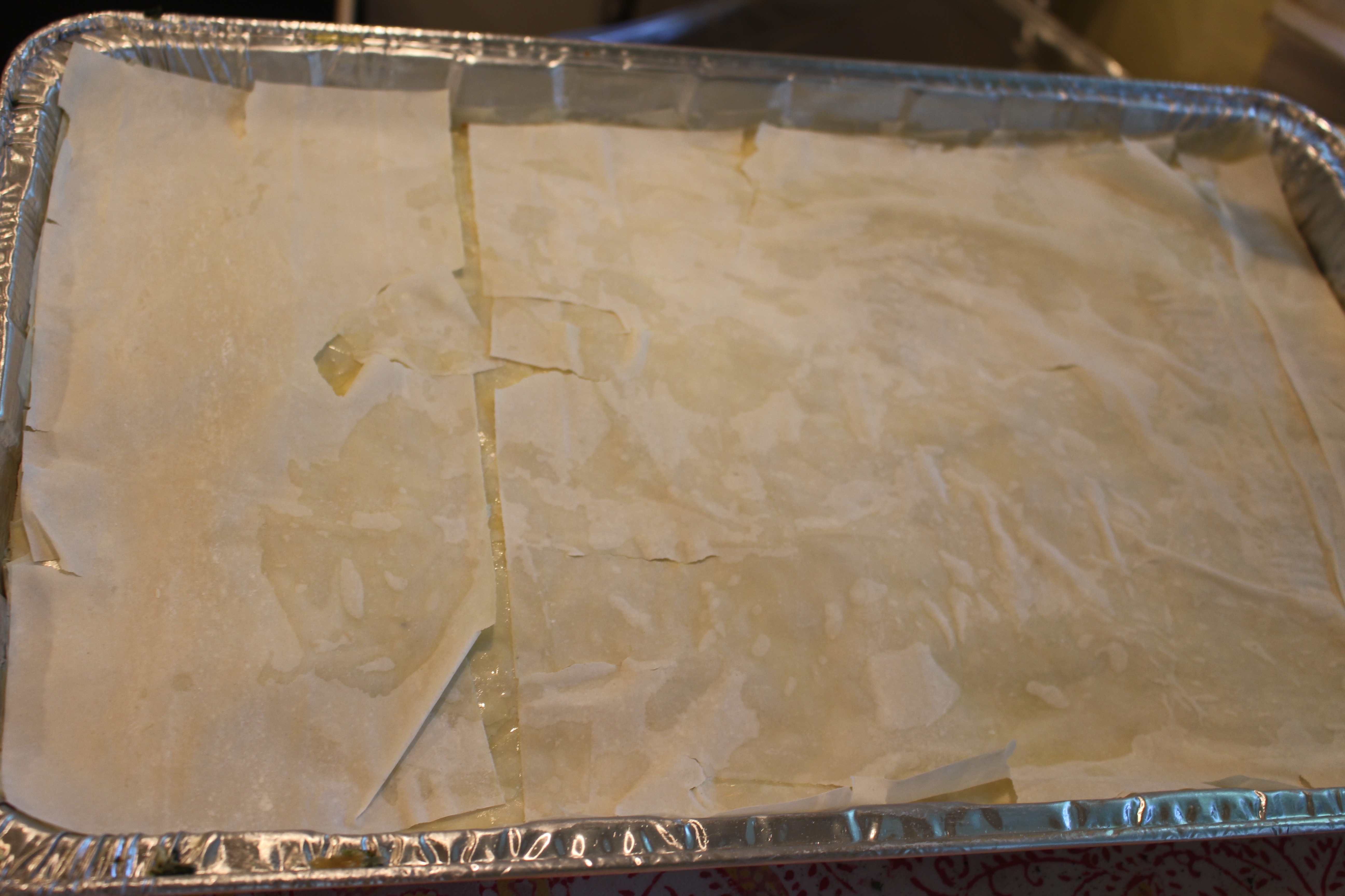 - Open filo pastry and lay out on work surface. The pastry is about 1” too wide for the chaffing pan and about 1” too short, so I cut 1” off of the width along the long side of the pastry, to make it narrower, and use the cut pieces to add to the length.