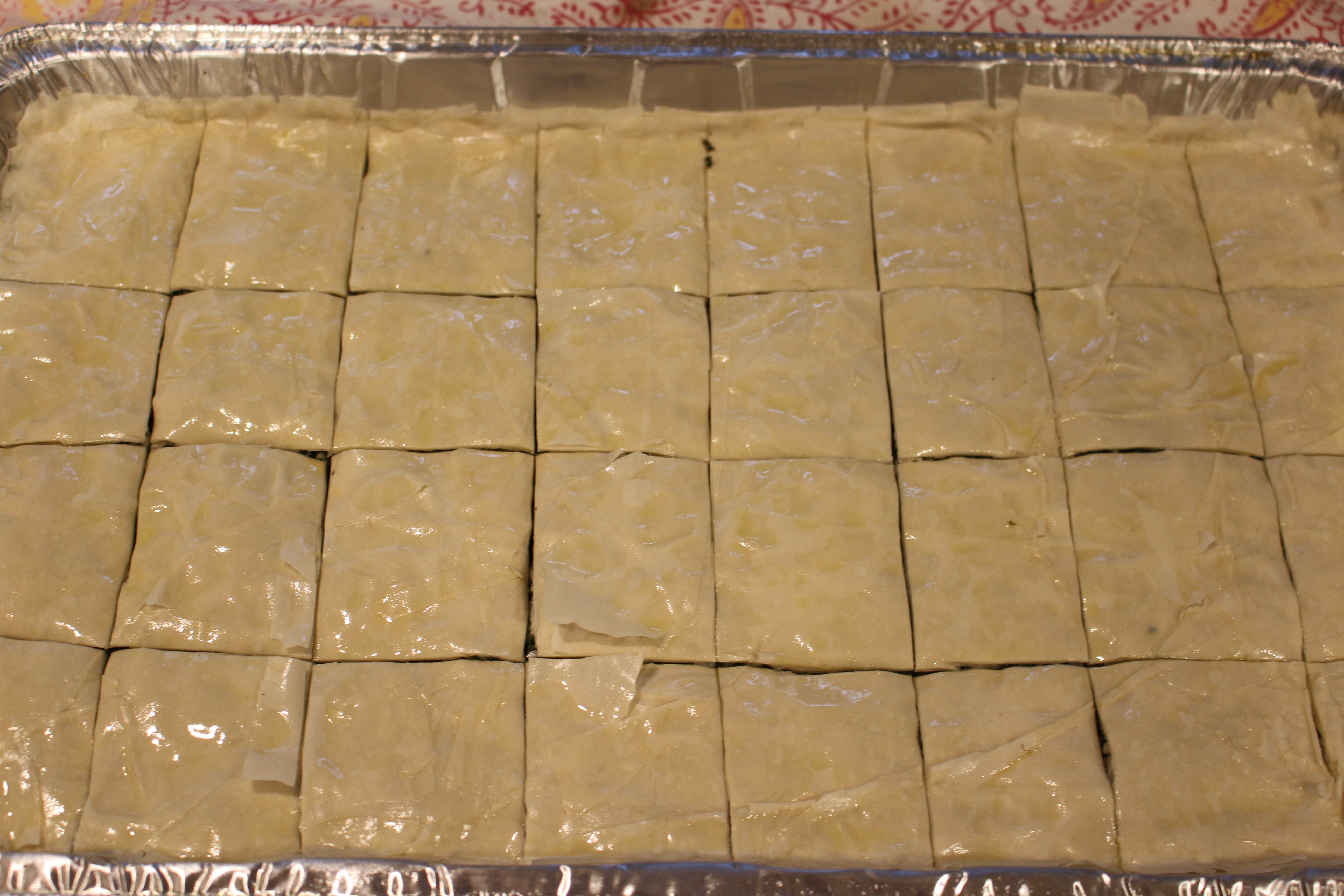 Then we are going to layer the filo sheets on the top, in the same manner as the bottom, brushing in between each layer with the butter/oil mixture until all of the filo is used up. It is easier to cut the pie before it is cooked. I cut it into 4 pieces across the short side, and then 6-8 pieces down the long side, depending on the portion size I want to serve. You will have a total of either 24 or 32 pieces.