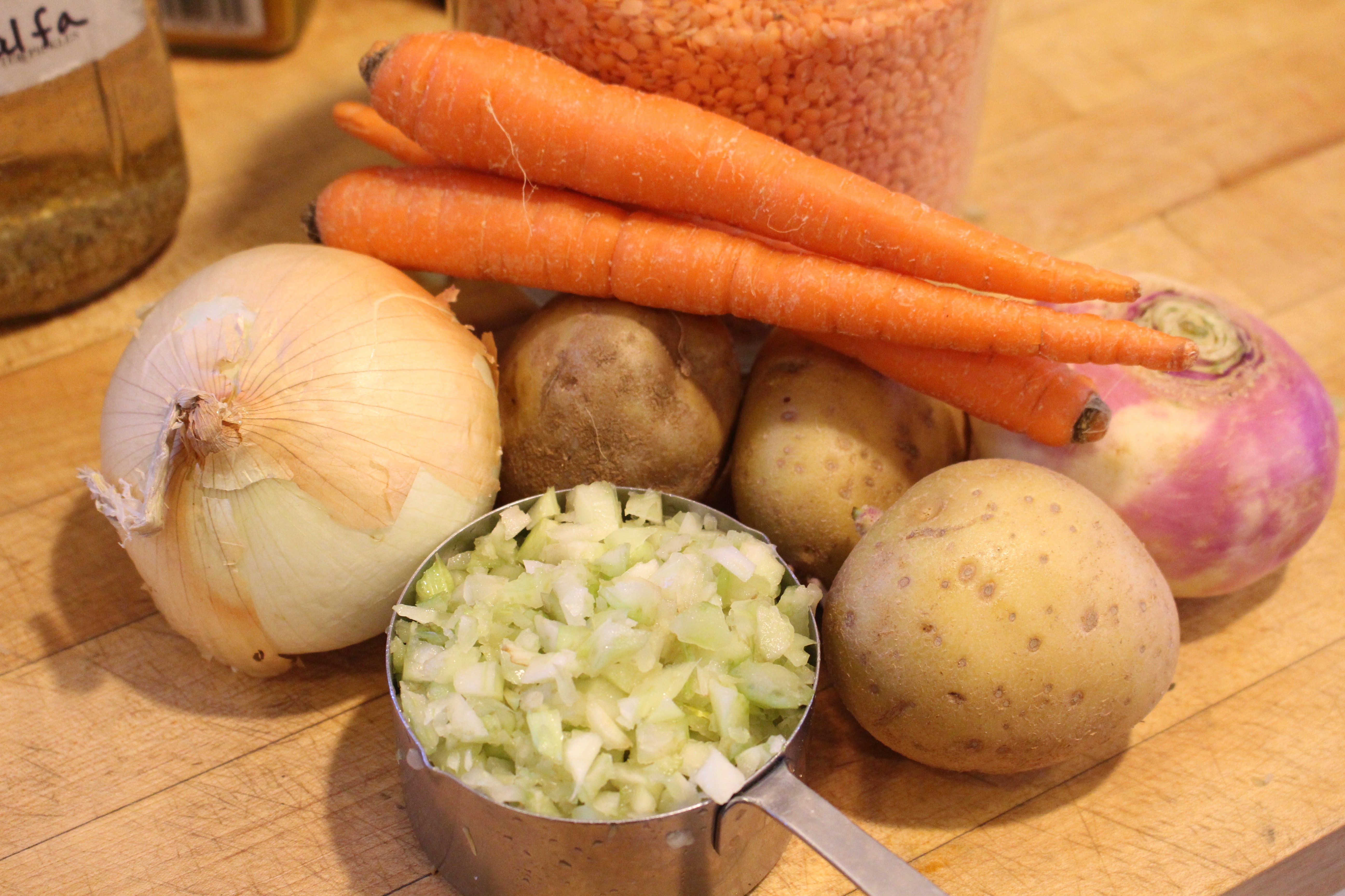 Rinse the lentils and put in a large pot with the water, turnip, and potatoes. Bring to a boil.