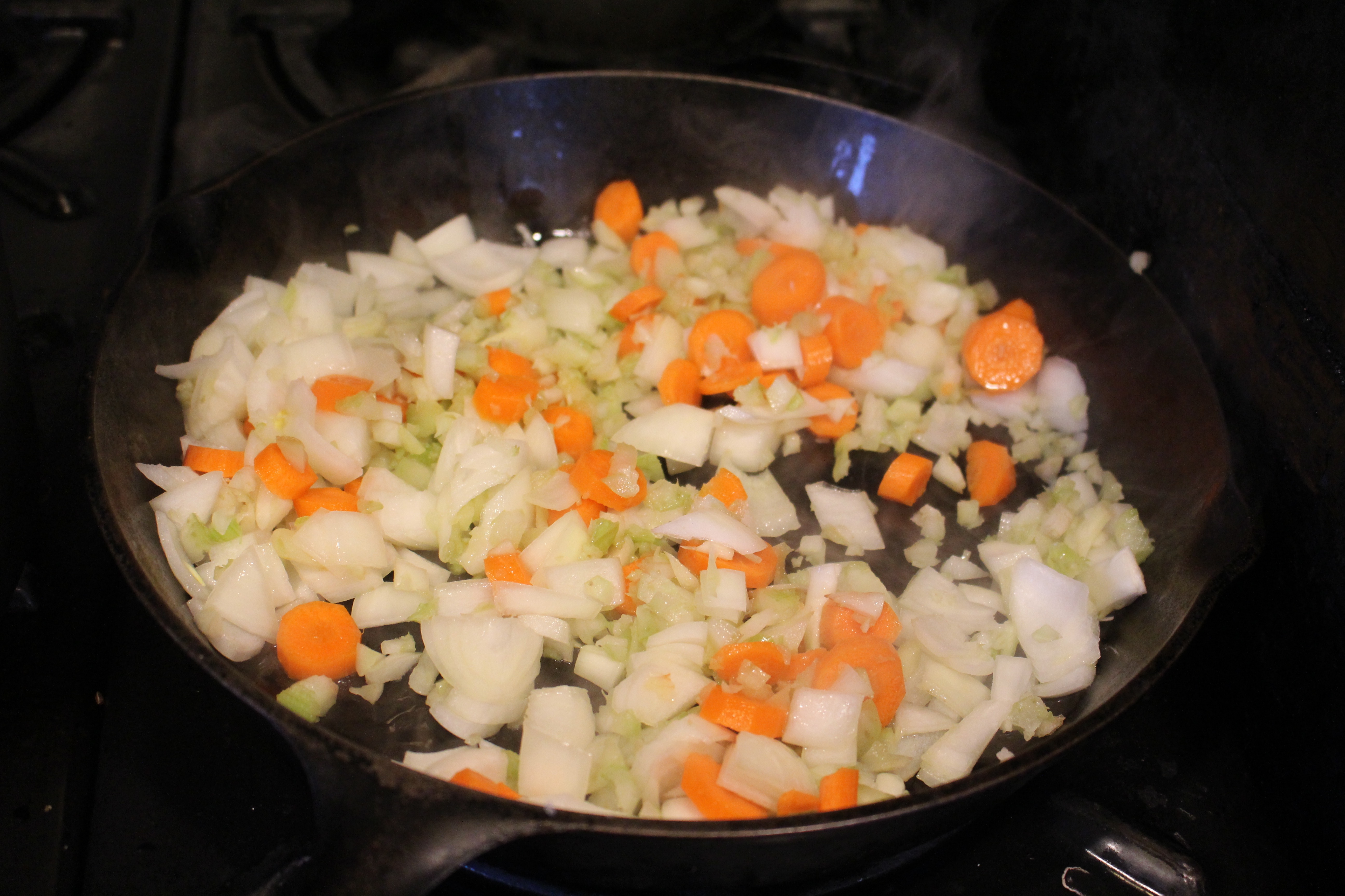 - Meanwhile, sauté the onions, celery, carrot, ginger, and garlic in olive oil for 5 min, or, until soft.