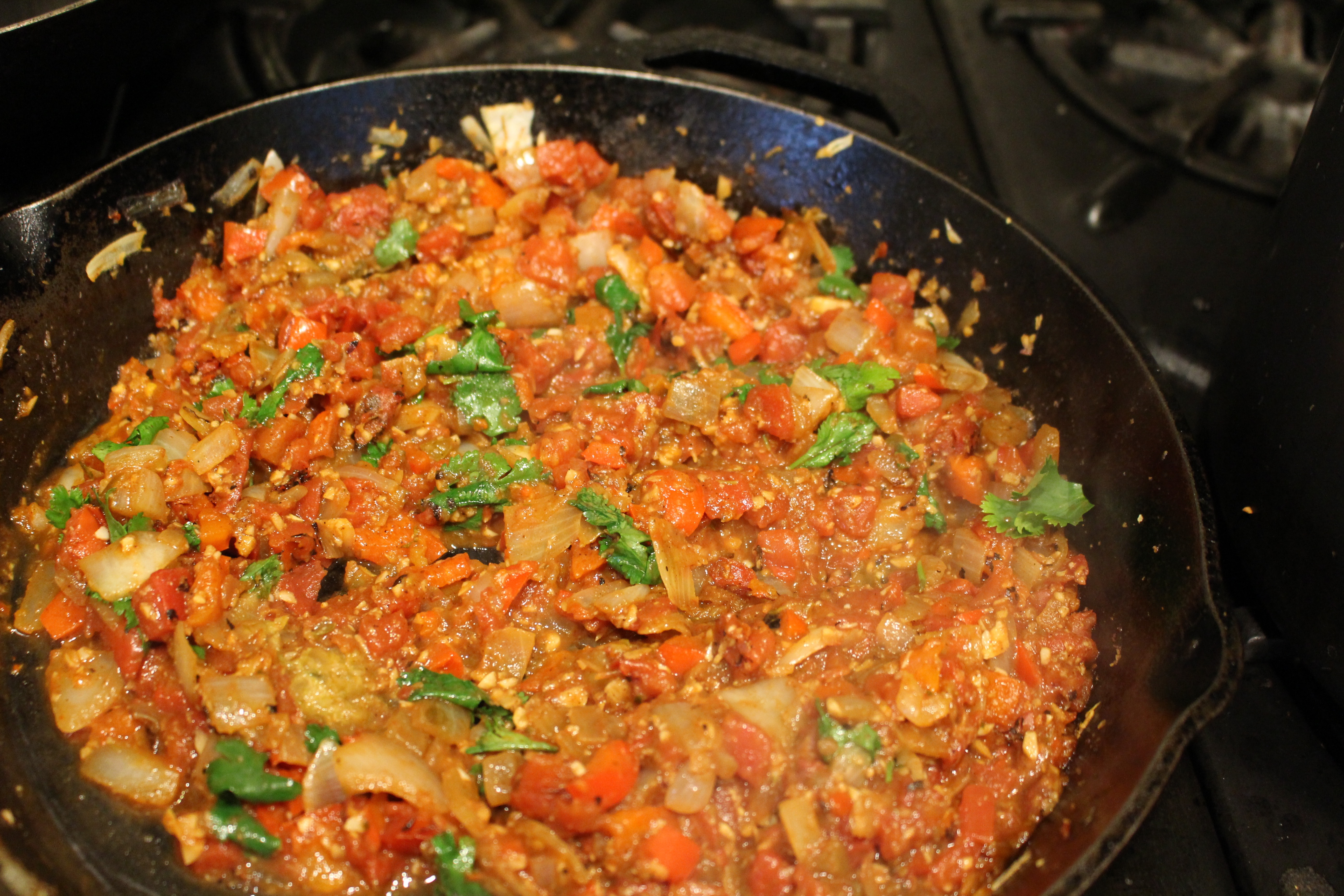 When soft add cumin and chili pepper, and sauté another few minutes. Then add canned tomatoes, chili peppers, and saute a few more minutes. Add 1/4 cup cilantro.
