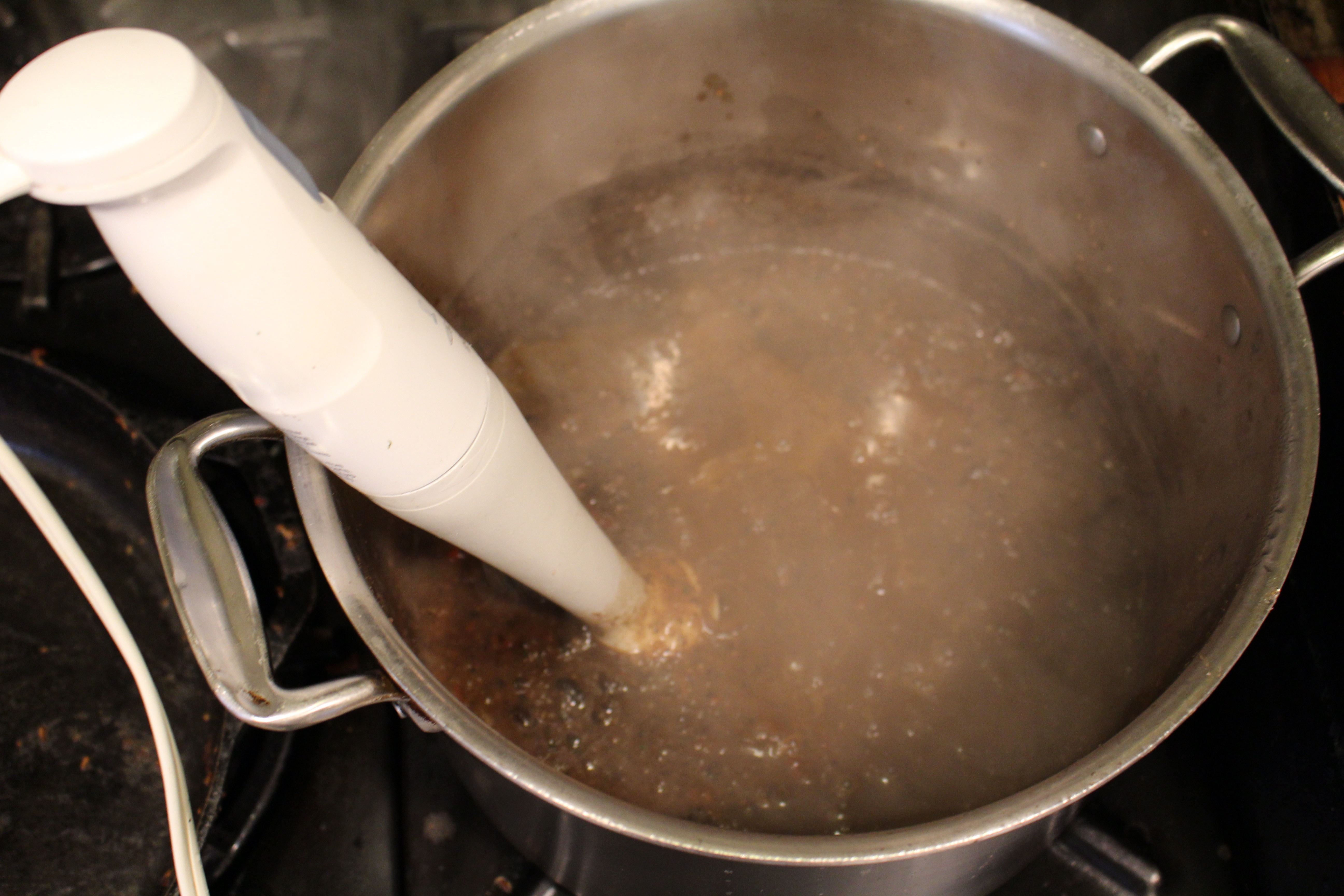 - When beans are done, add veggies and the juice of one lime to beans. Puree with either a handheld stick blender, directly into pot, or transfer to blender. Taste and adjust spices to your liking. Add some water if soup is too thick. Add more salt and cumin, if desired.