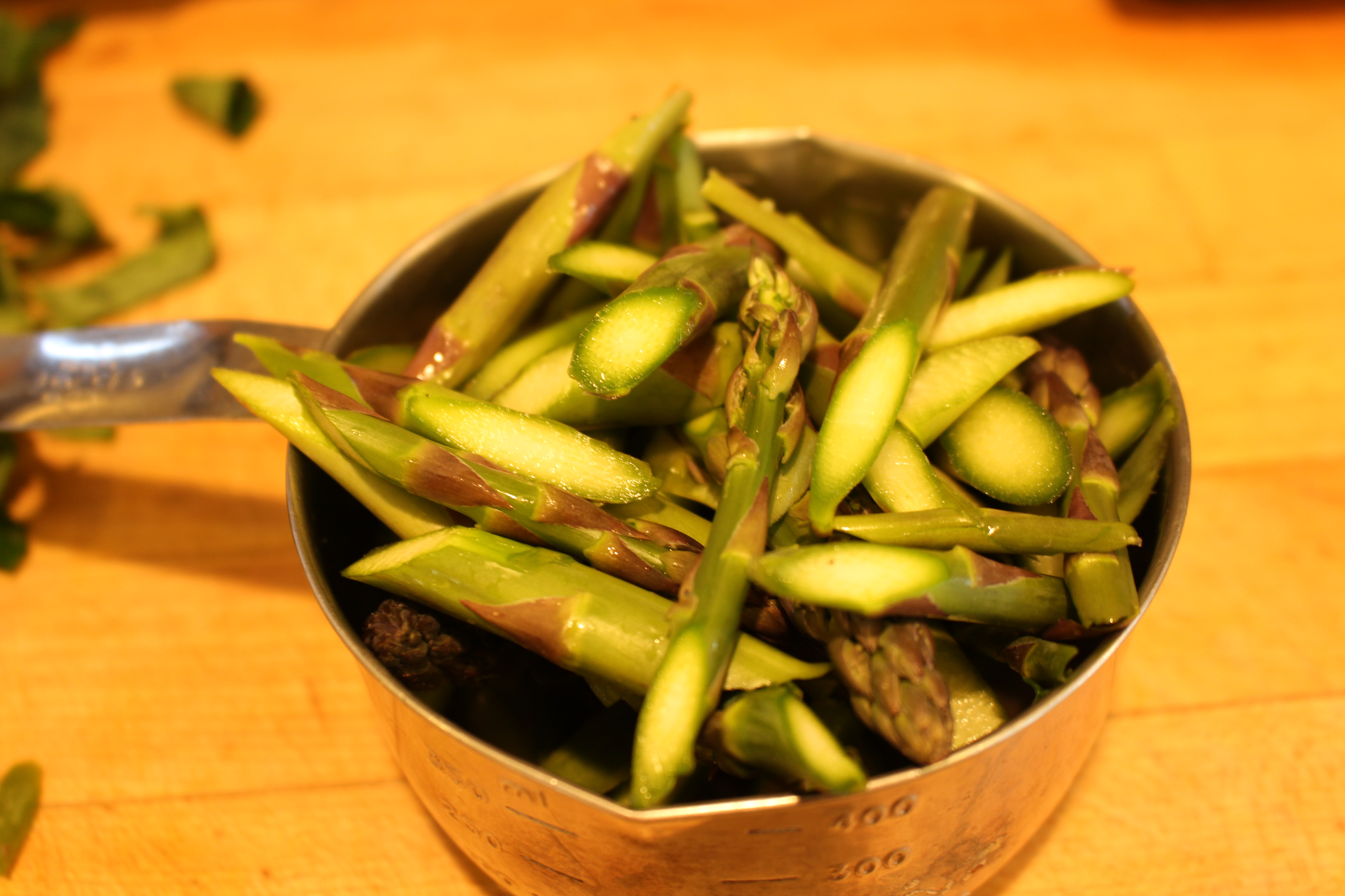 - Snap off bottoms of asparagus spears. Cut Asparagus into 2” pieces on the angle.