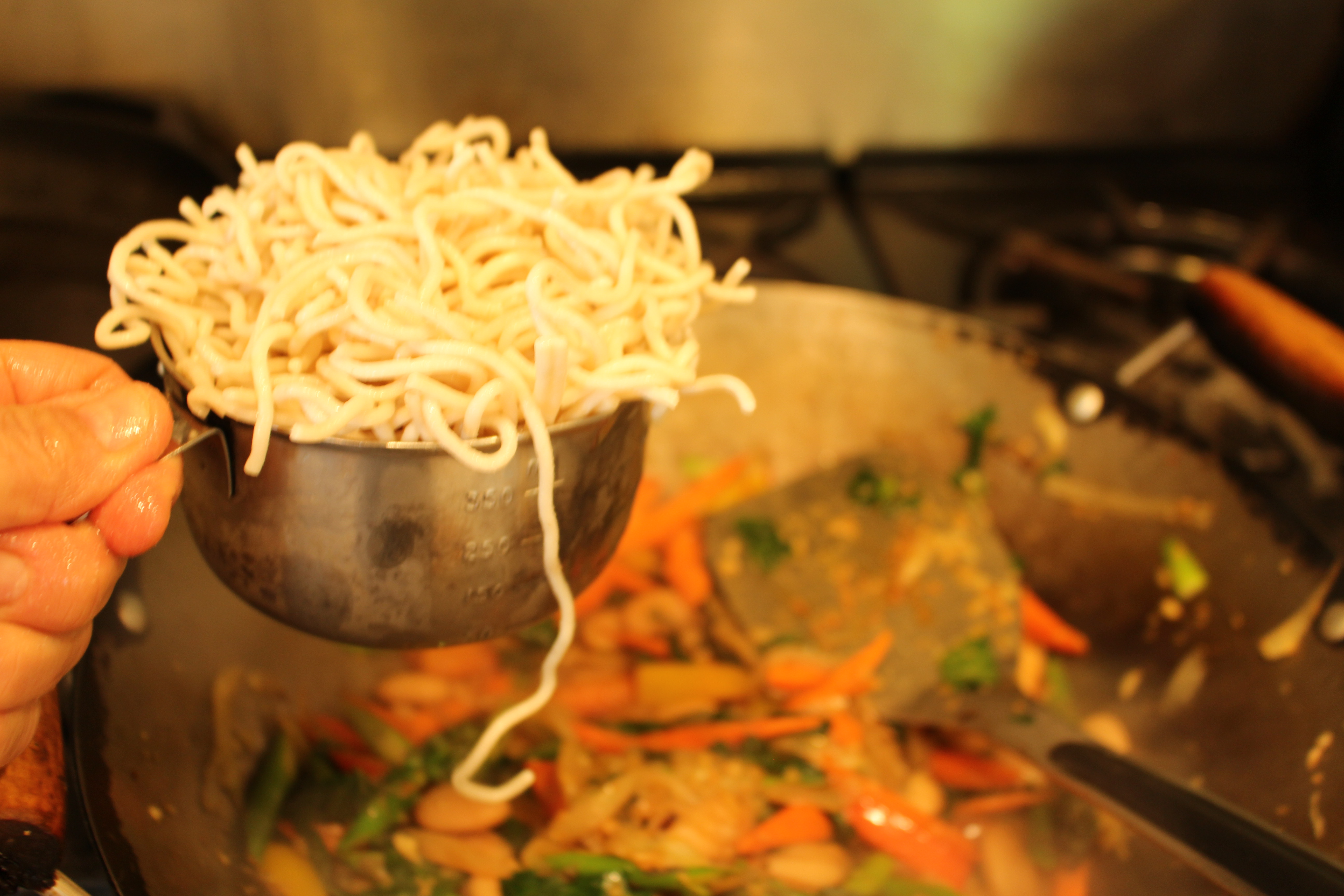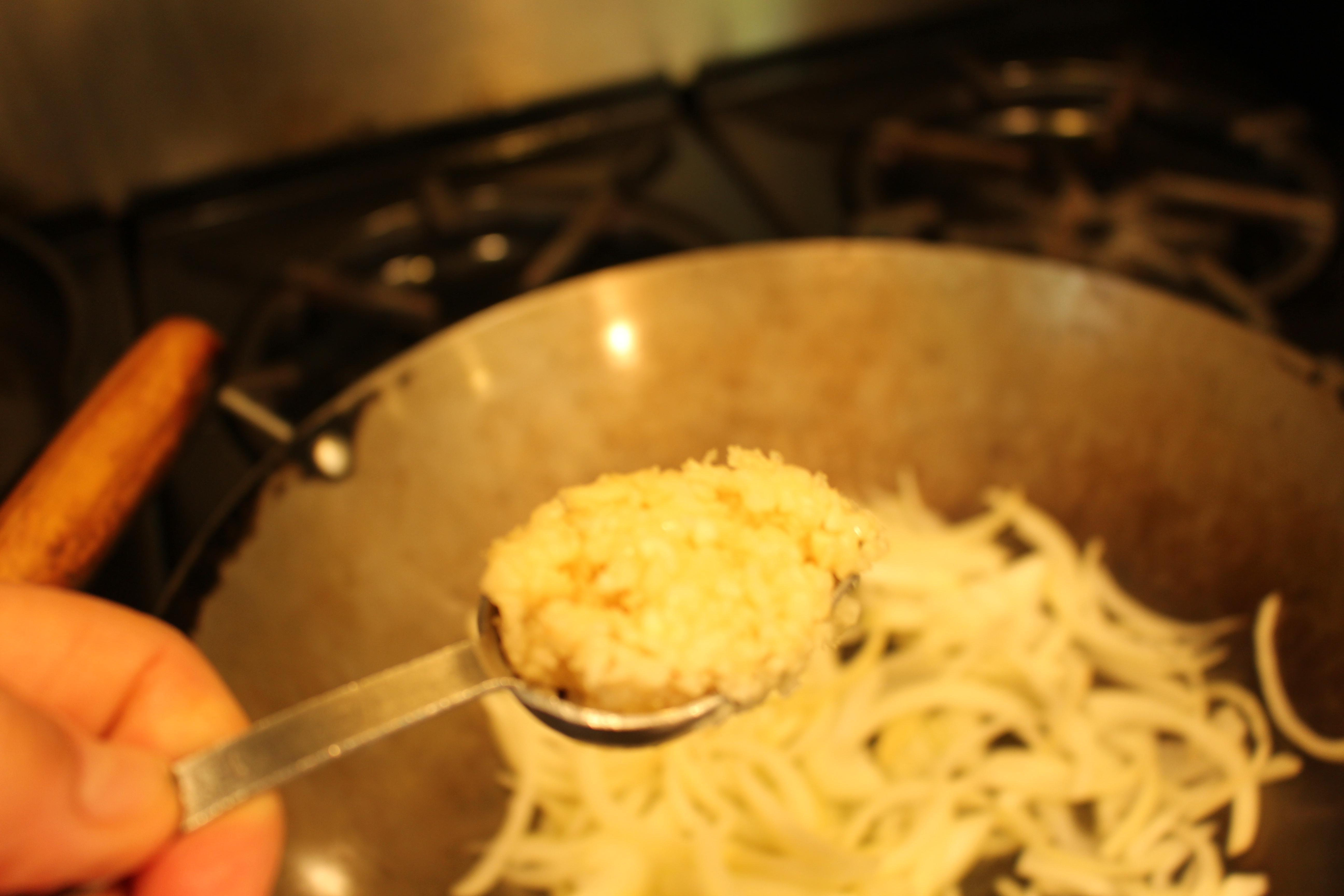 - In a wok or large sauté pan, sauté onions in the olive oil for 5 minutes. Add the ginger and garlic.